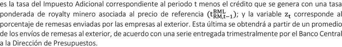 El porcentaje de utilidades del año anterior remesadas al extranjero se estimará a partir de un promedio de los envíos de remesas al exterior, de acuerdo a una serie entregada trimestralmente por el Banco Central a la Dirección de Presupuestos. De conformidad a lo anterior, el Ajuste Cíclico de los Ingresos por el Impuesto Adicional se calculará según la siguiente fórmula: