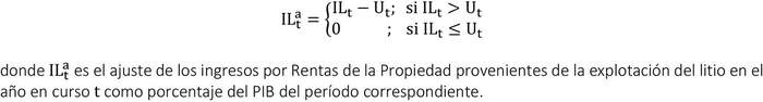 De esta manera, si los ingresos efectivos de Rentas de la Propiedad provenientes de la explotación del litio (IL), como porcentaje del PIB de dicho período, superan el umbral del litio (U), el ajuste cíclico corresponderá a la diferencia entre ambos, considerando como ingreso estructural ajustado solo el monto igual al umbral (U).