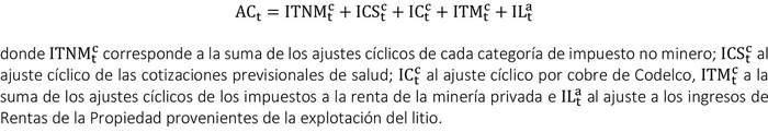 El Ajuste Cíclico Total de los ingresos del Gobierno Central consistirá en la suma de los ajustes cíclicos y el ajuste del litio antes descritos, determinándose en consecuencia según la siguiente fórmula: