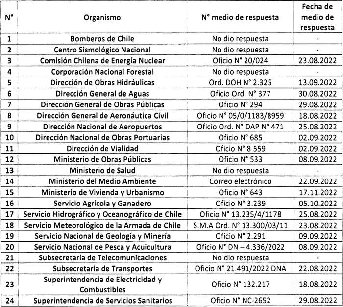 3. Que, acorde a lo dispuesto en el inciso primero del artículo 37 bis de la ley Nº 19.880, la entonces Oficina Nacional de Emergencia, del Ministerio del Interior y Seguridad Pública, a través de su Oficio Nº 904, de 2022, requirió informe a todos los órganos que, debido a la dictación del reglamento que por este acto se aprueba, pudiesen ver afectadas sus competencias, a fin de que emitieran su opinión respecto al contenido del mismo; órganos que remitieron sus respuestas de conformidad a la siguiente tabla, adjuntándose sus copias al presente decreto.