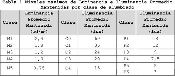 Las clases de alumbrado señaladas en la Tabla 1 son aquellas definidas en el Decreto Supremo Nº 2, de 2014, que aprueba reglamento de alumbrado público de vías de tránsito vehicular, y en el Decreto Supremo Nº 51, de 2015, que aprueba reglamento de alumbrado público de bienes nacionales de uso público destinados al tránsito peatonal, ambos del Ministerio de Energía, o aquellos que los reemplacen.