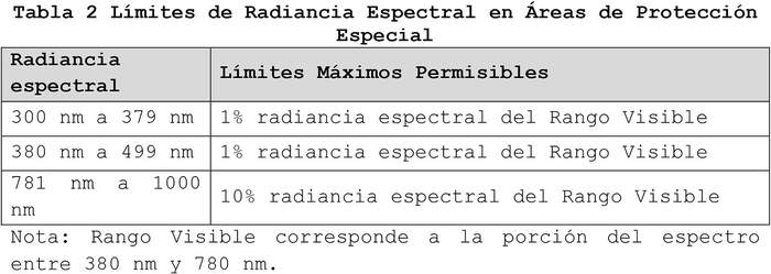 3.1. En las Áreas de Protección Especial, las luminarias, no podrán exceder los valores de la Tabla 2.