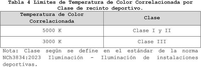 3. Temperatura de color correlacionada: Las luminarias utilizadas para recintos deportivos y recreacionales no podrán contar con temperaturas de color correlacionada superiores a las indicadas en la Tabla 4.