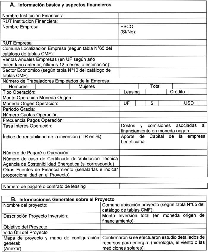 La información reportada dependerá del tipo de financiamiento del que se trate. A modo de ejemplo: i) para financiamientos de proyectos de electromovilidad, deberá corresponder a la información agregada del total de vehículos del mismo tipo que se esté financiando; ii) para financiamientos de proyectos de instalación de paneles fotovoltaicos, deberá corresponder a la información agregada de paneles por cada recinto industrial o comercial en que se instalen.