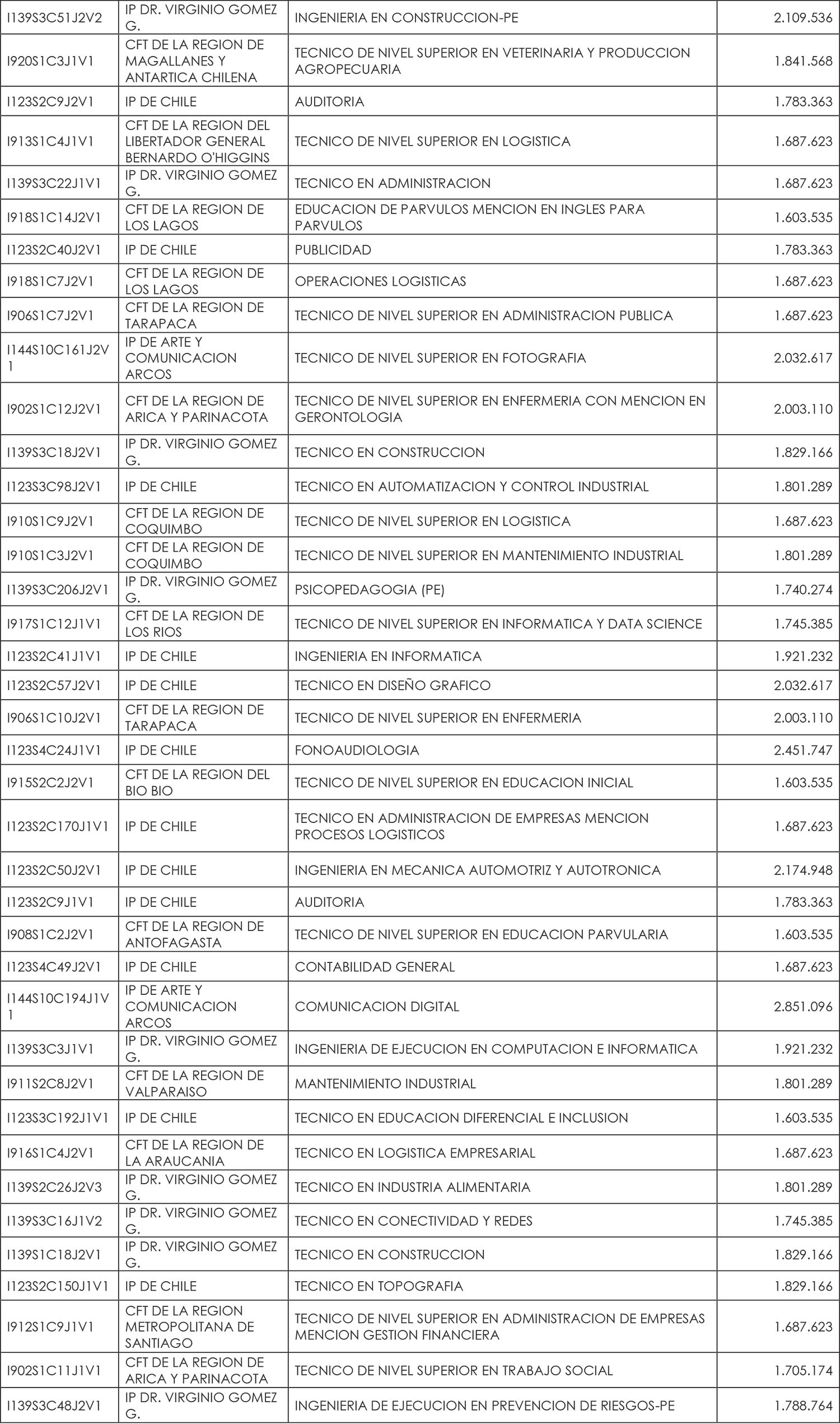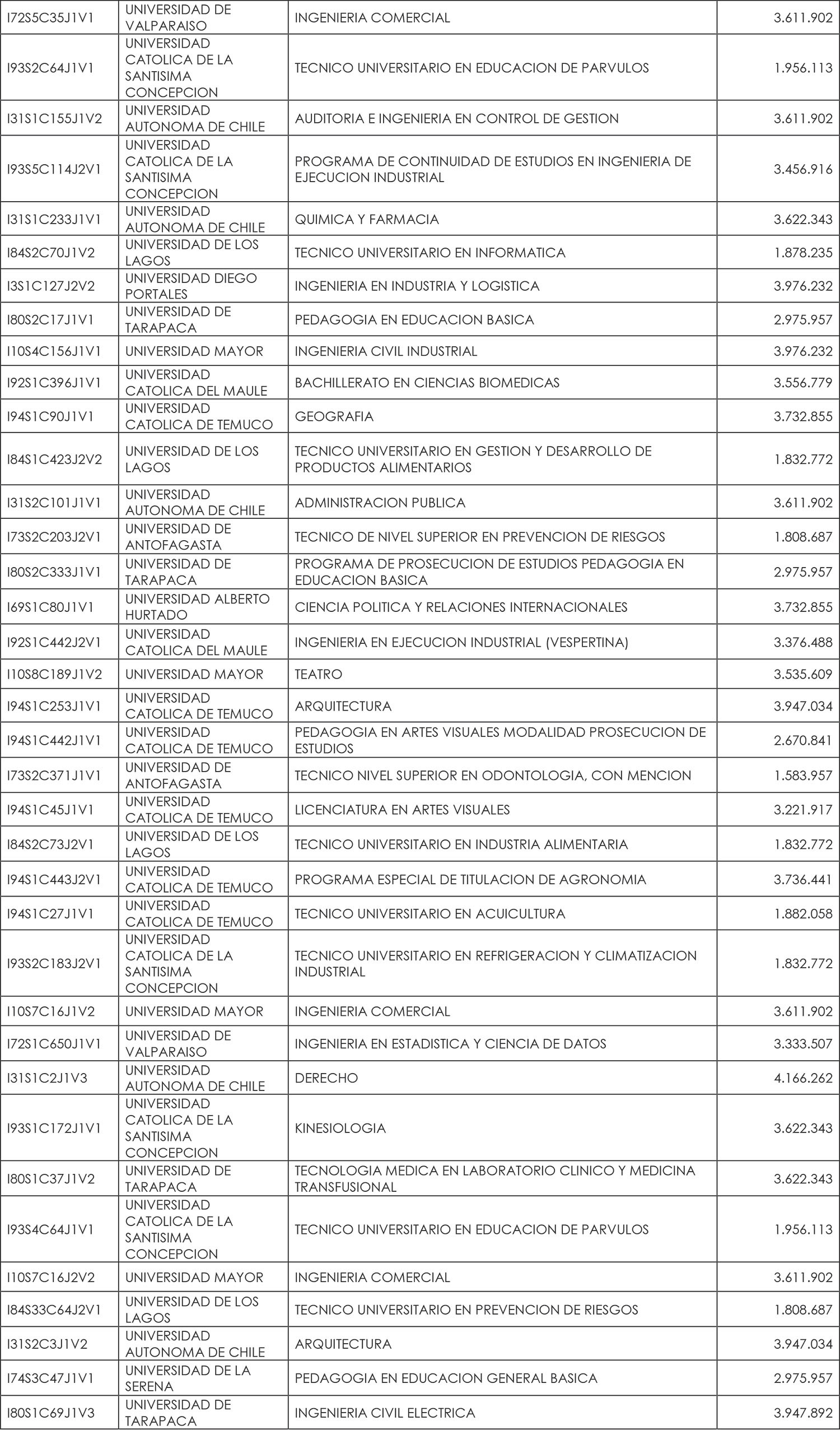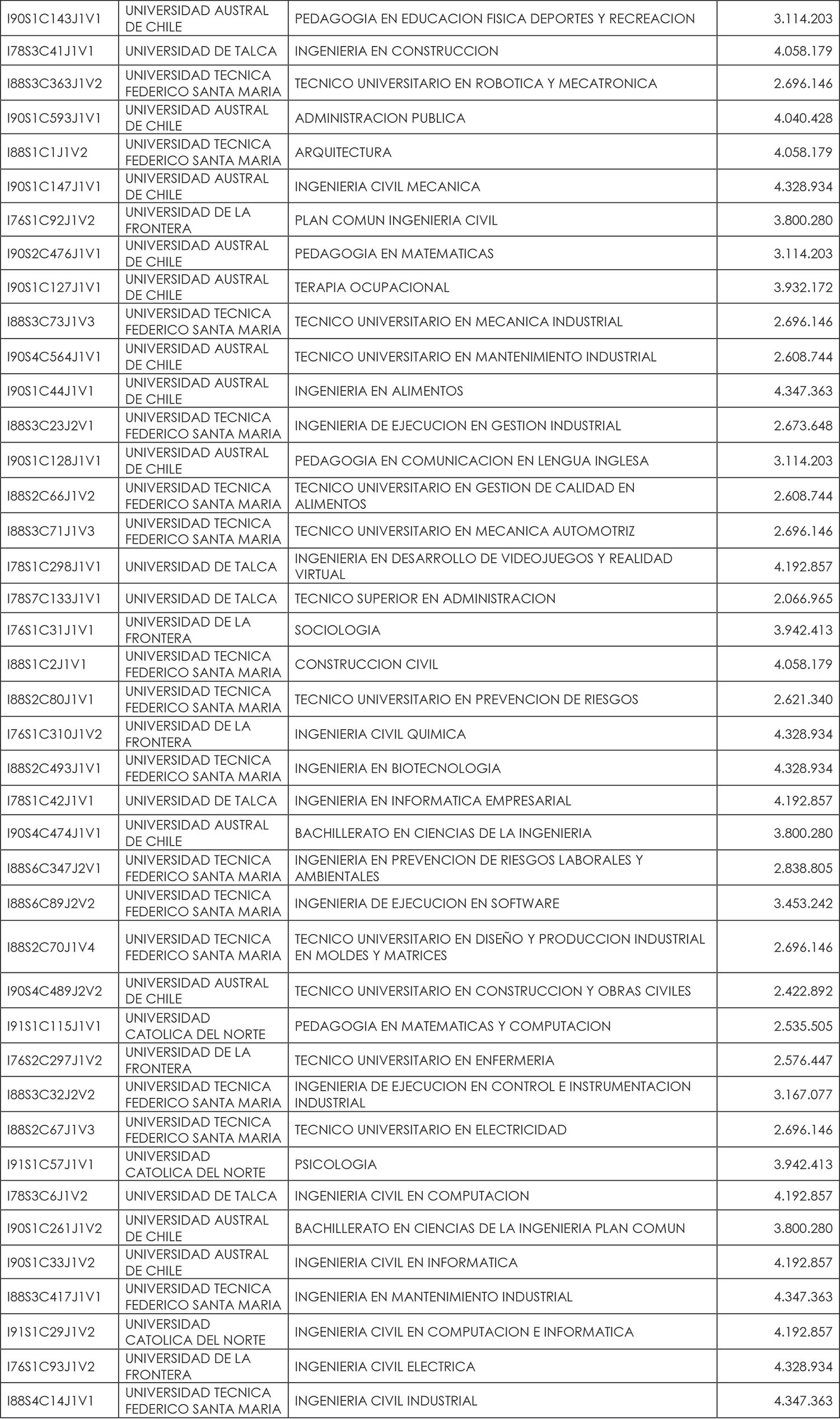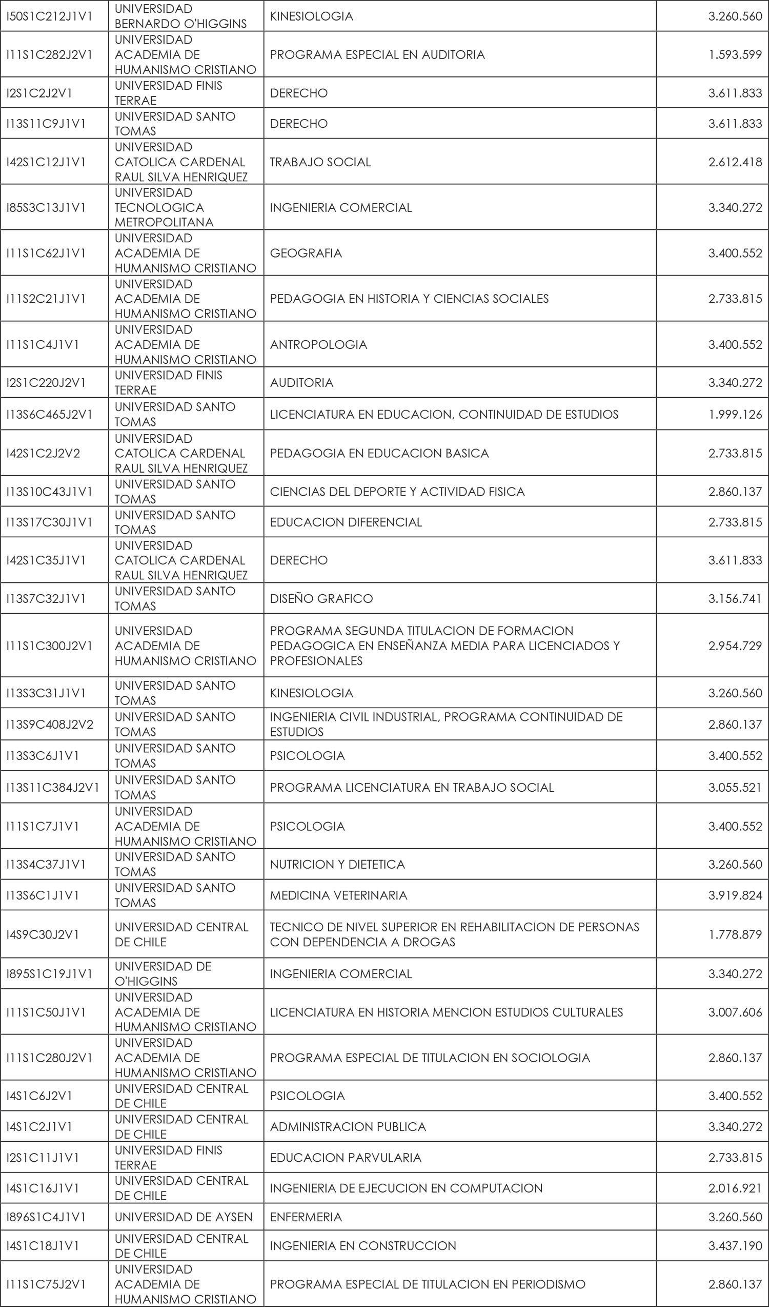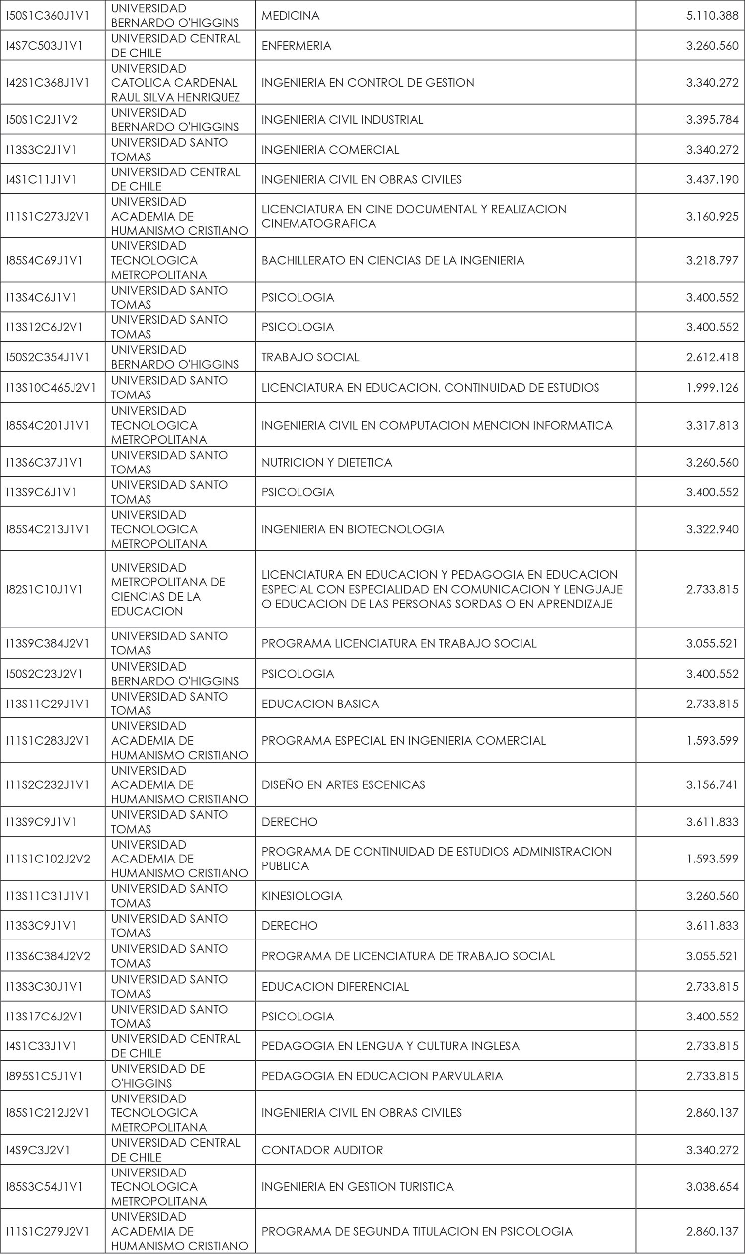 "Fíjase el arancel regulado para los programas impartidos por las Instituciones de Educación Superior adscritas a gratuidad, de conformidad al contenido de la siguiente tabla: