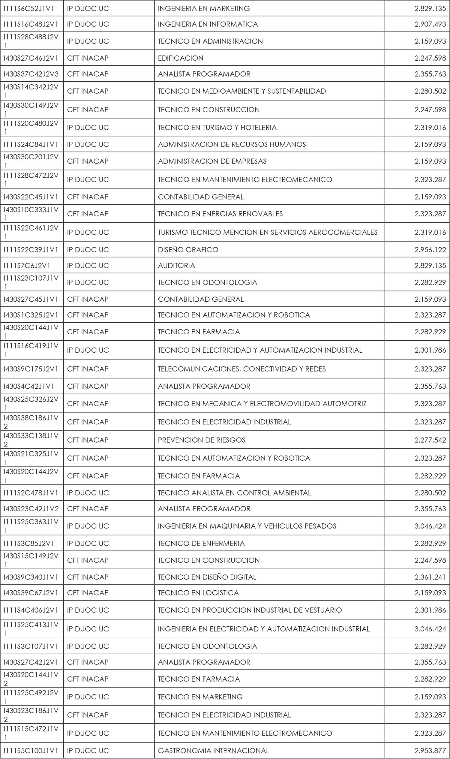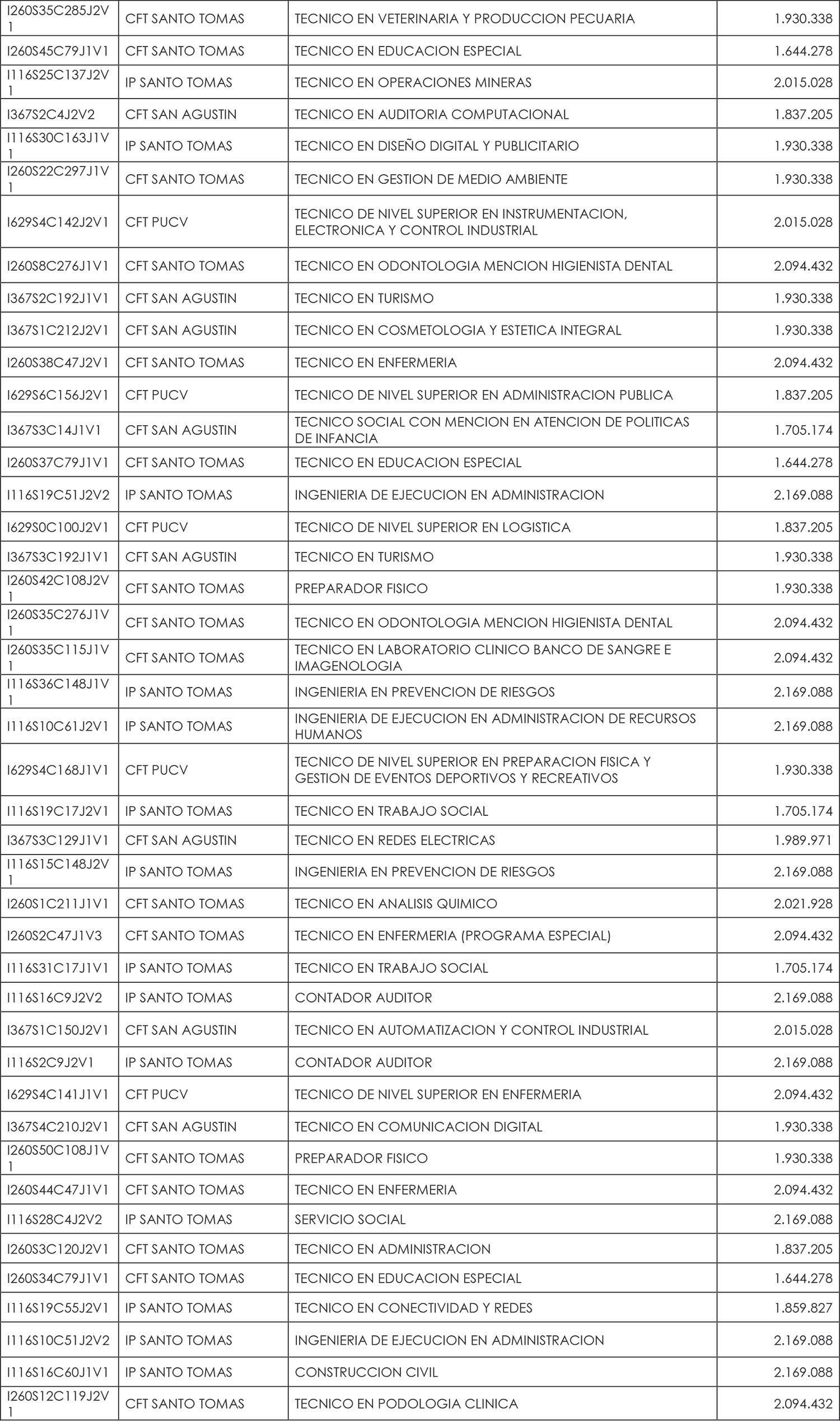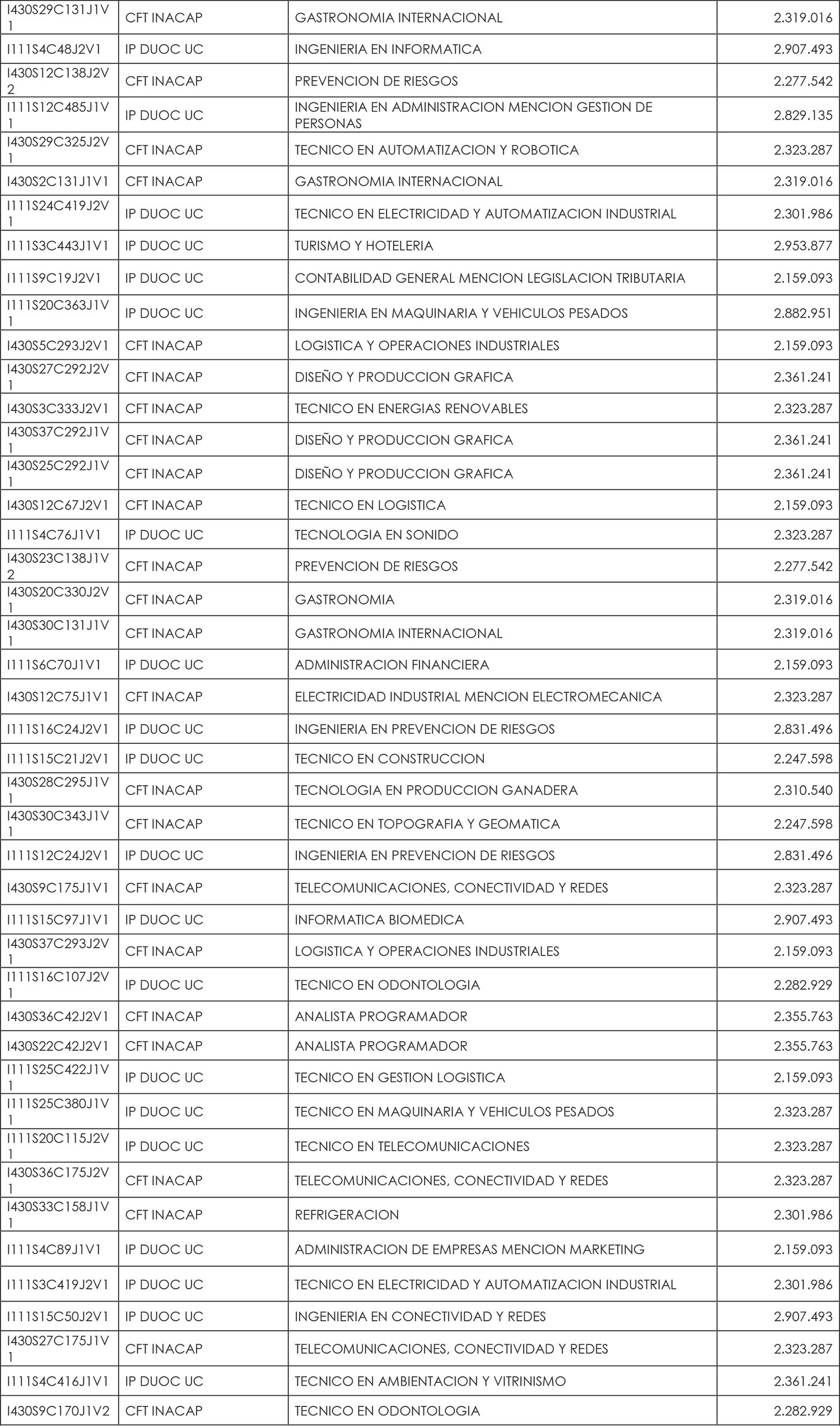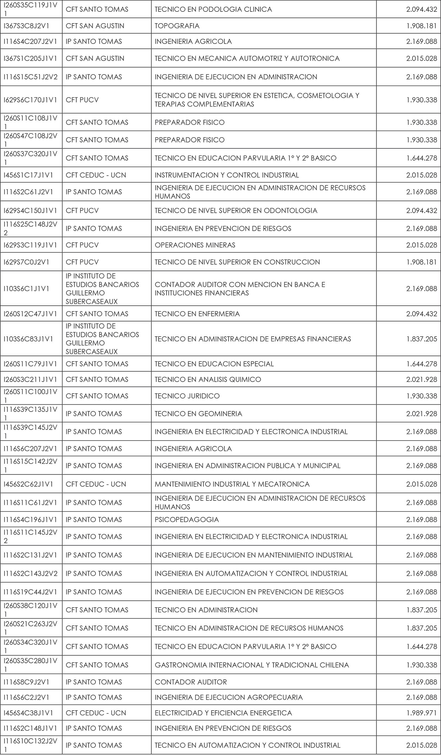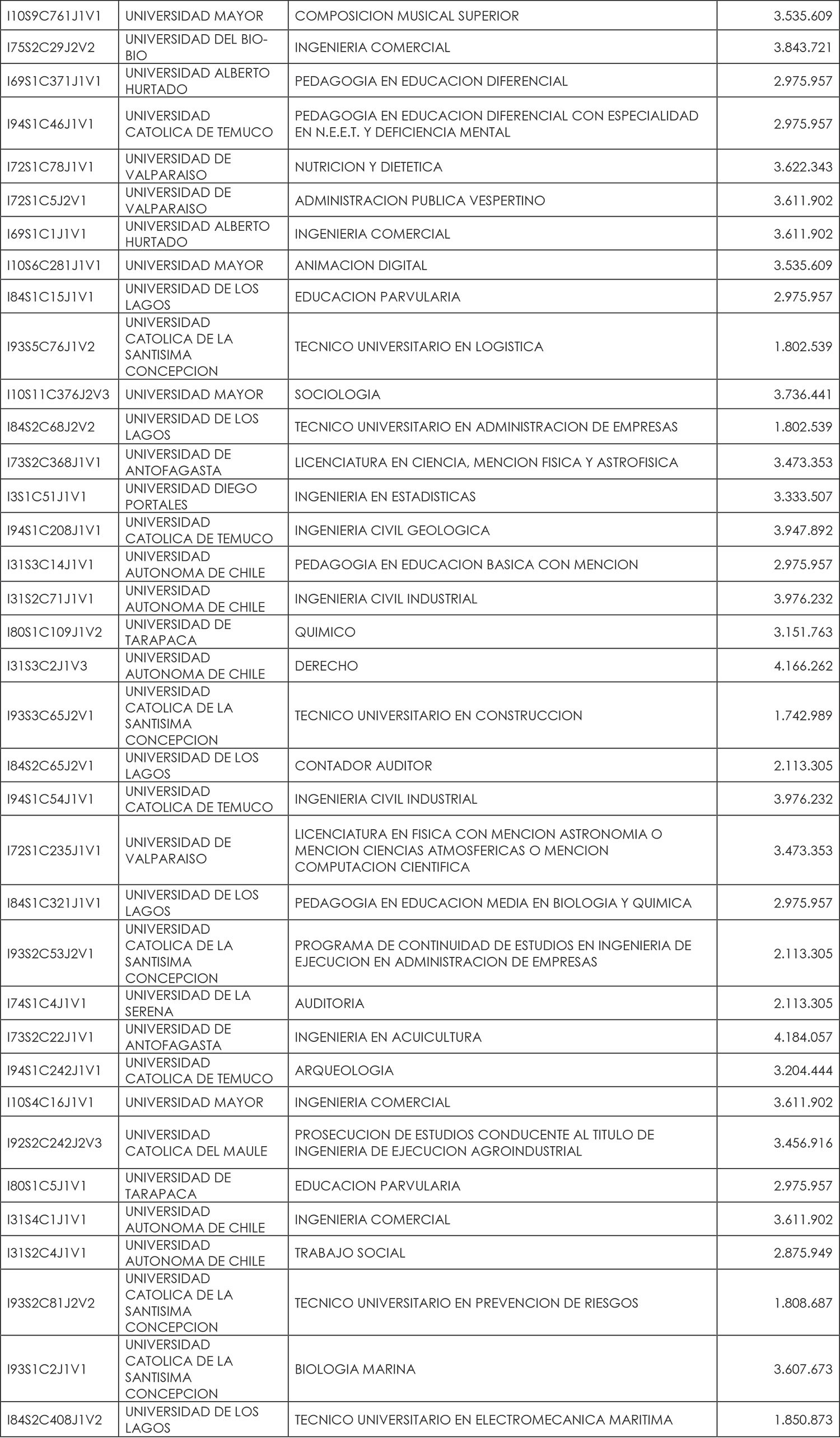 "Fíjase el arancel regulado para los programas impartidos por las Instituciones de Educación Superior adscritas a gratuidad, de conformidad al contenido de la siguiente tabla: