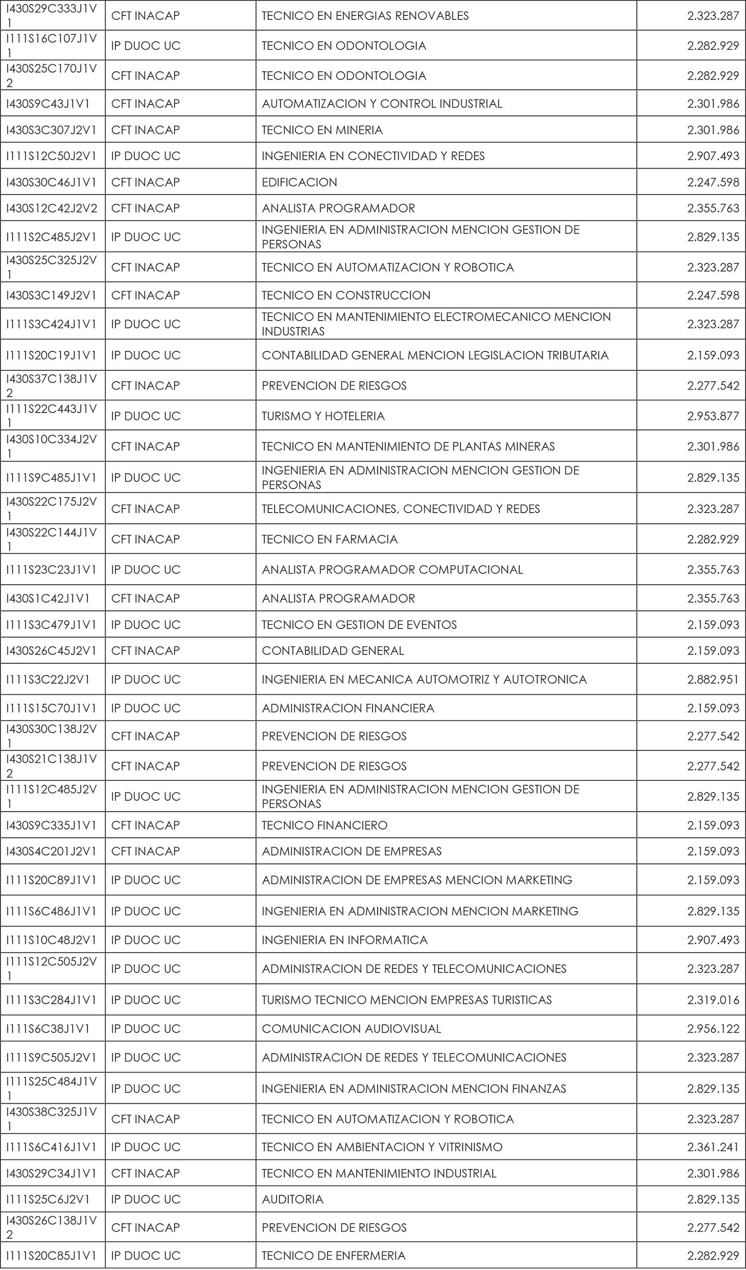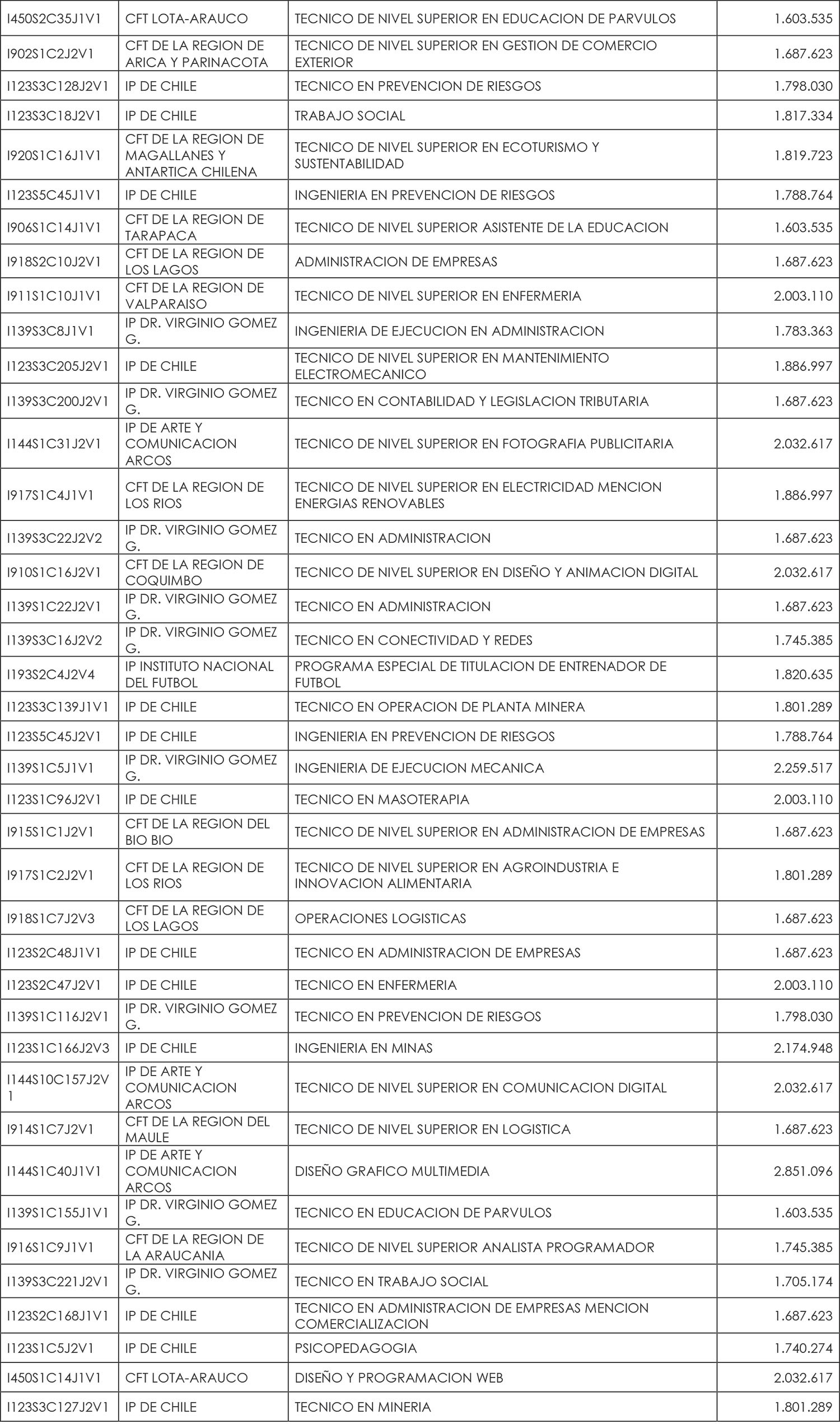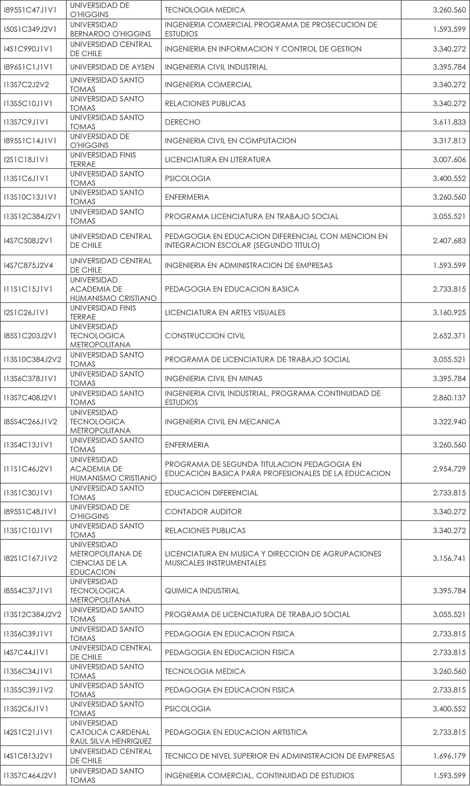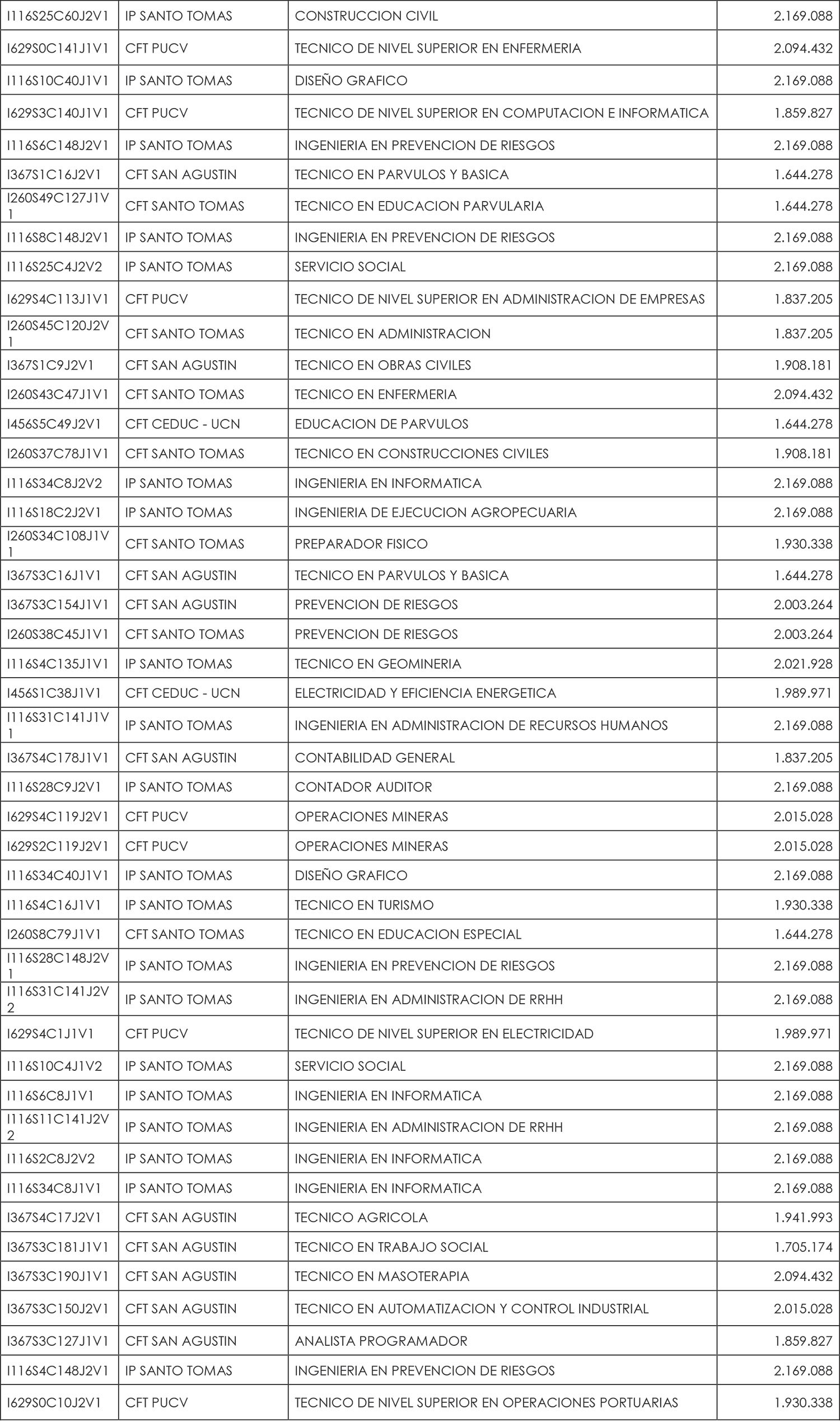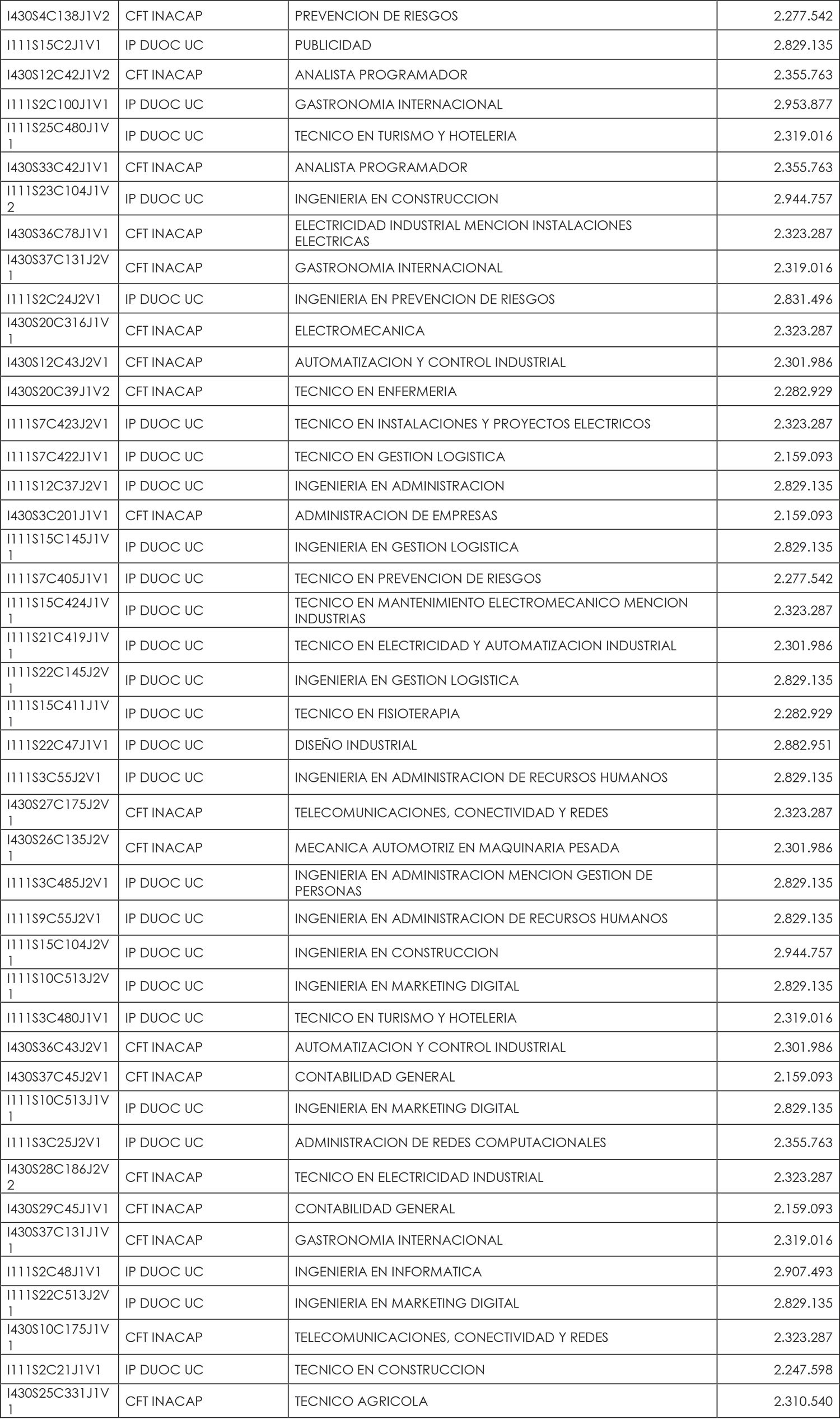 "Fíjase el arancel regulado para los programas impartidos por las Instituciones de Educación Superior adscritas a gratuidad, de conformidad al contenido de la siguiente tabla: