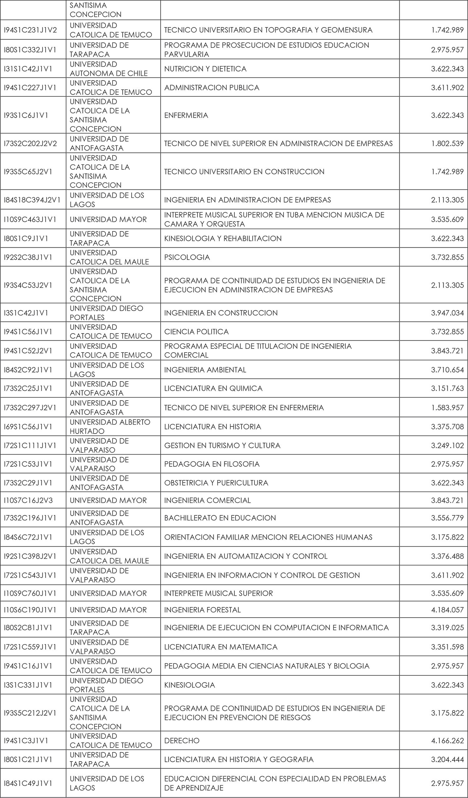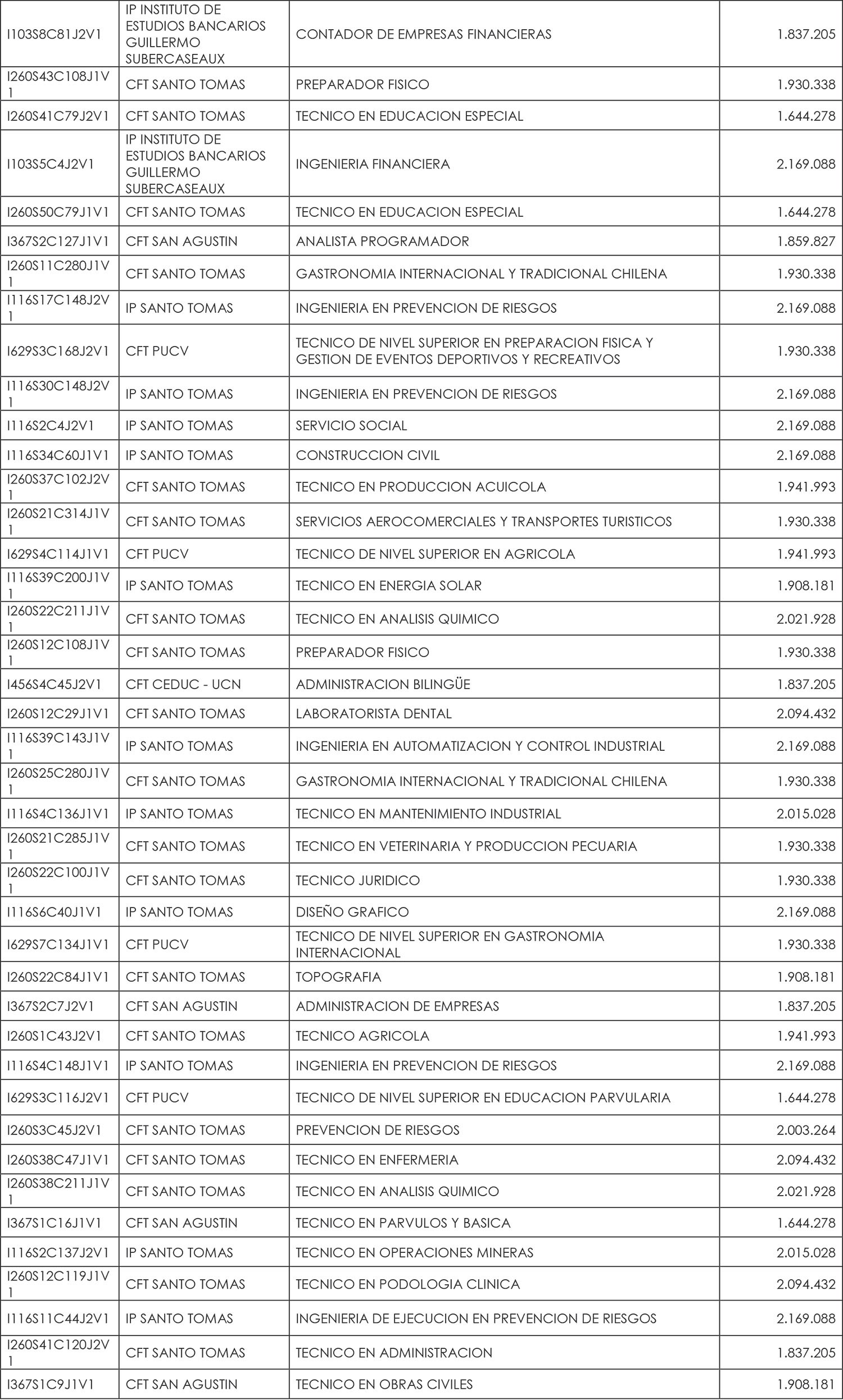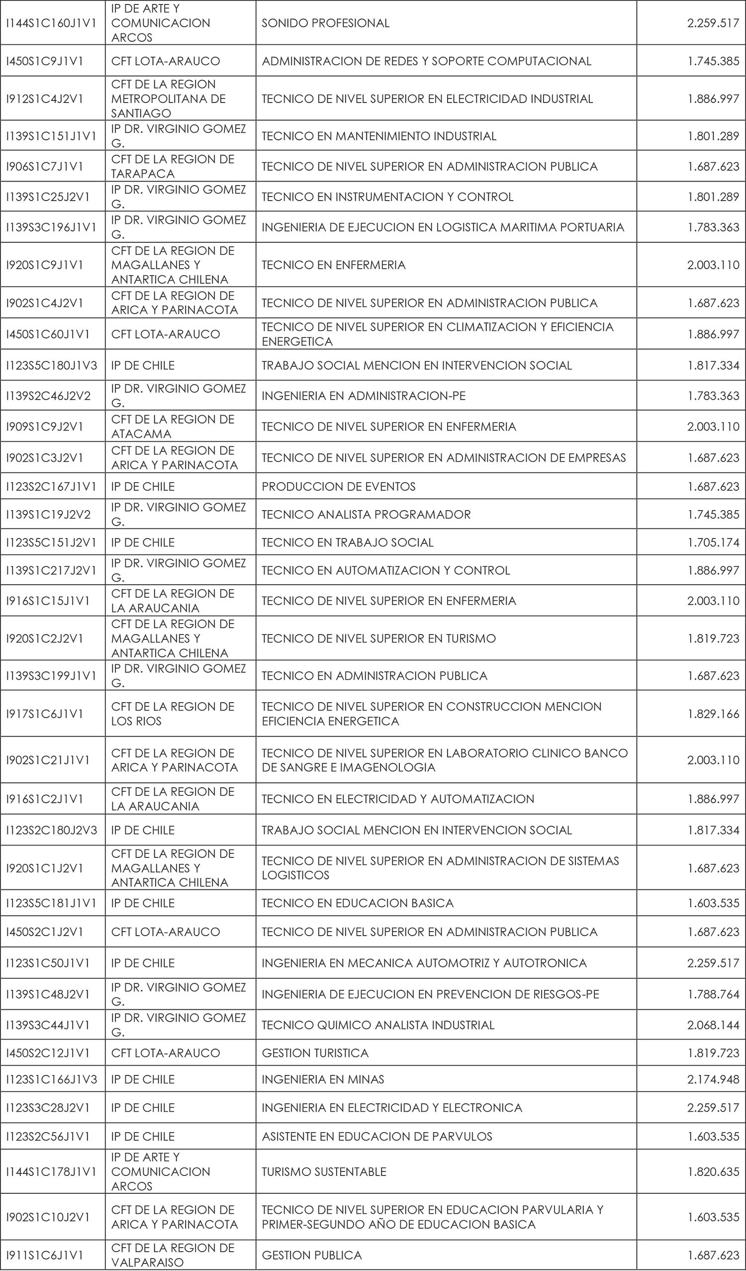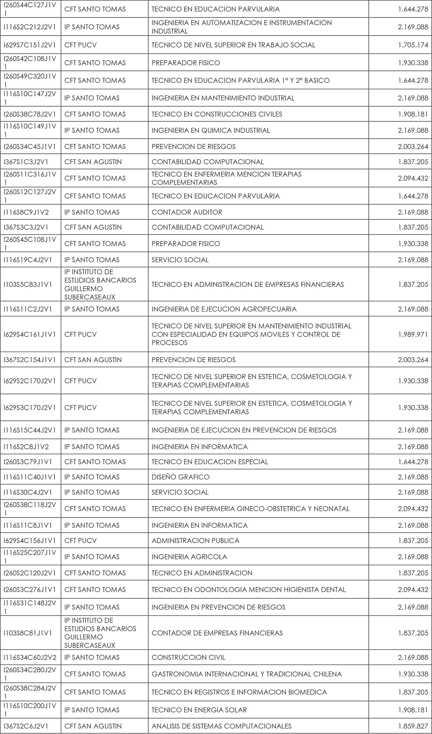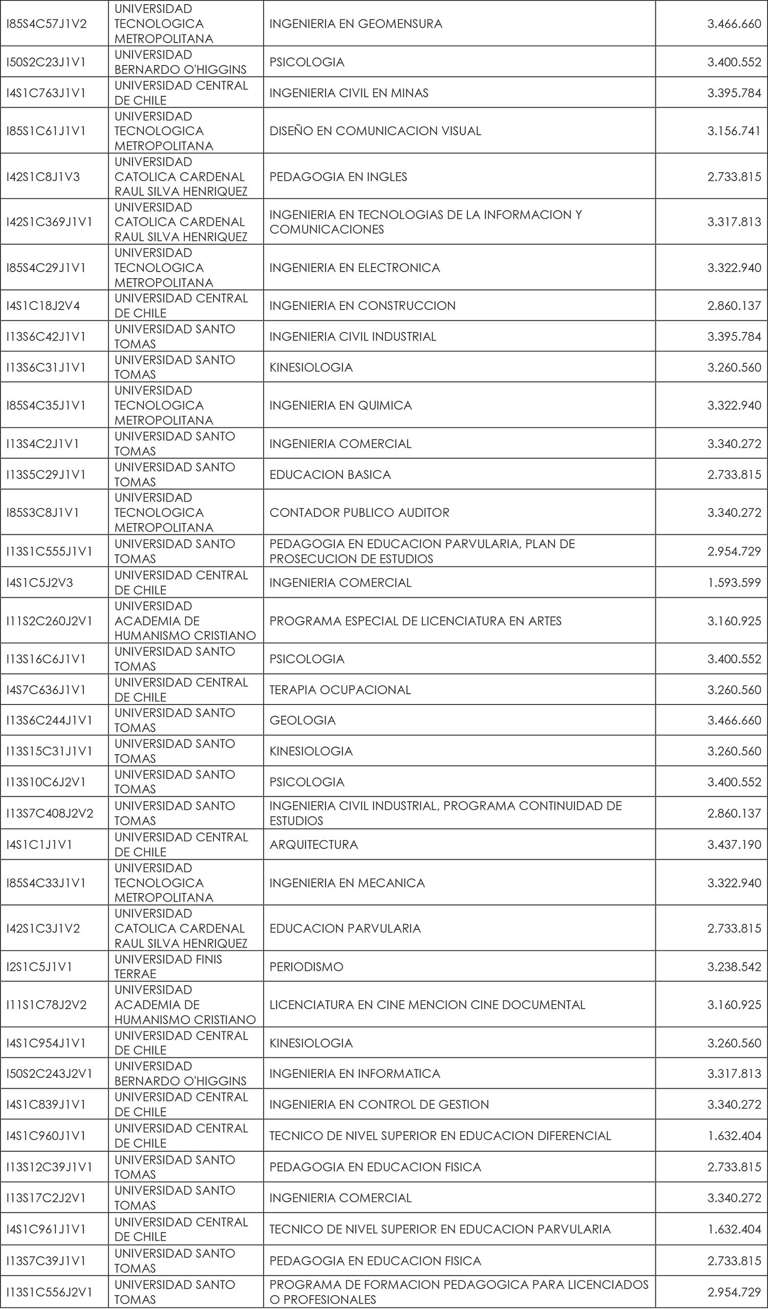 "Fíjase el arancel regulado para los programas impartidos por las Instituciones de Educación Superior adscritas a gratuidad, de conformidad al contenido de la siguiente tabla: