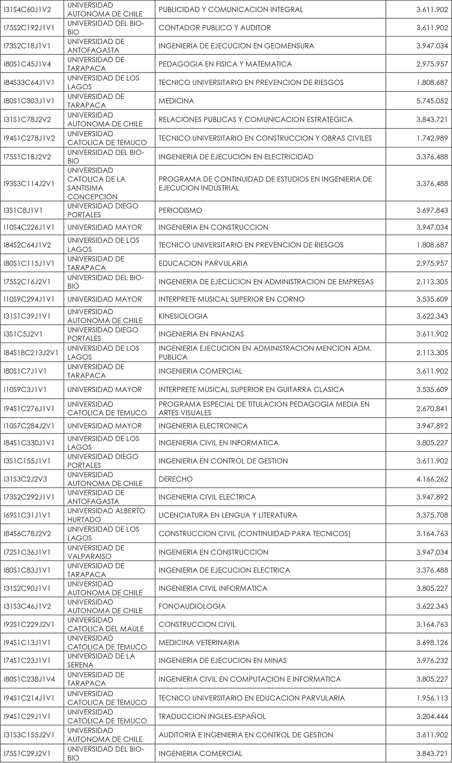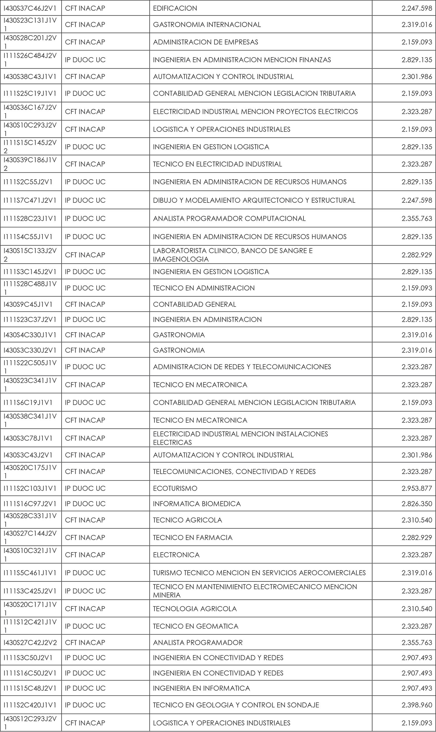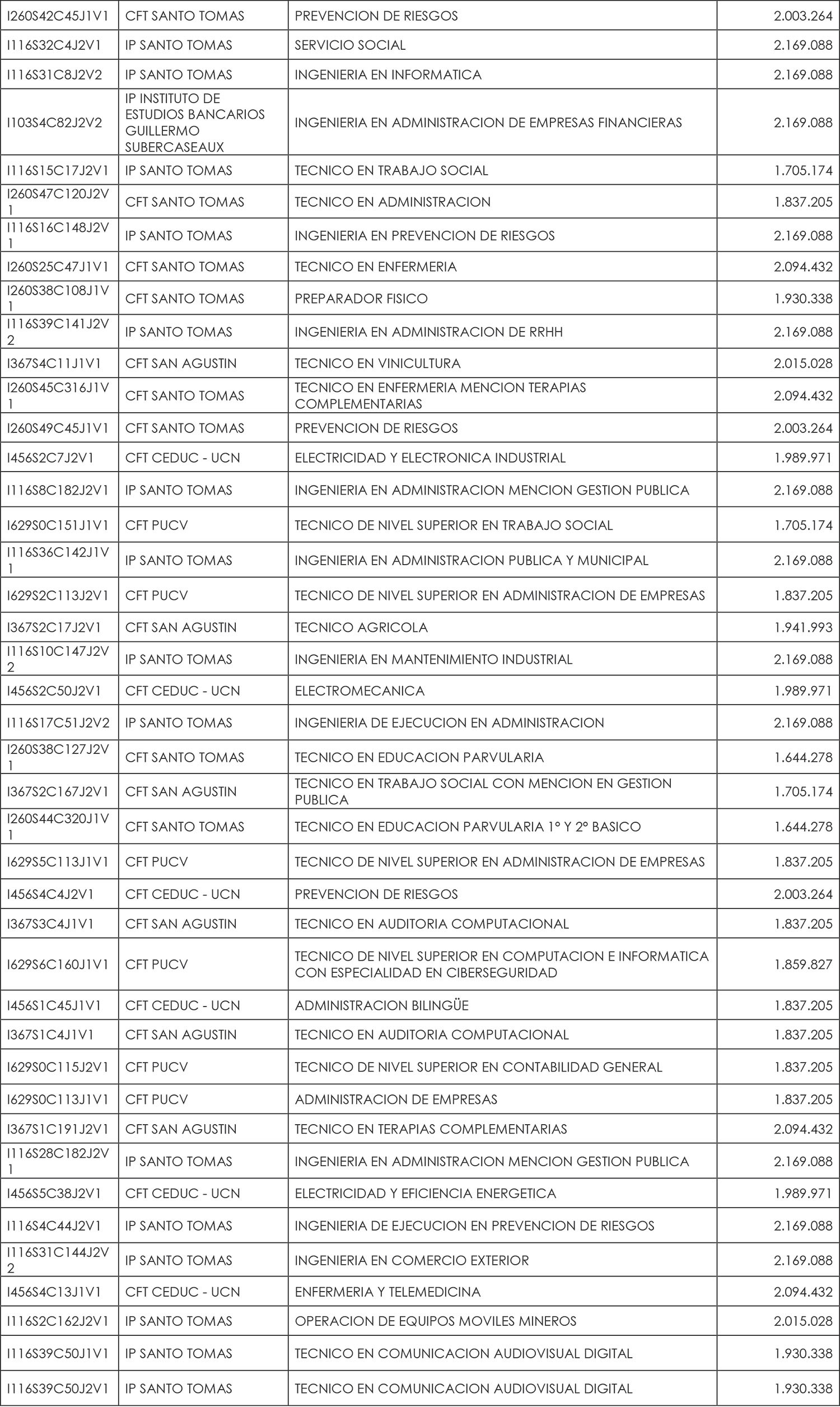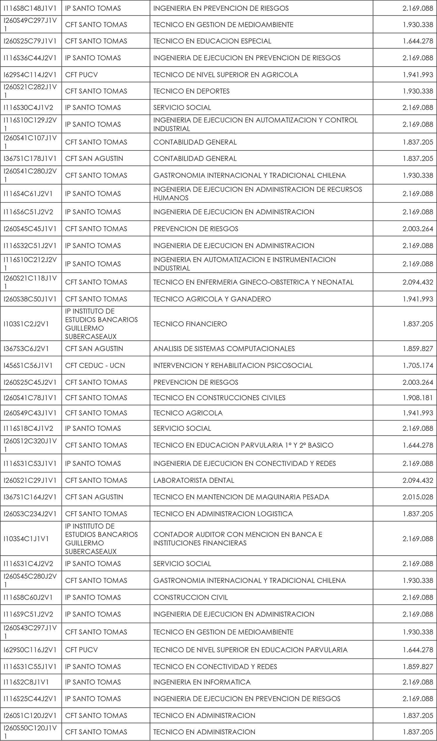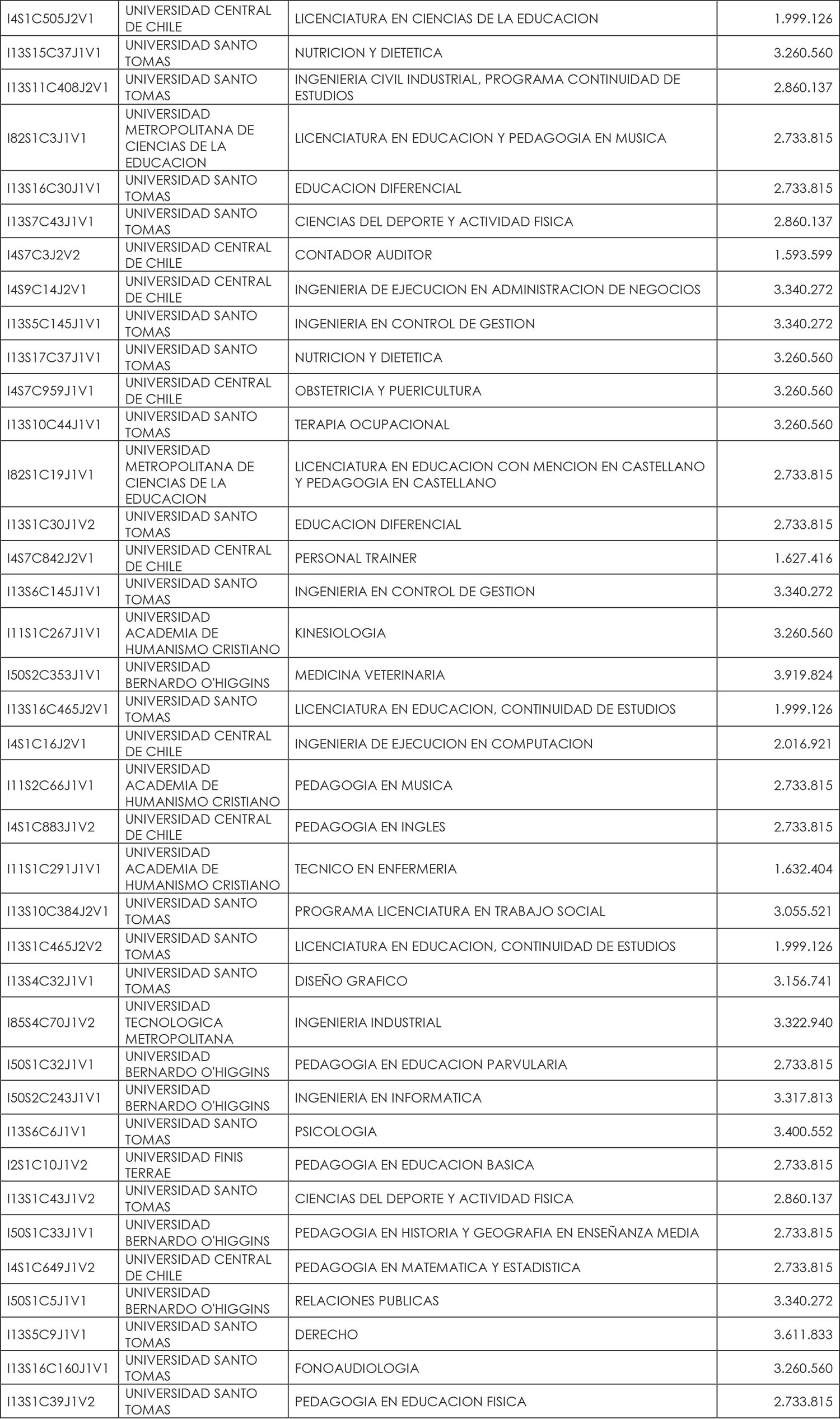 "Fíjase el arancel regulado para los programas impartidos por las Instituciones de Educación Superior adscritas a gratuidad, de conformidad al contenido de la siguiente tabla: