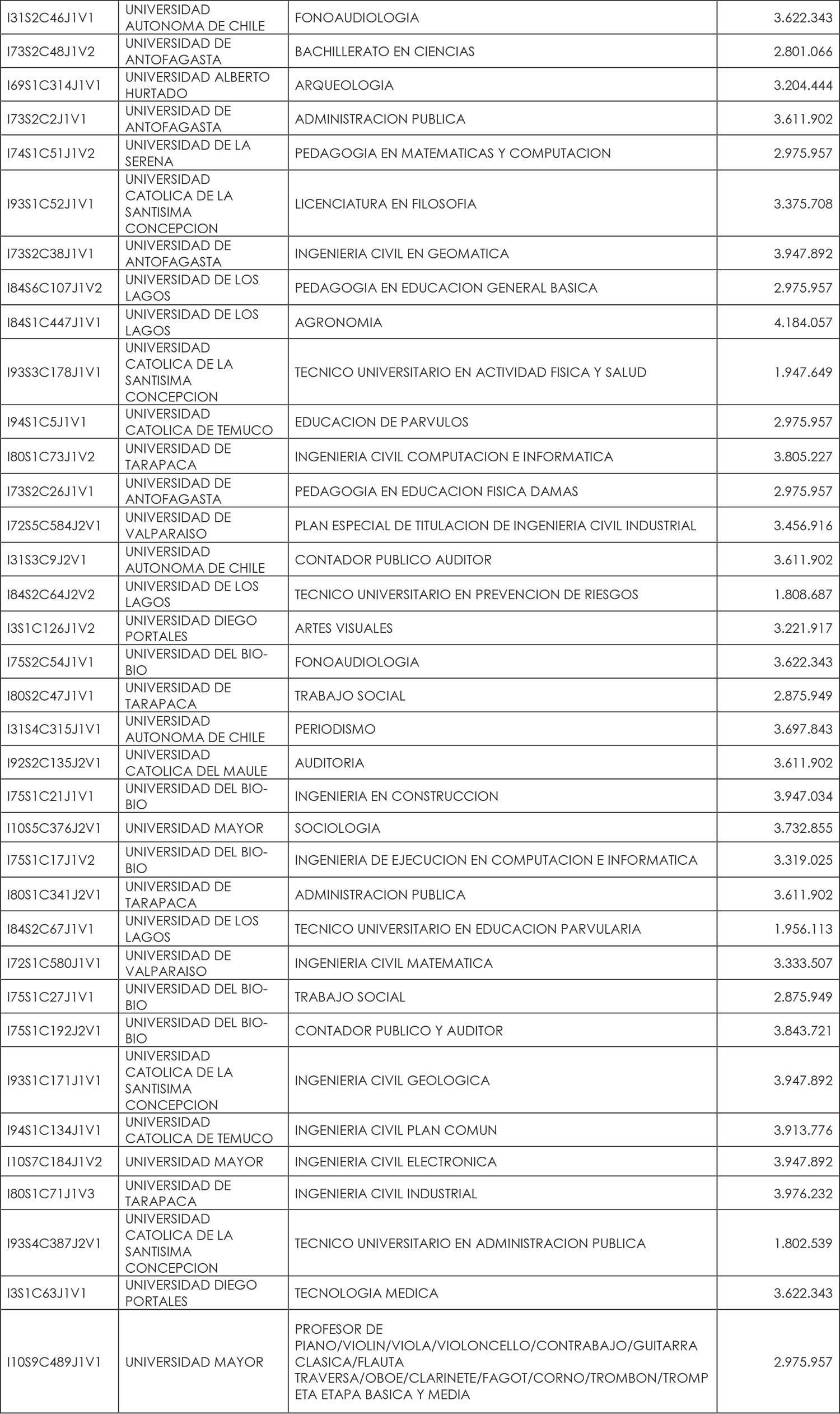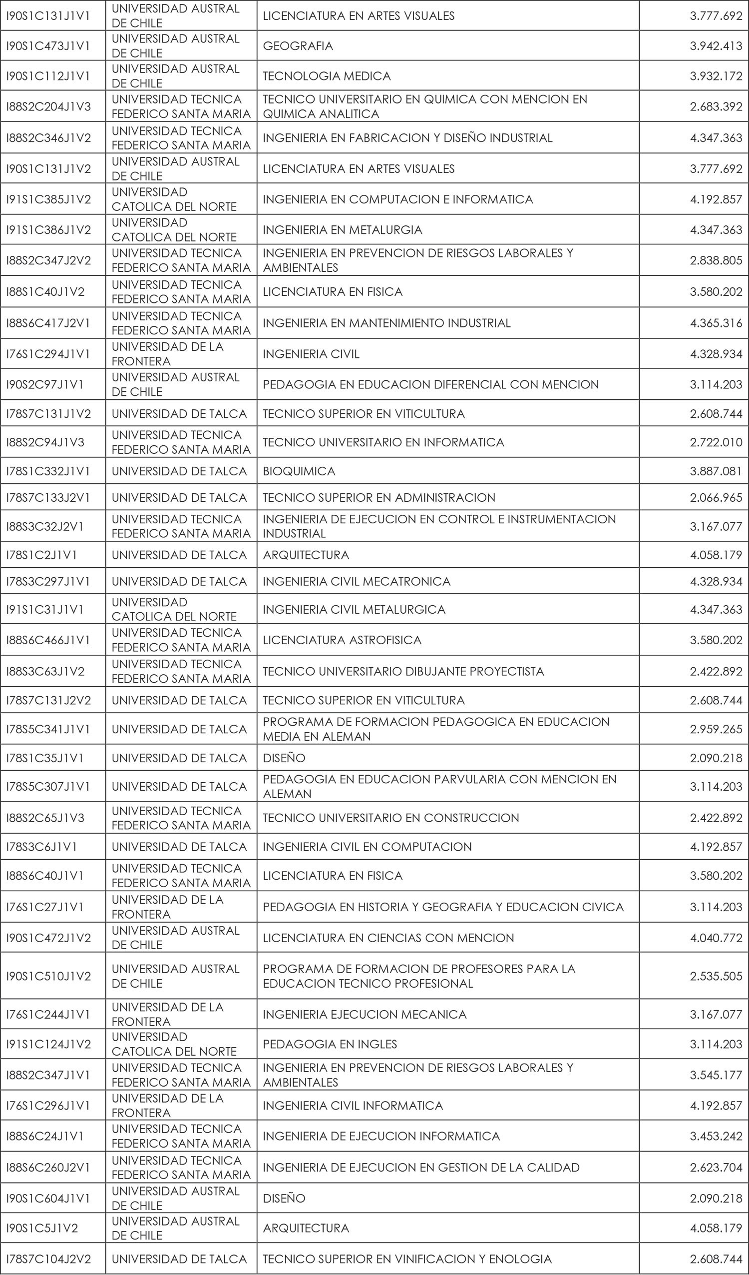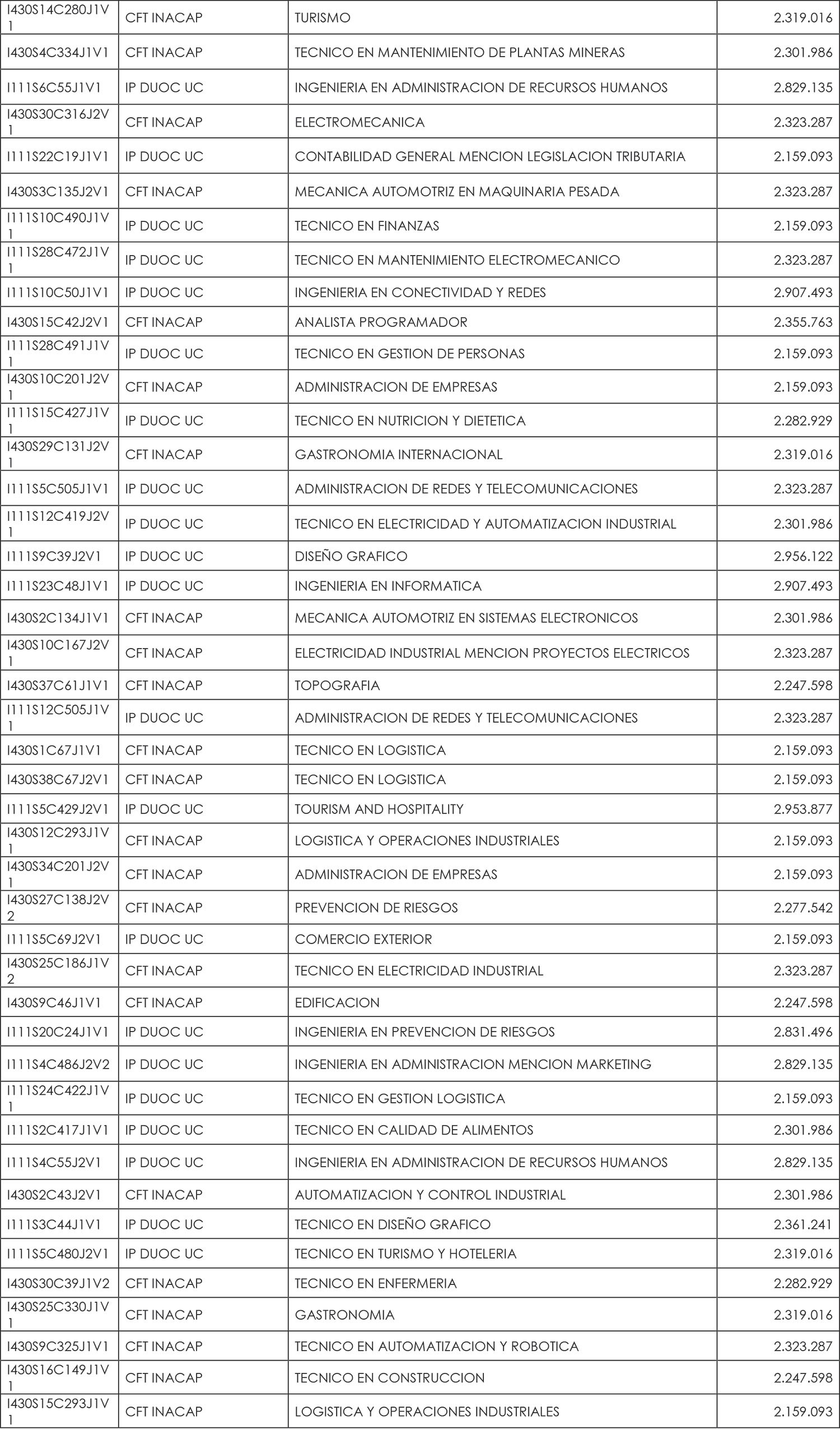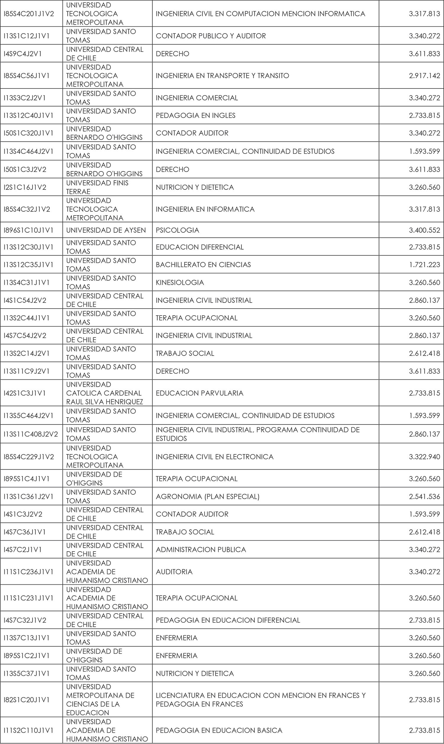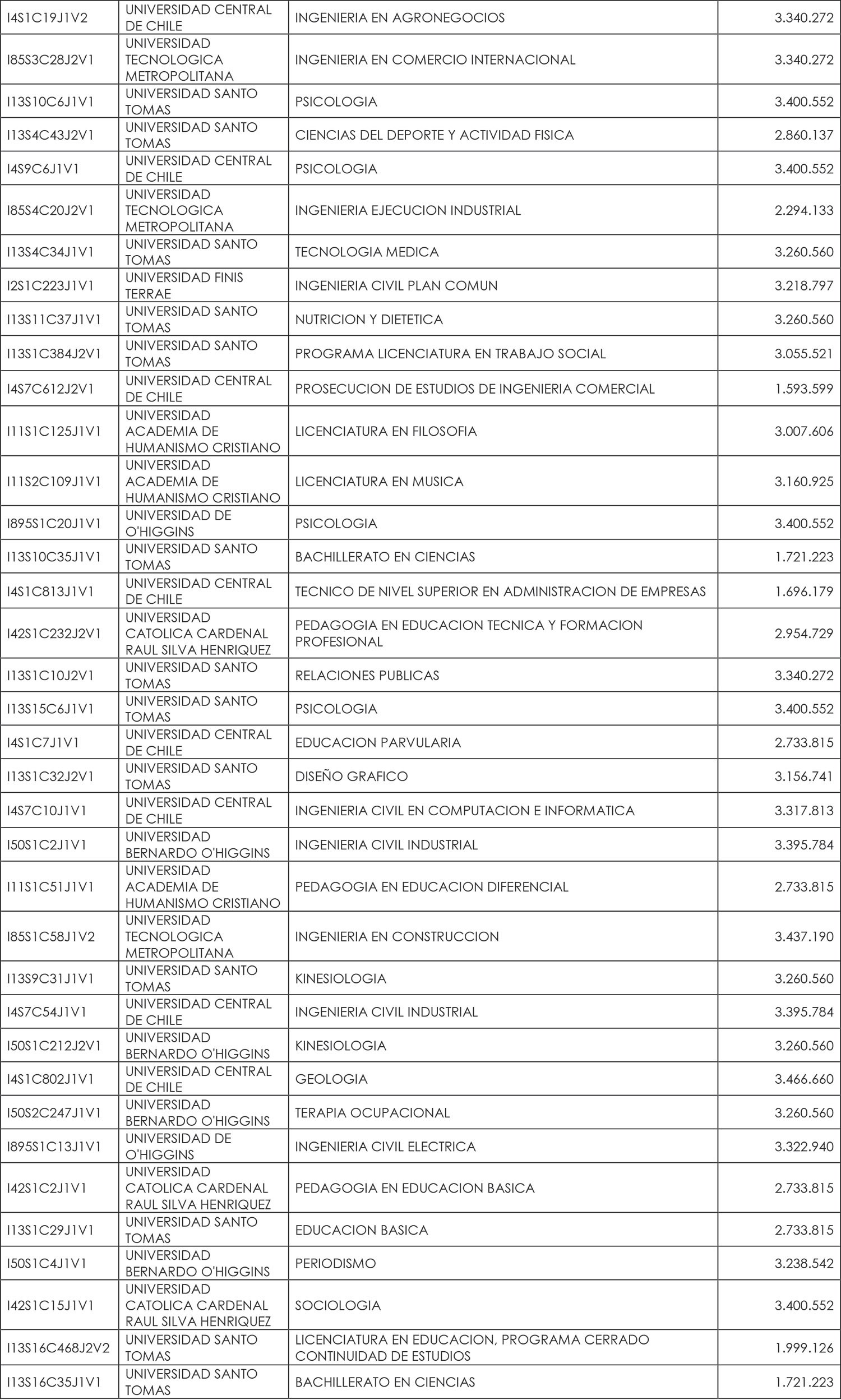 "Fíjase el arancel regulado para los programas impartidos por las Instituciones de Educación Superior adscritas a gratuidad, de conformidad al contenido de la siguiente tabla: