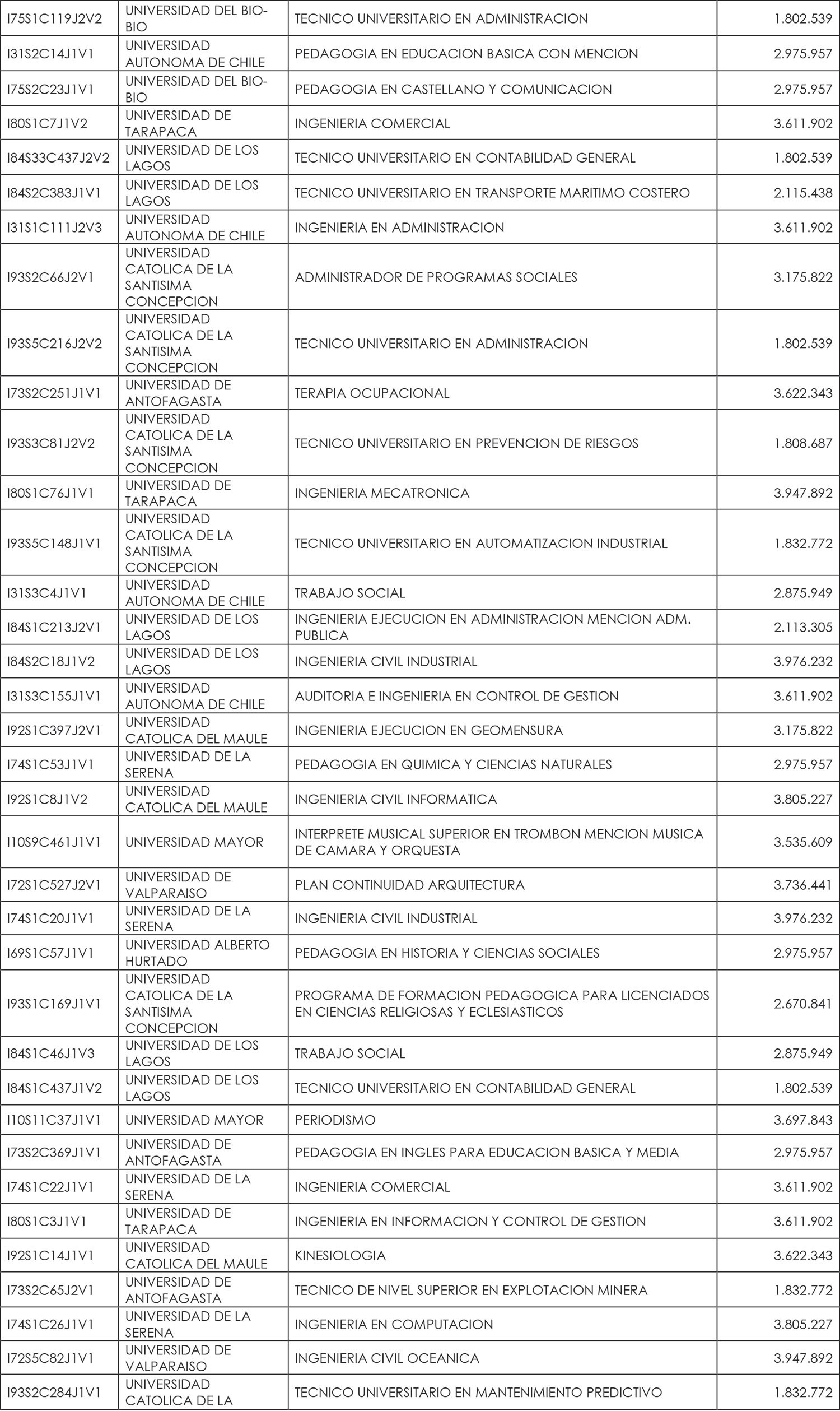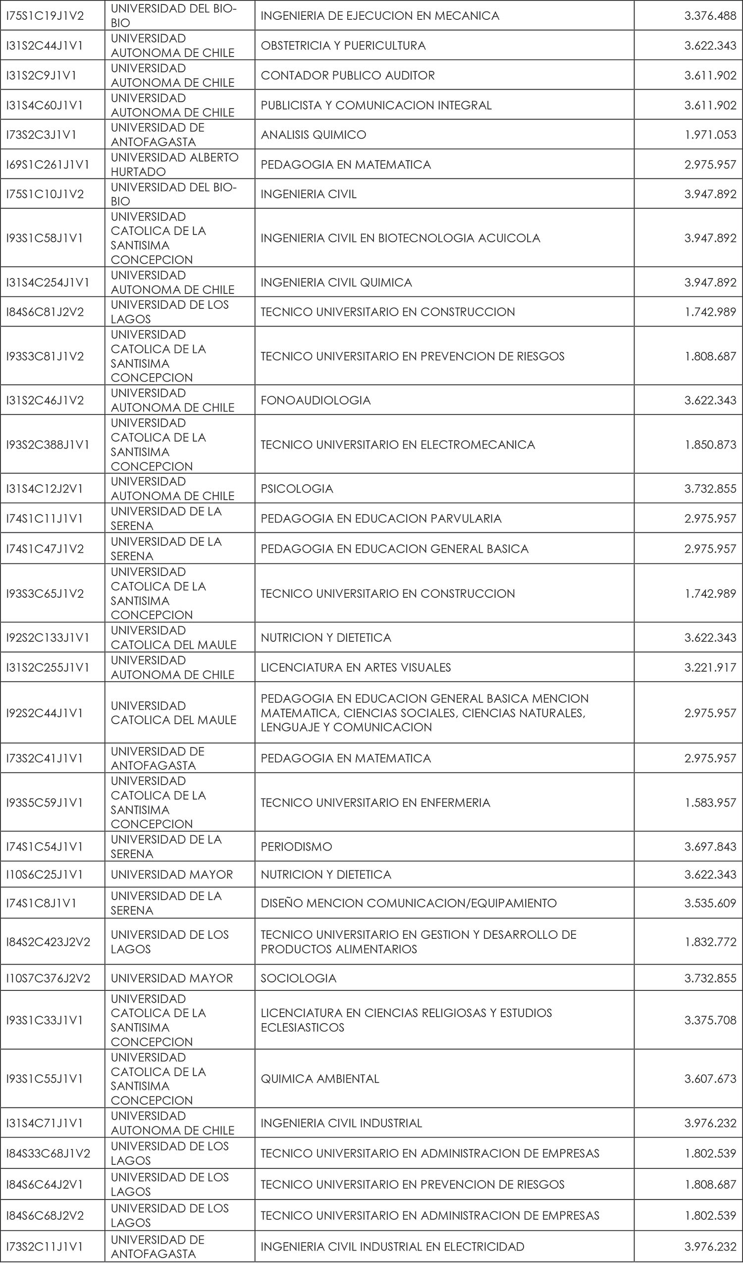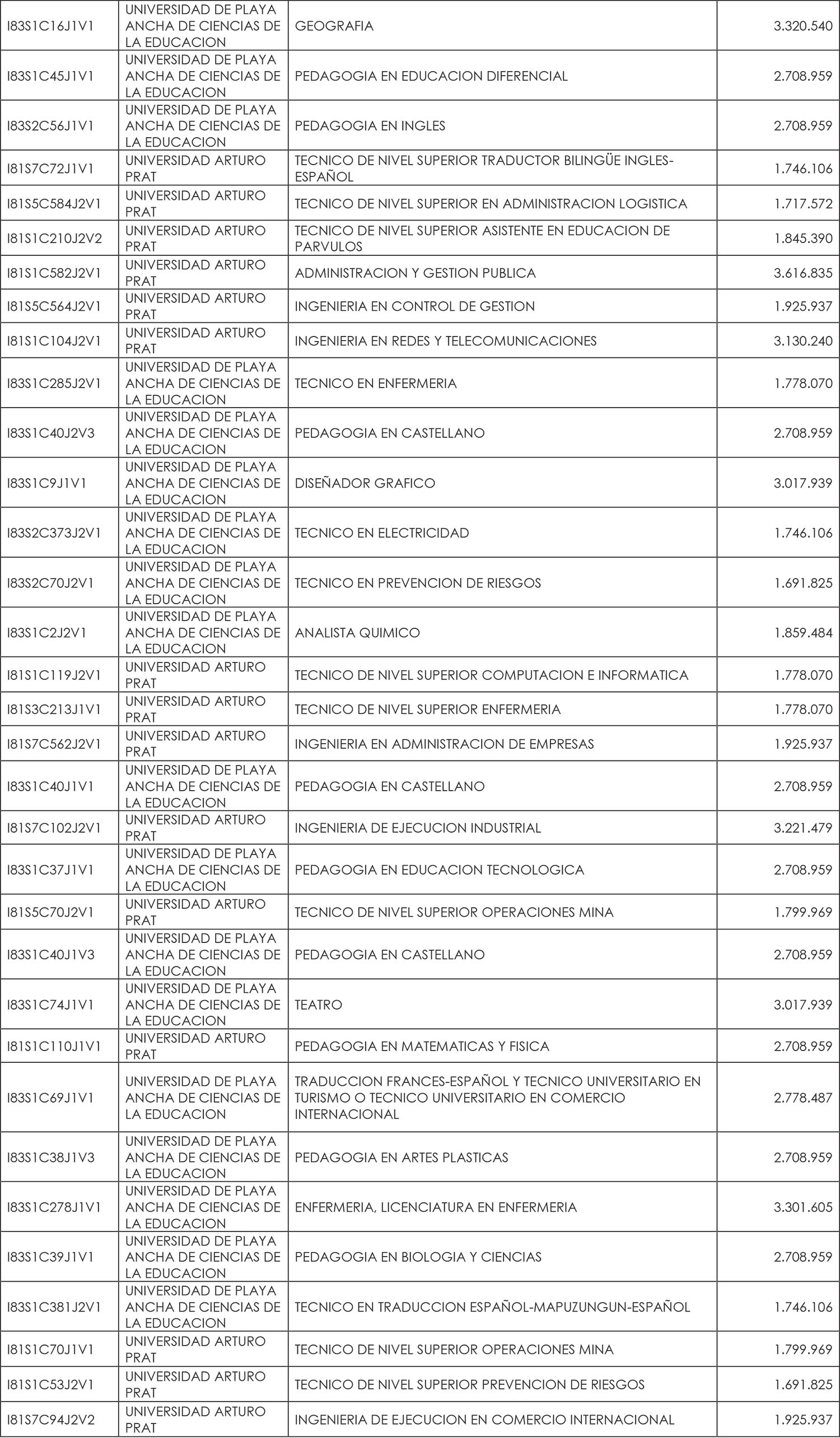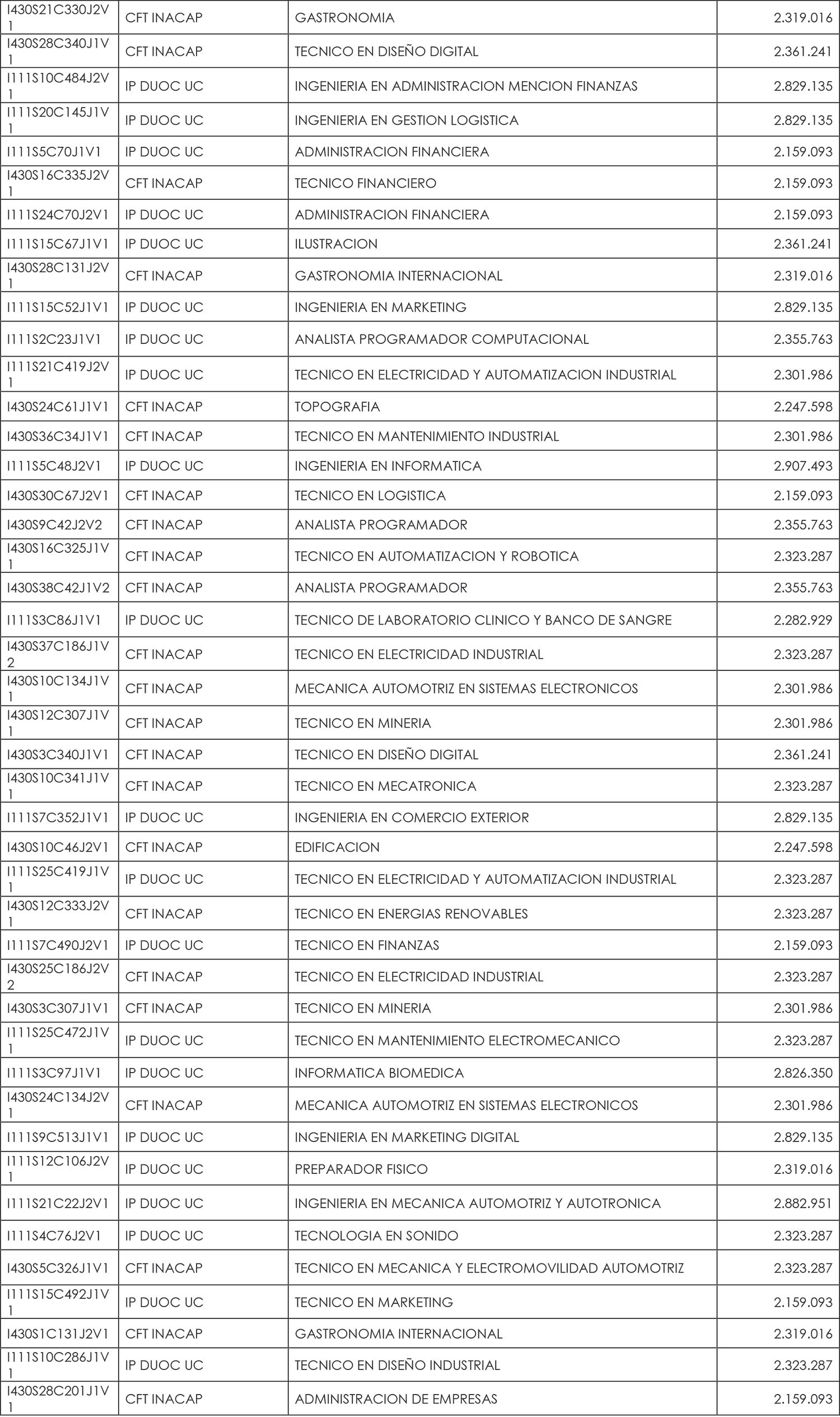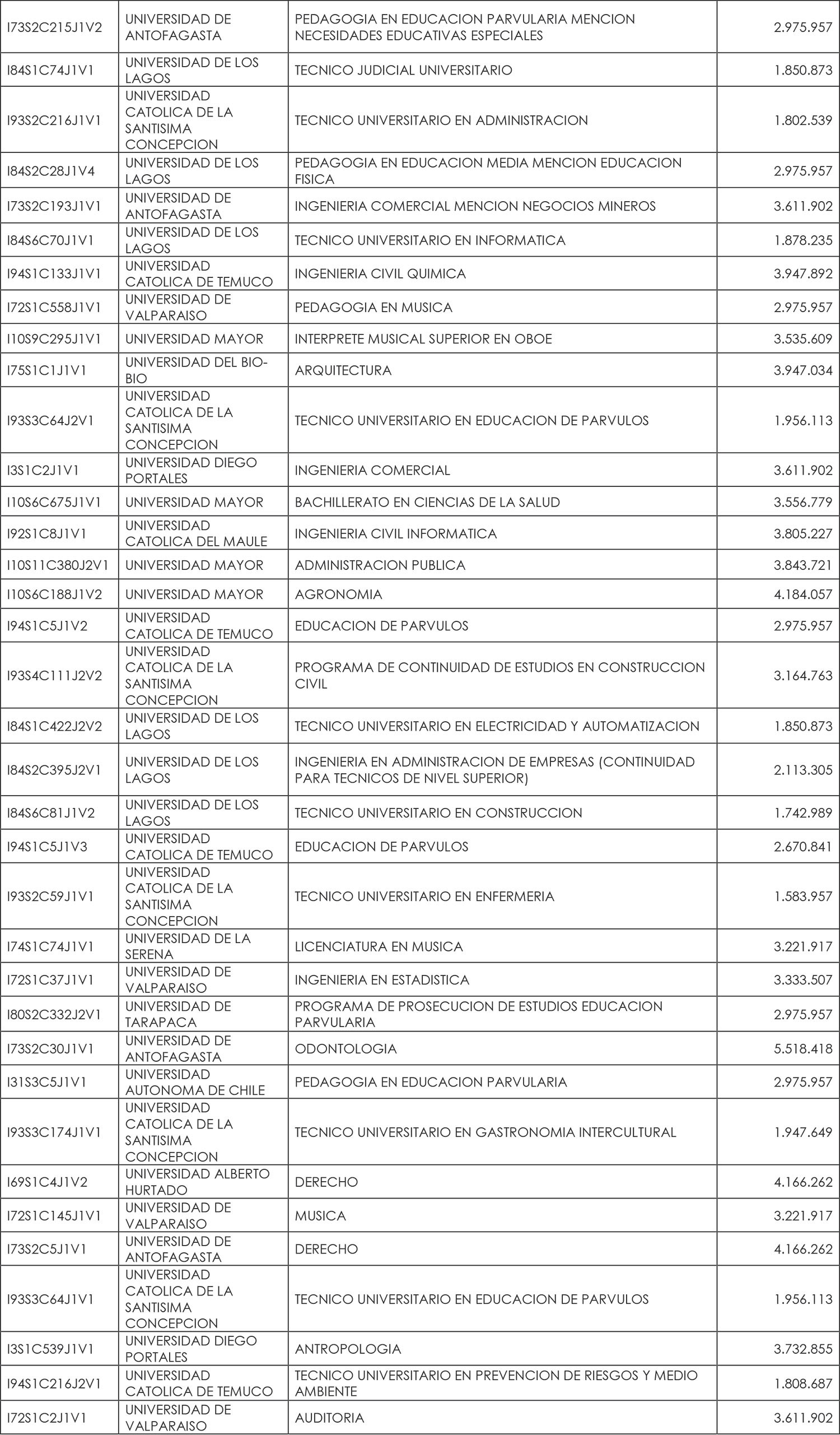 "Fíjase el arancel regulado para los programas impartidos por las Instituciones de Educación Superior adscritas a gratuidad, de conformidad al contenido de la siguiente tabla: