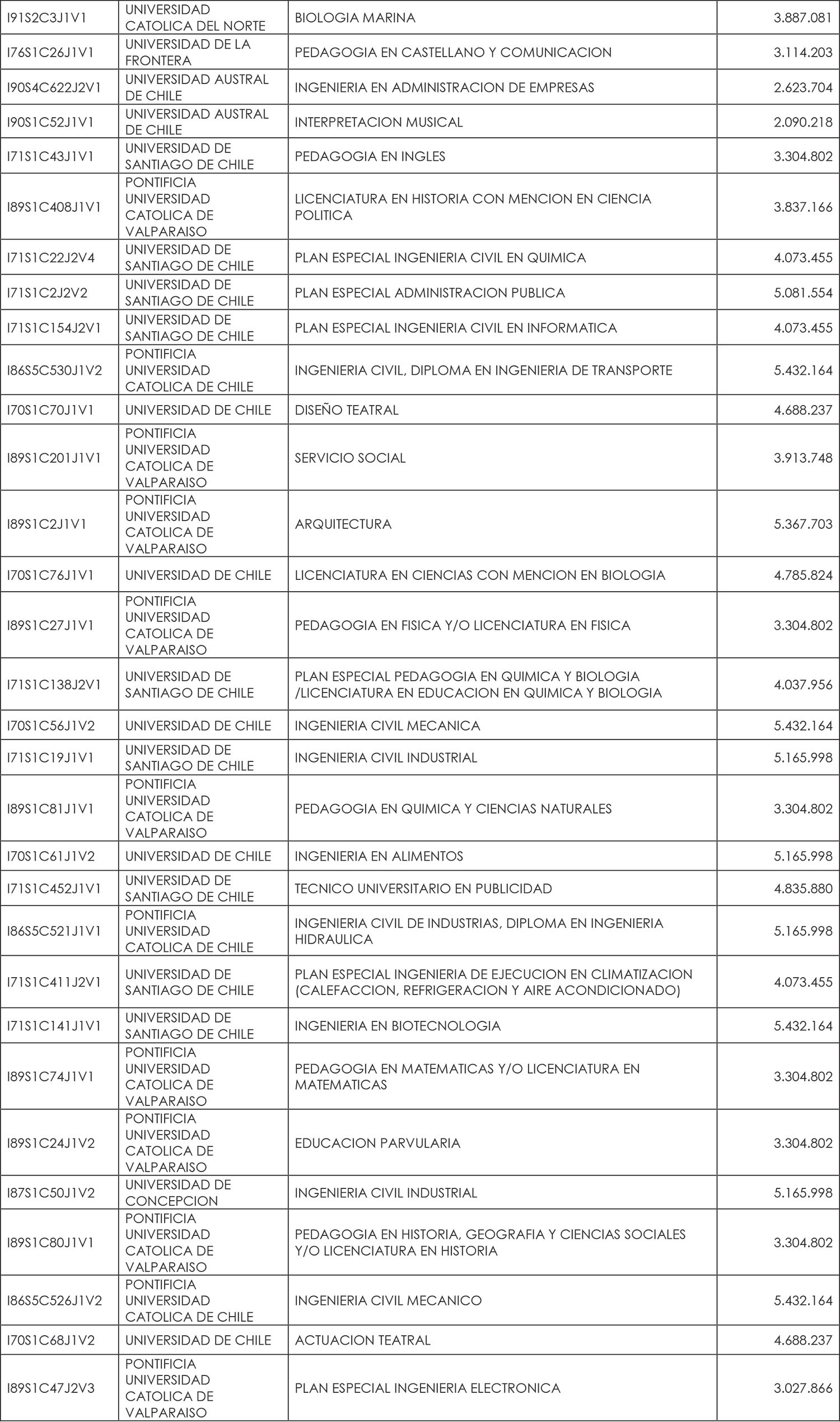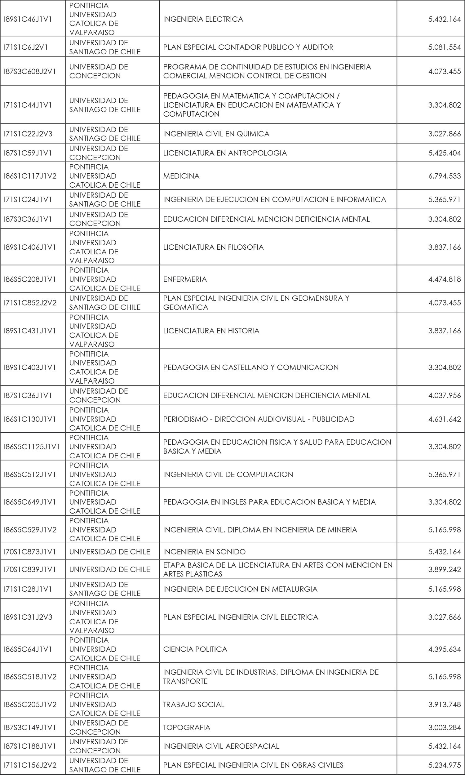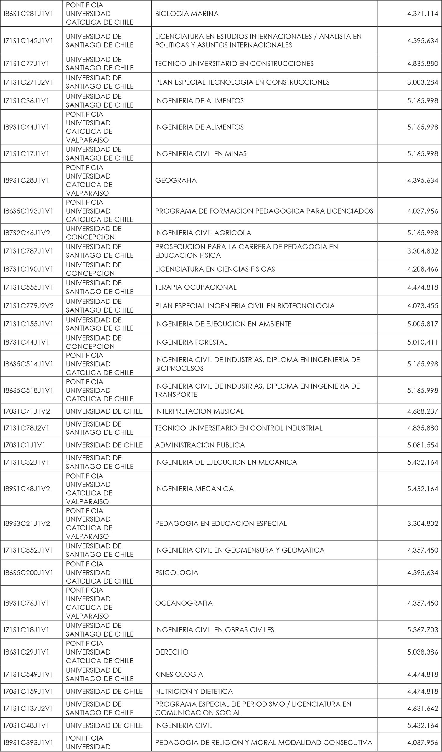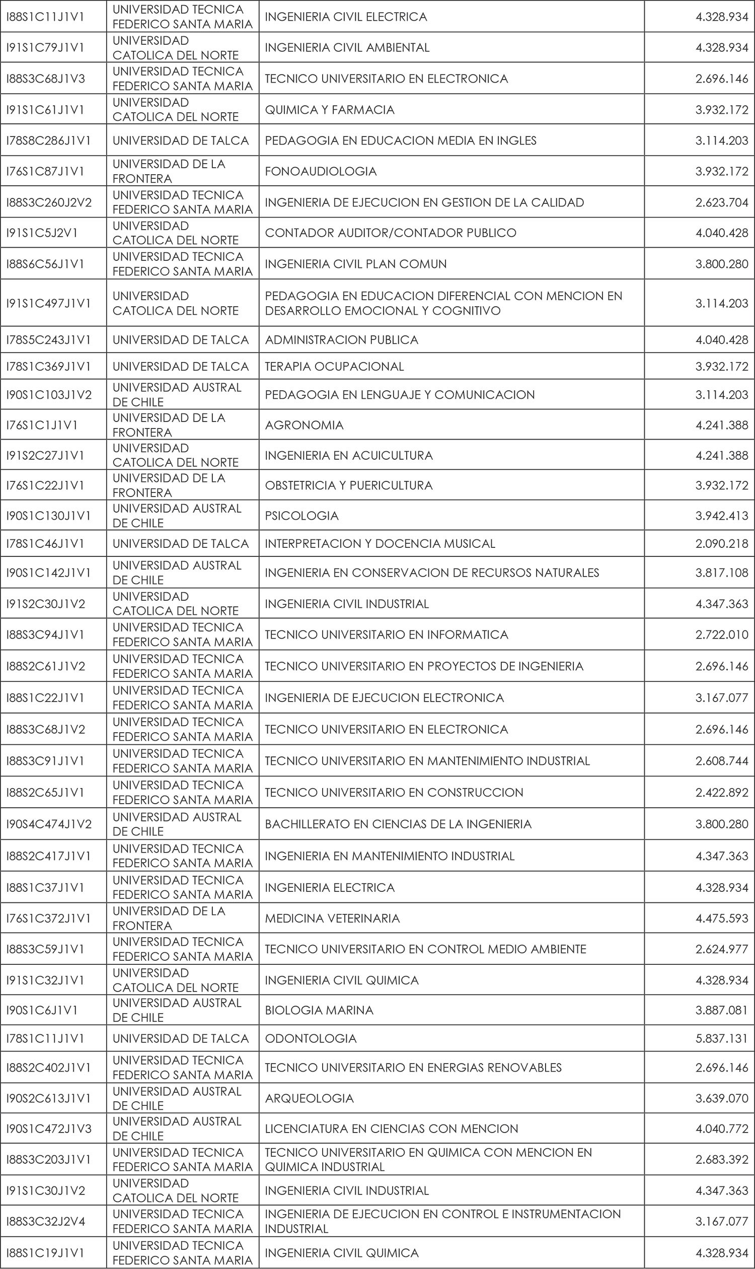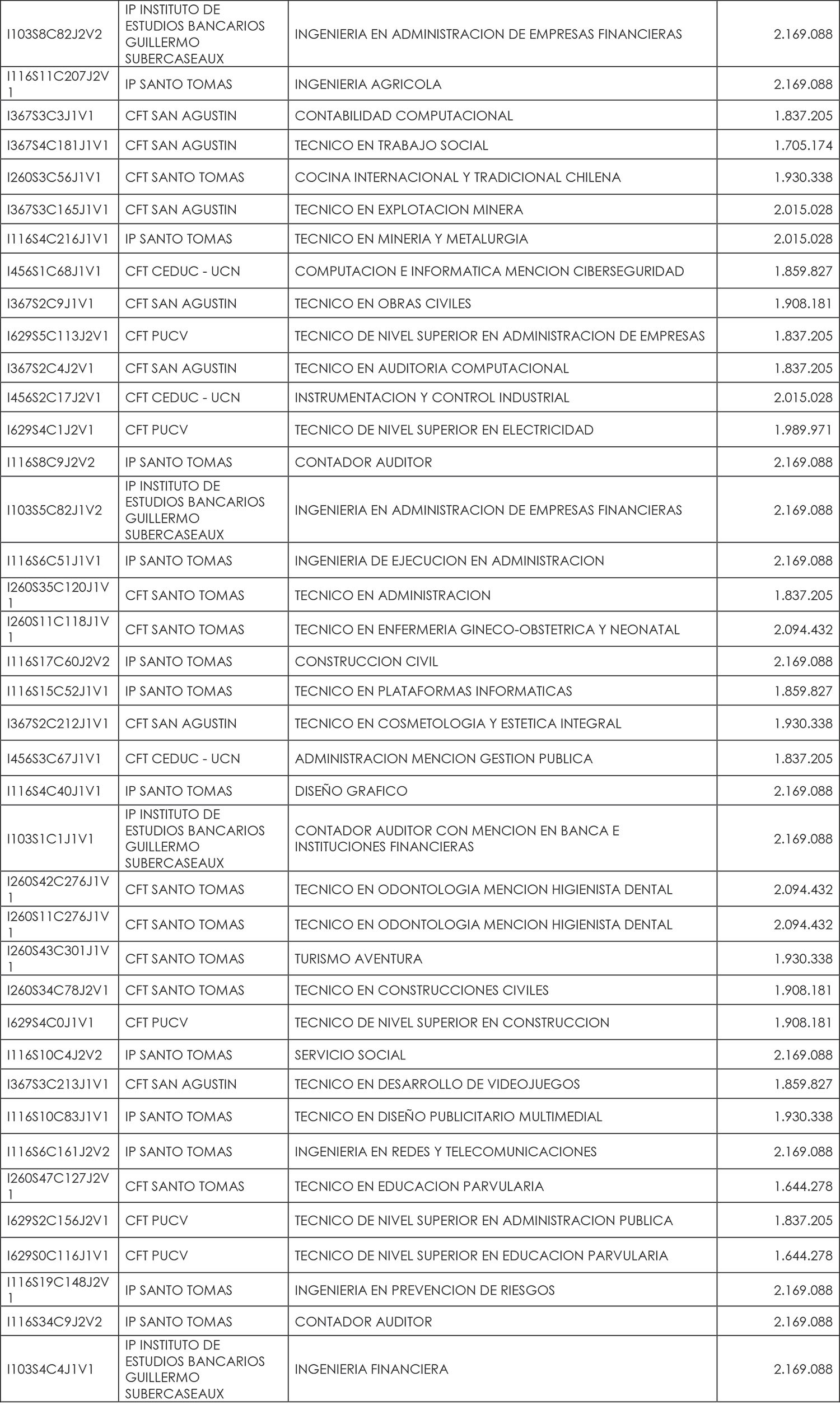 "Fíjase el arancel regulado para los programas impartidos por las Instituciones de Educación Superior adscritas a gratuidad, de conformidad al contenido de la siguiente tabla:
