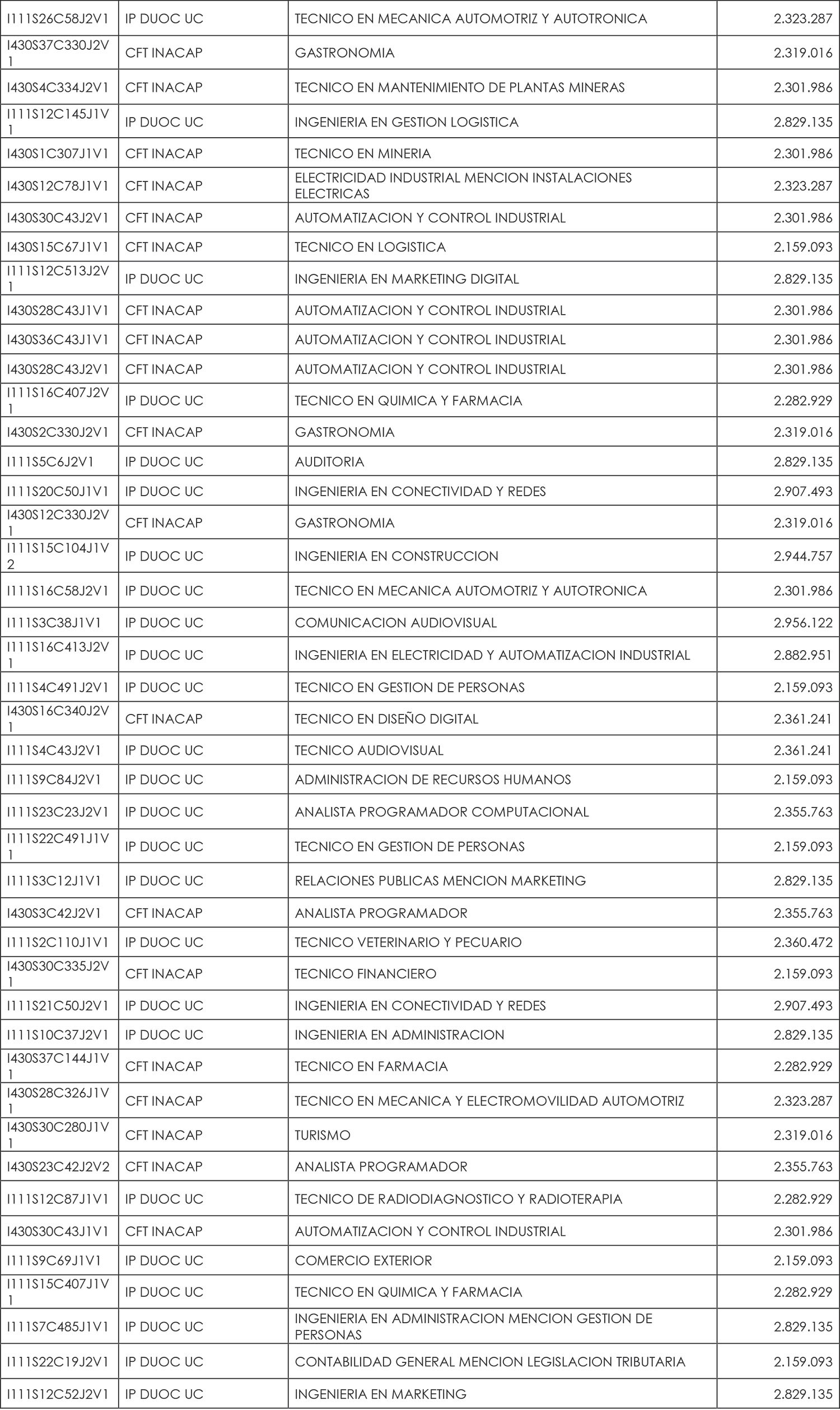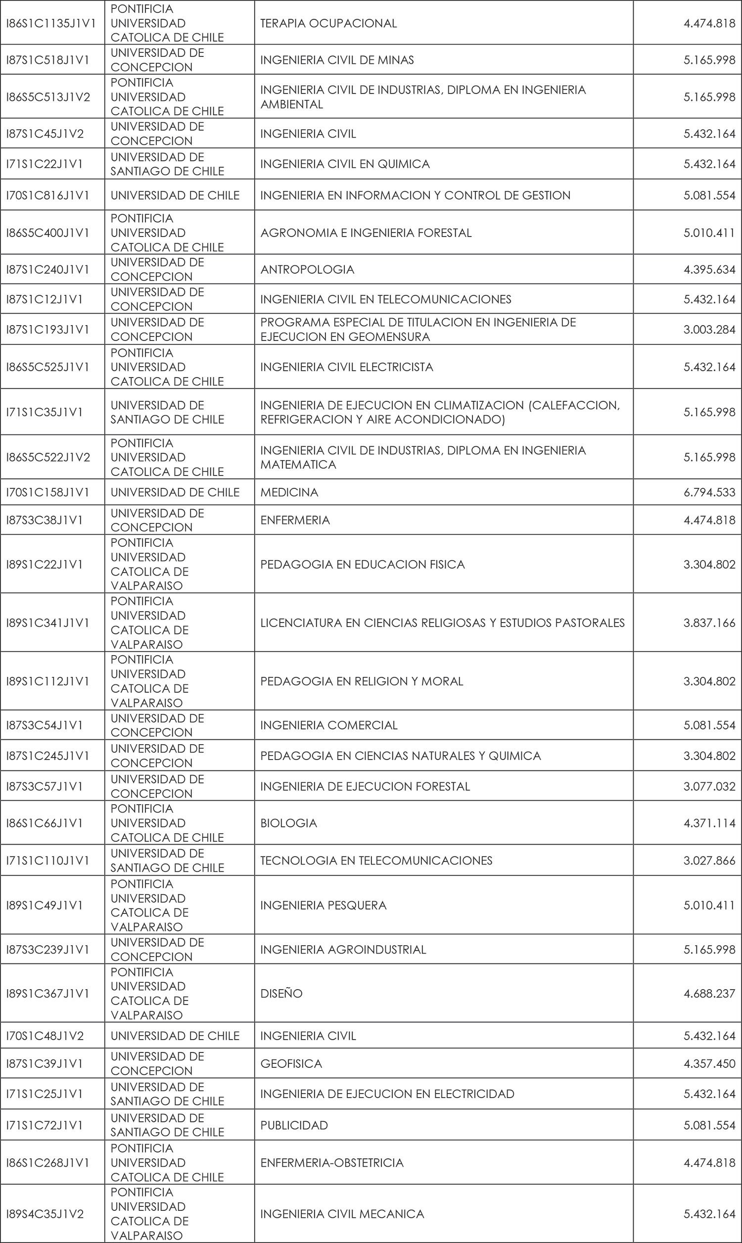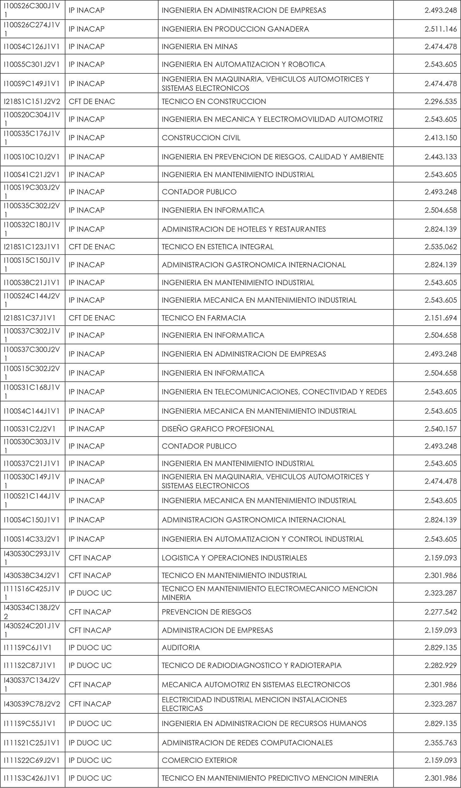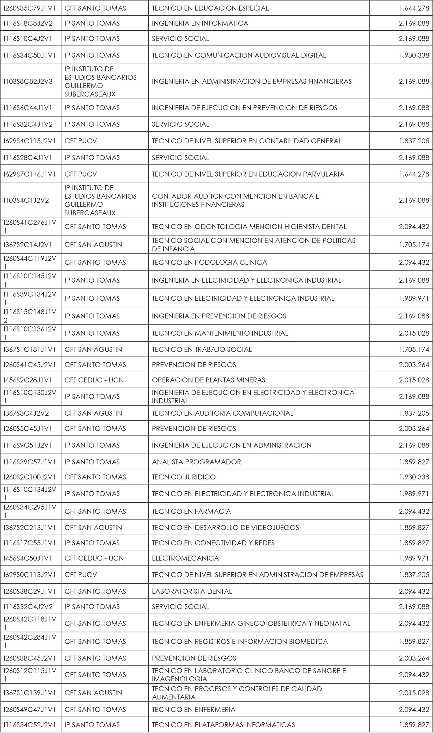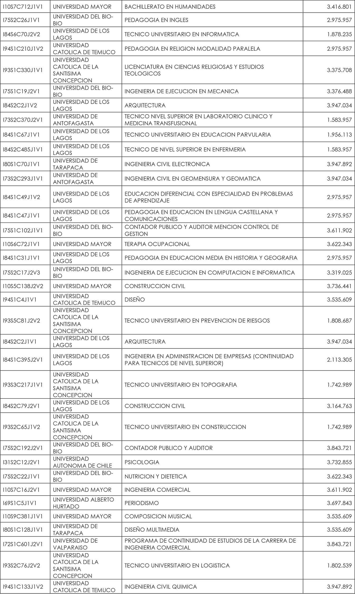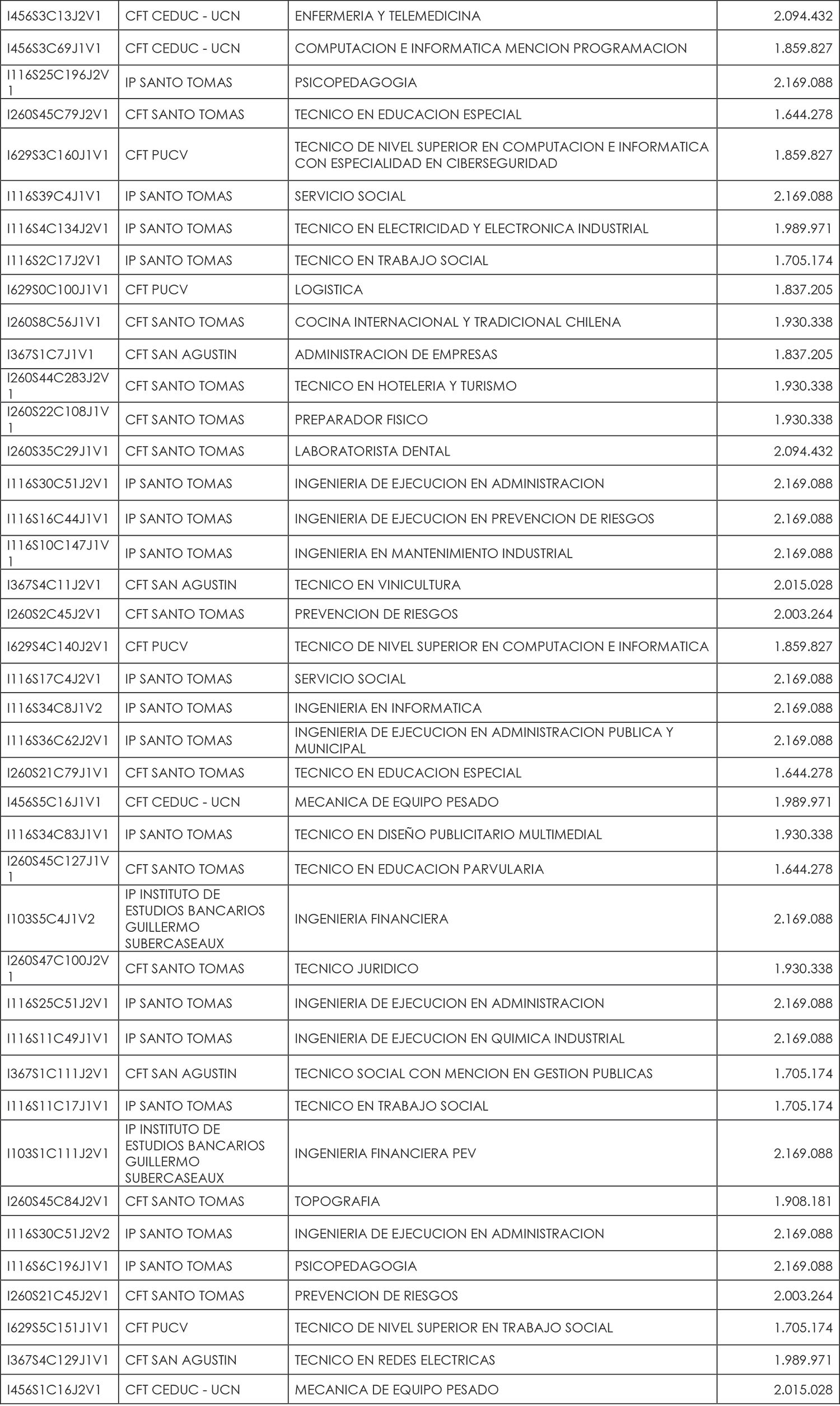 "Fíjase el arancel regulado para los programas impartidos por las Instituciones de Educación Superior adscritas a gratuidad, de conformidad al contenido de la siguiente tabla: