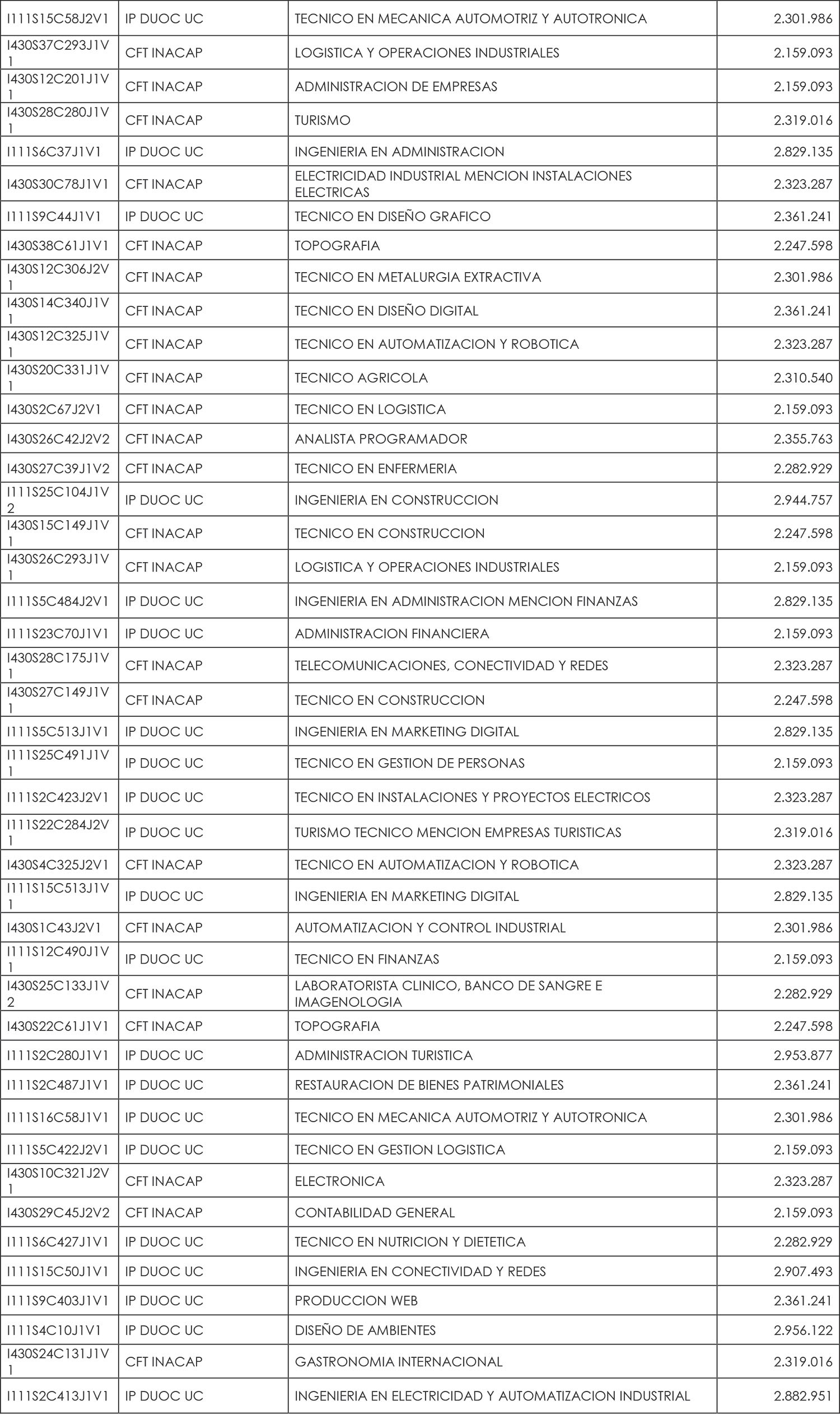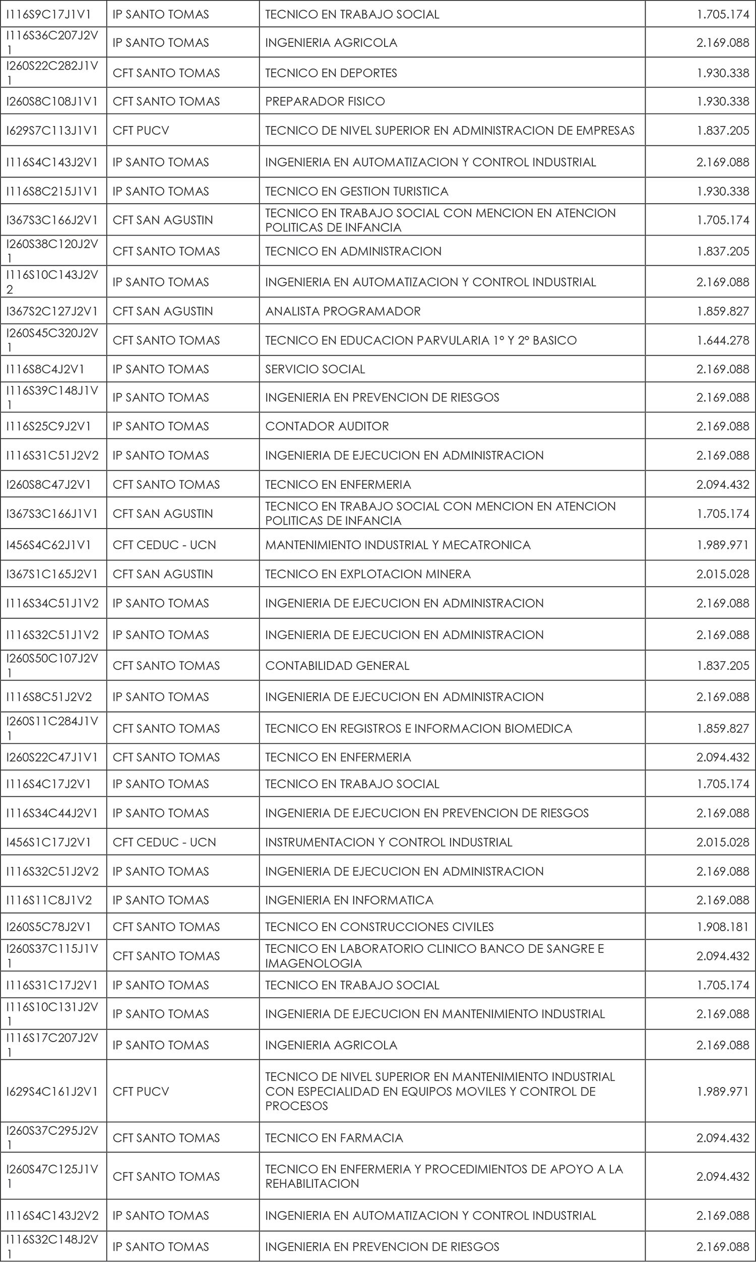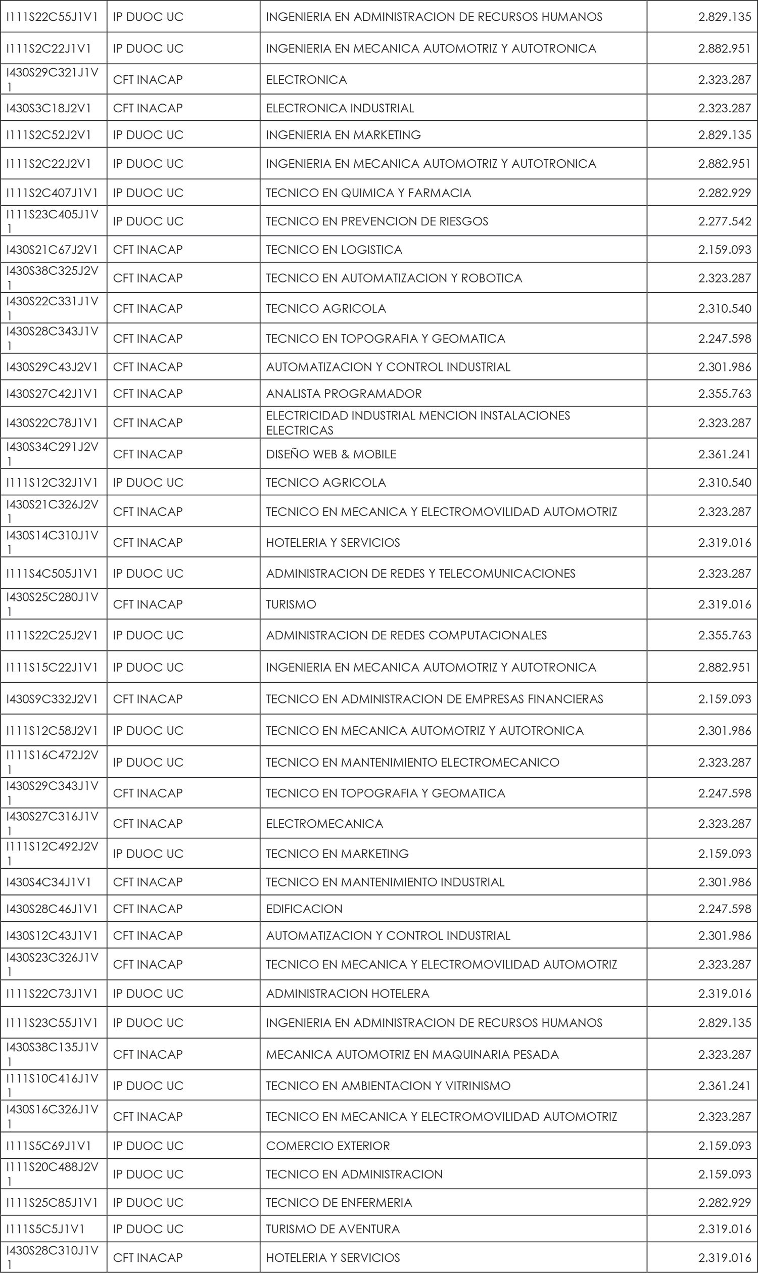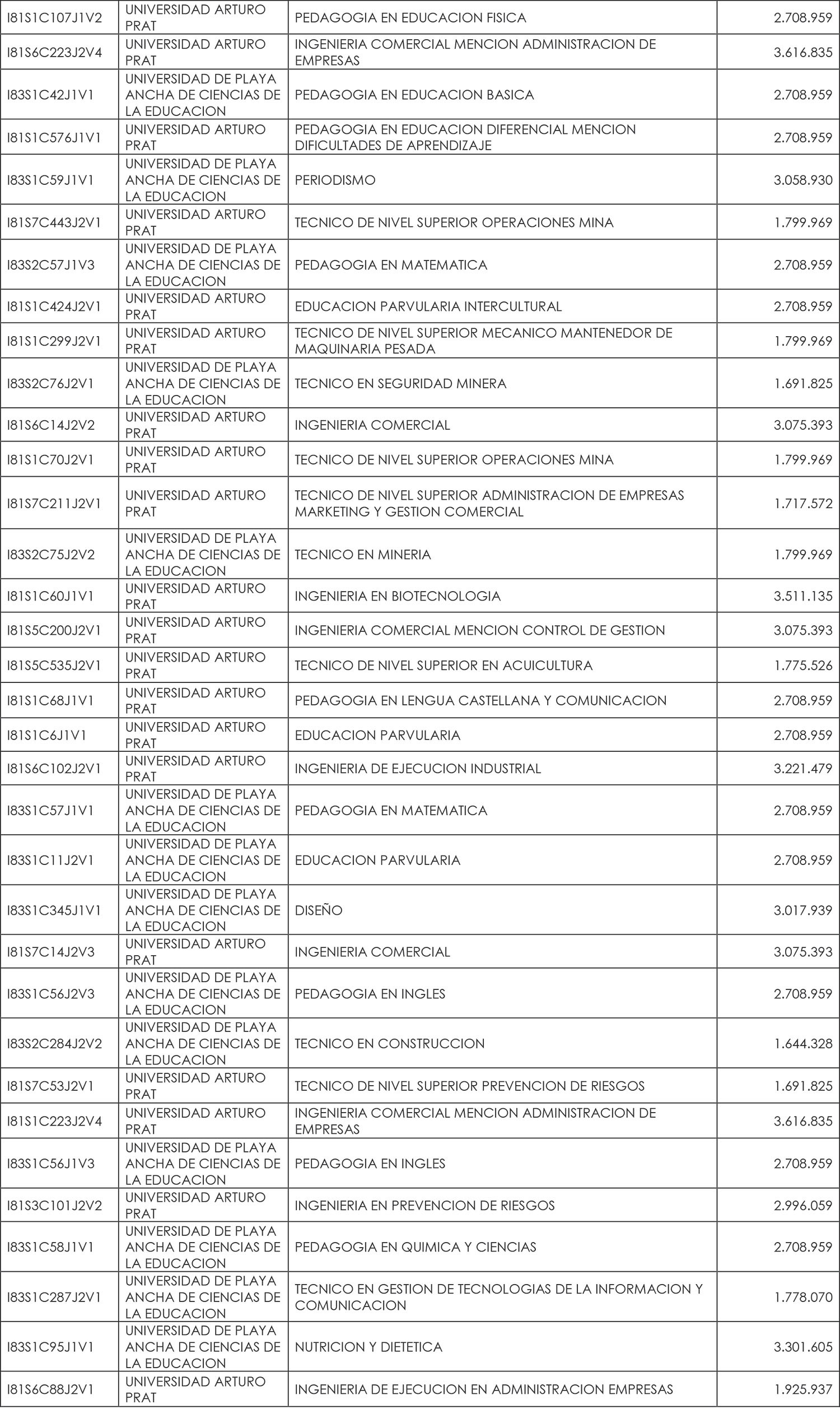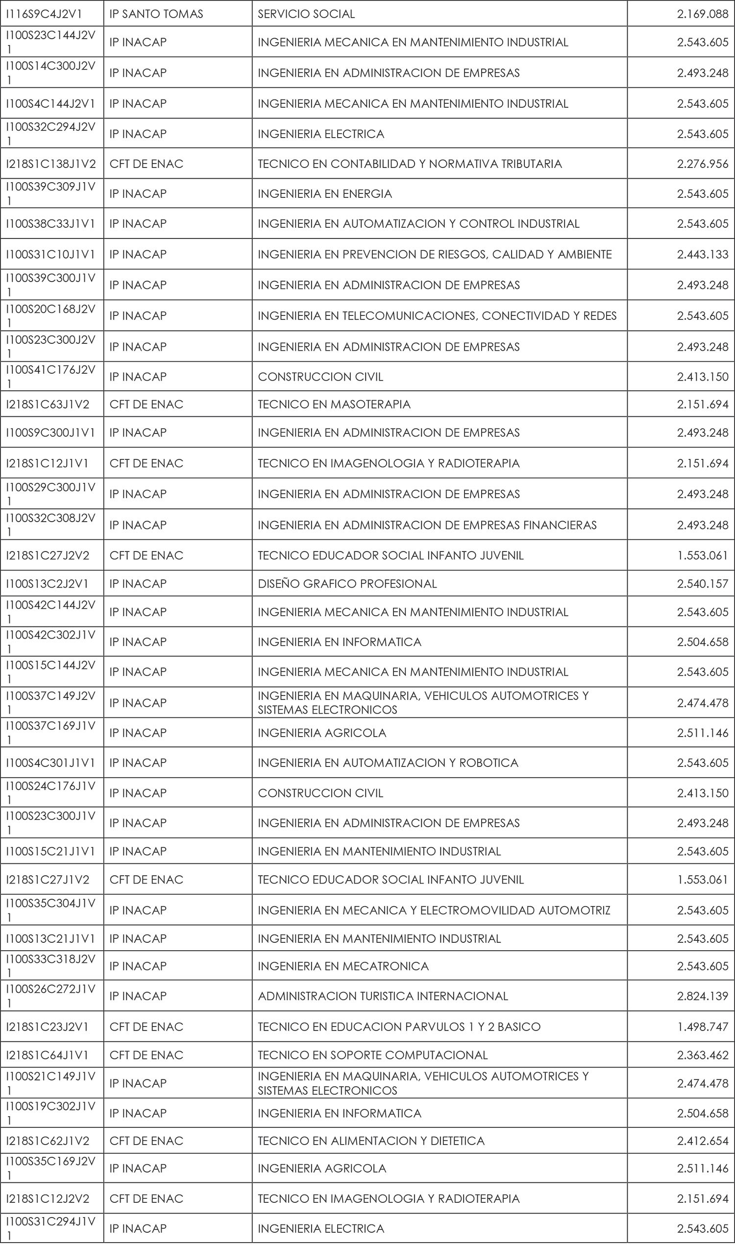 "Fíjase el arancel regulado para los programas impartidos por las Instituciones de Educación Superior adscritas a gratuidad, de conformidad al contenido de la siguiente tabla: