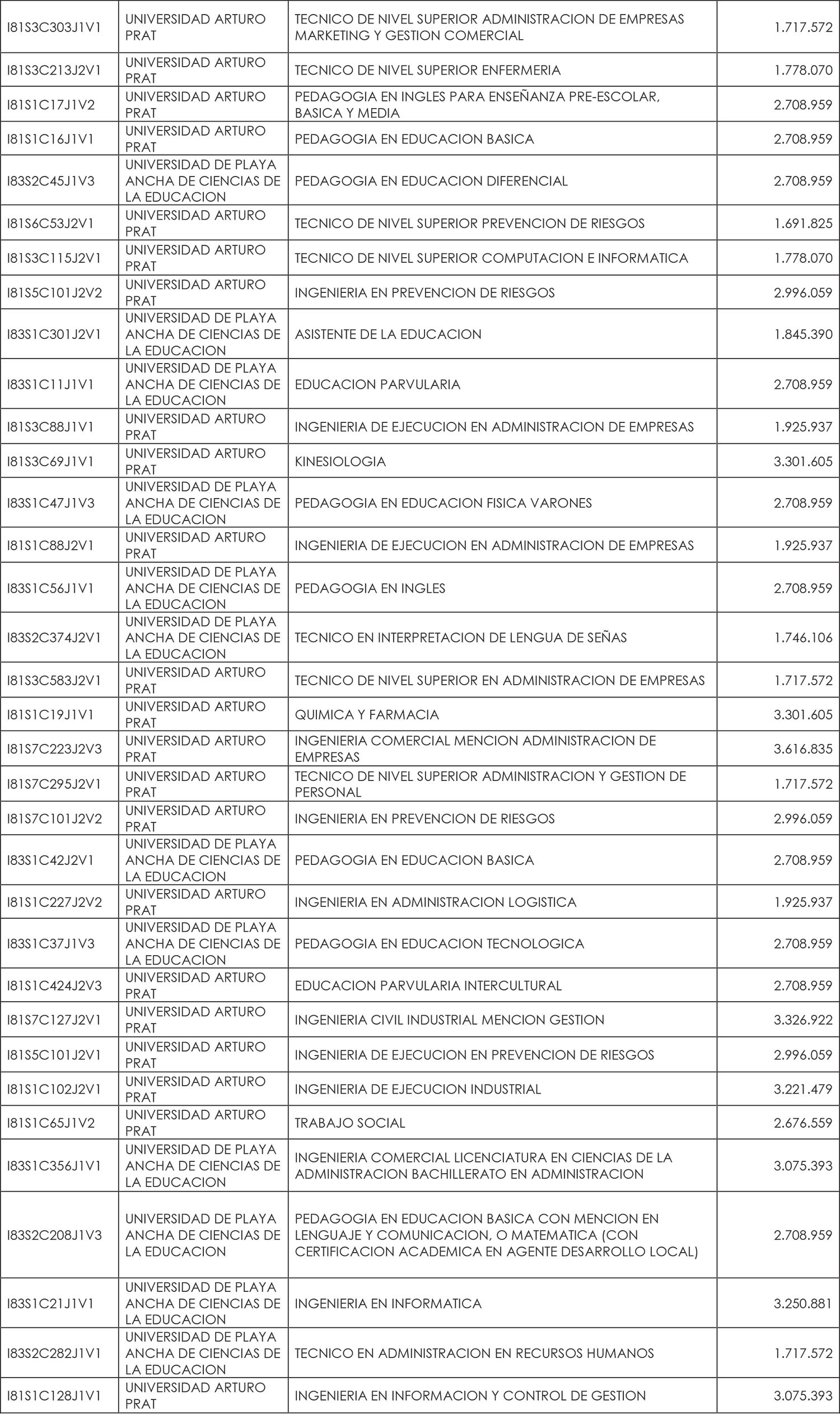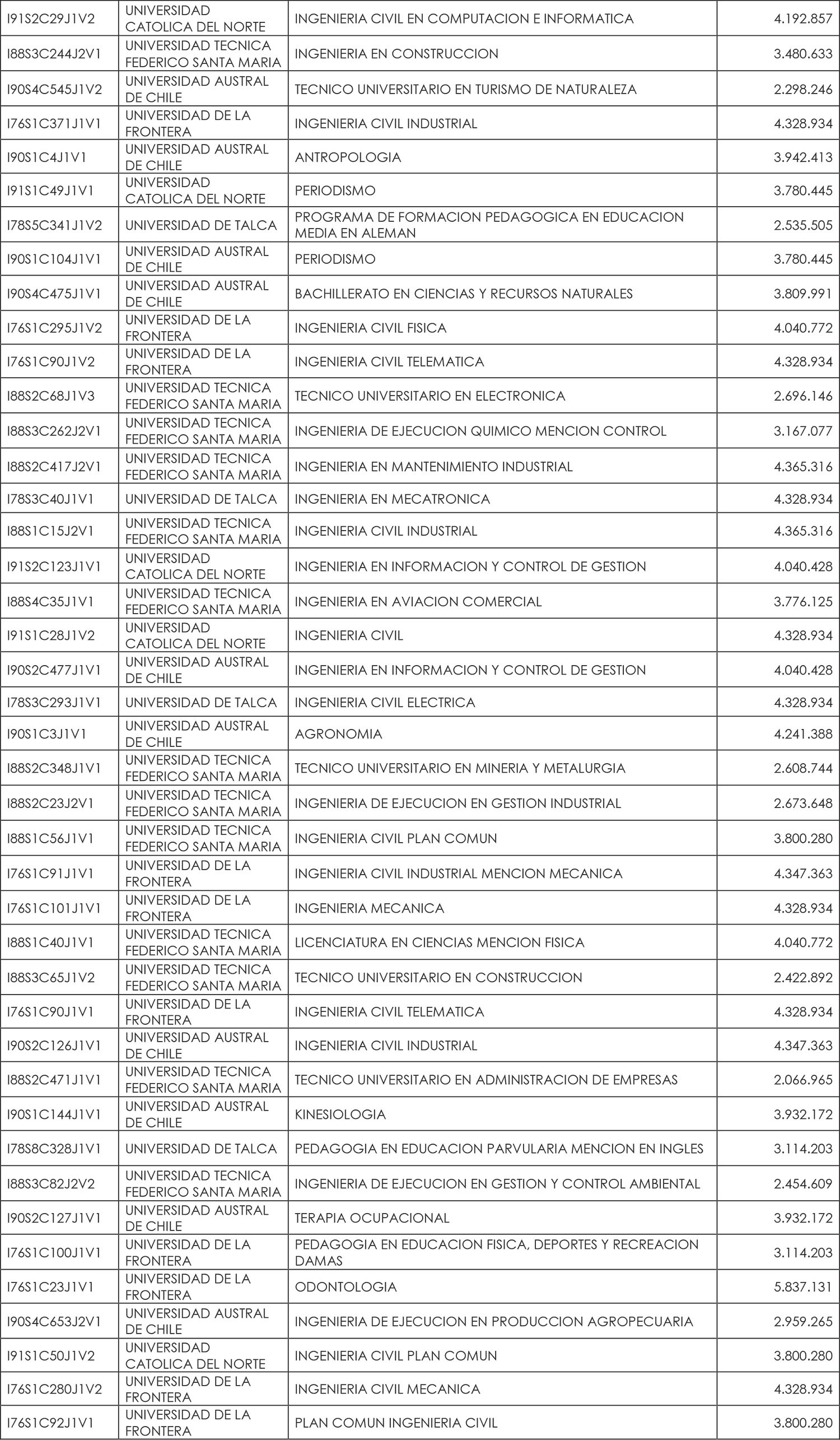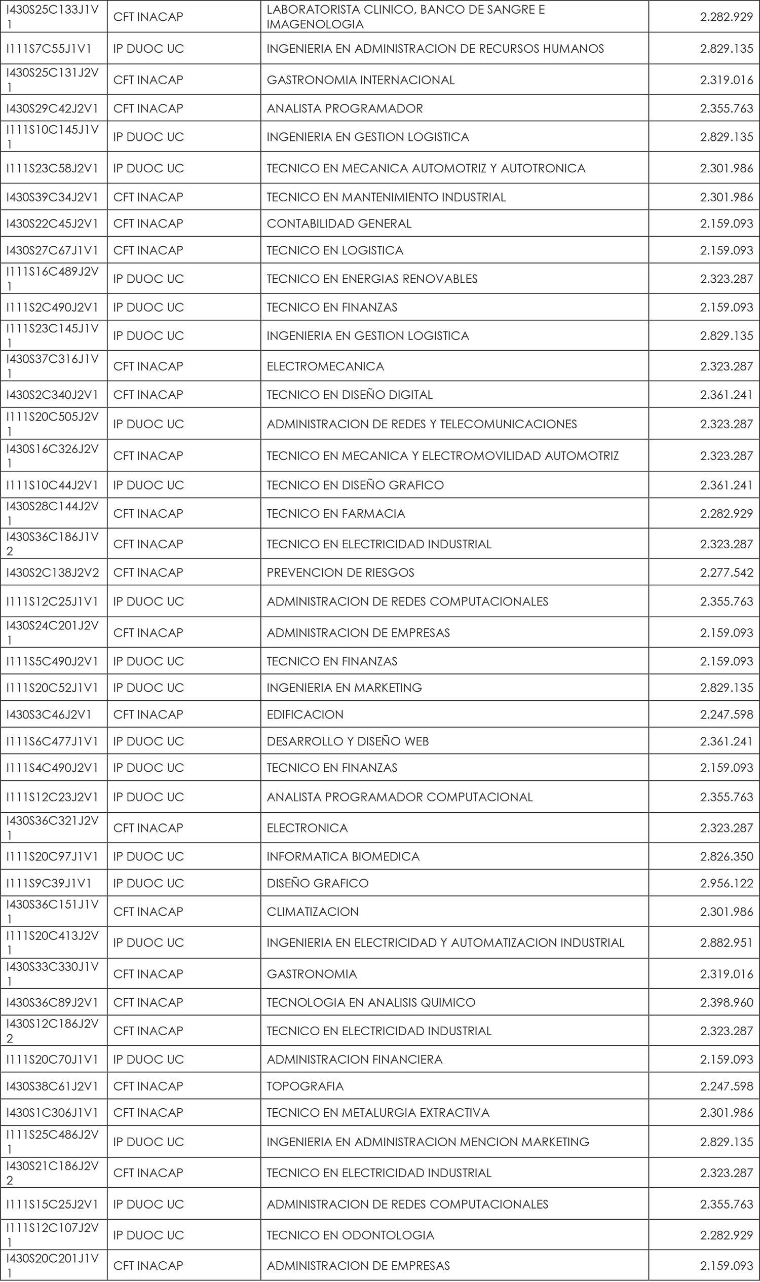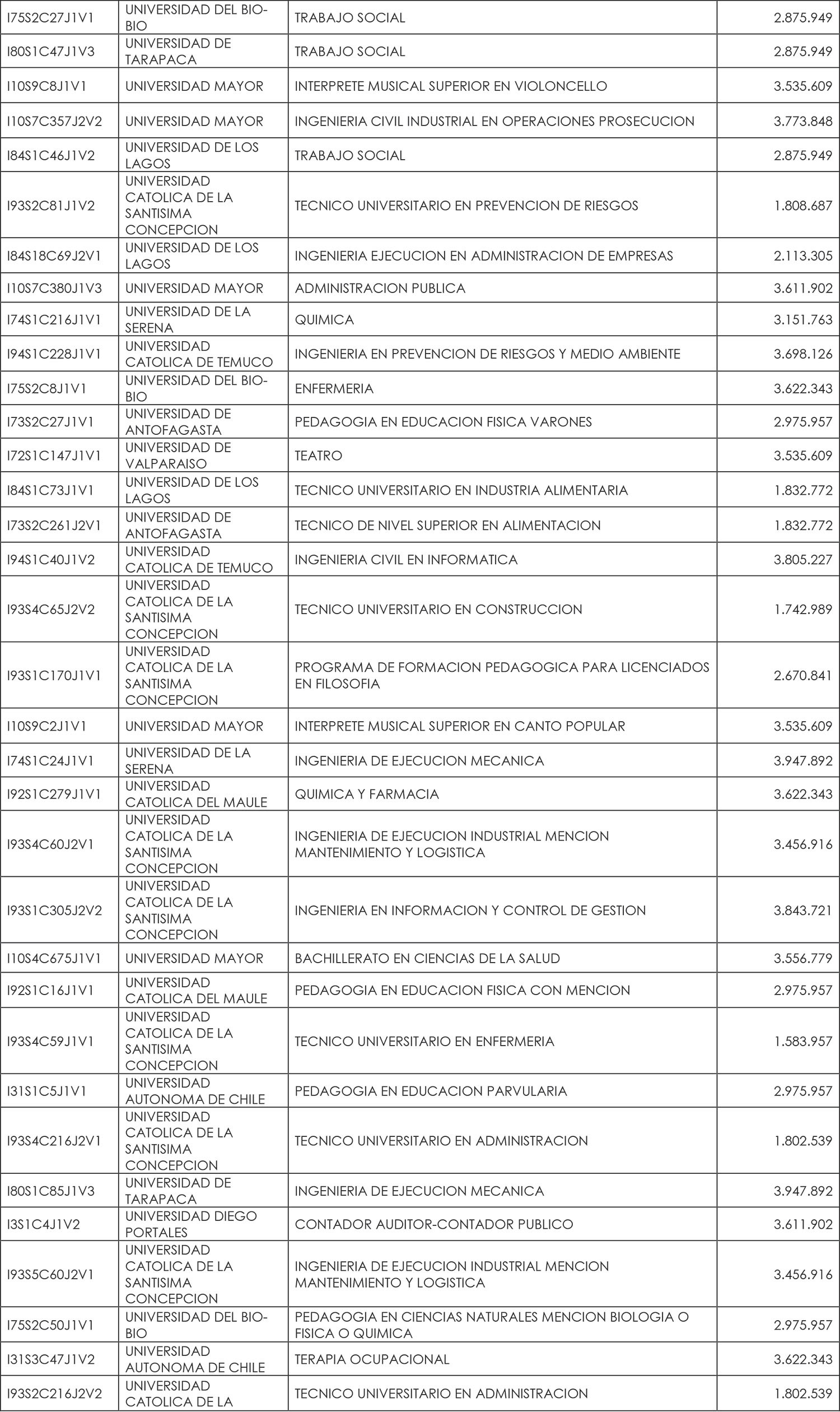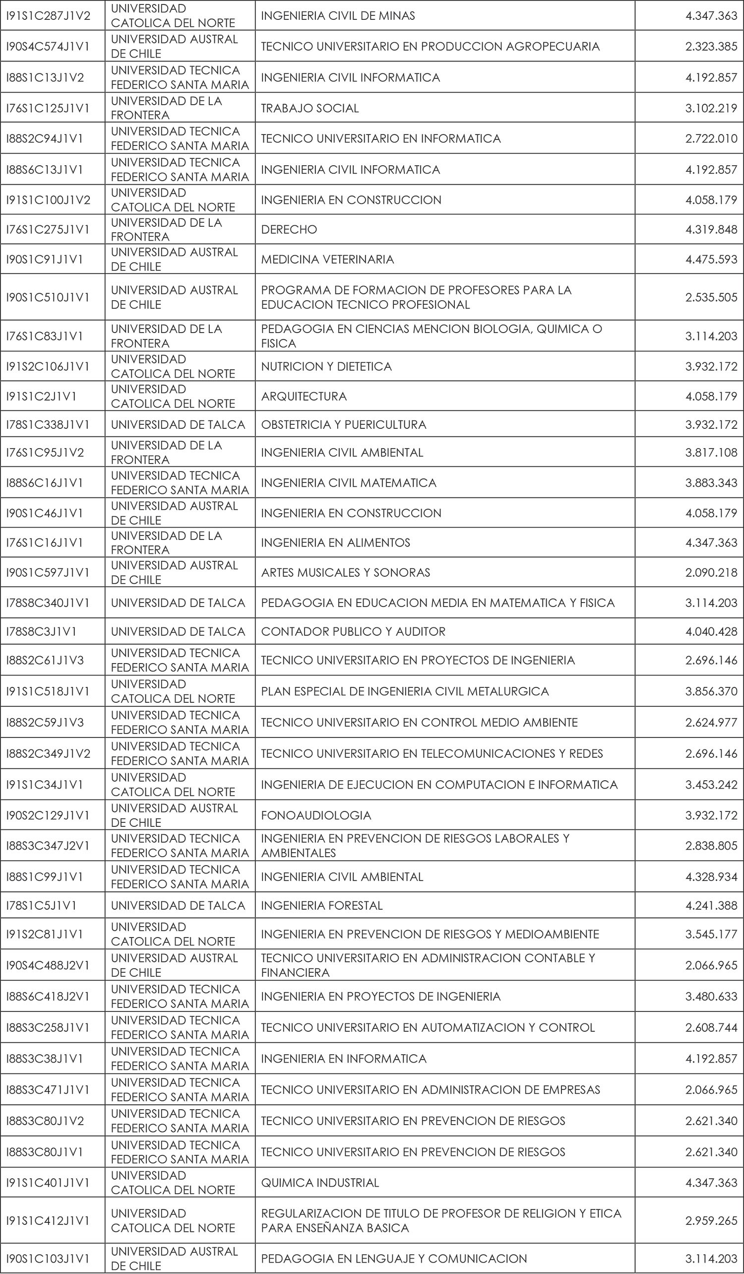 "Fíjase el arancel regulado para los programas impartidos por las Instituciones de Educación Superior adscritas a gratuidad, de conformidad al contenido de la siguiente tabla: