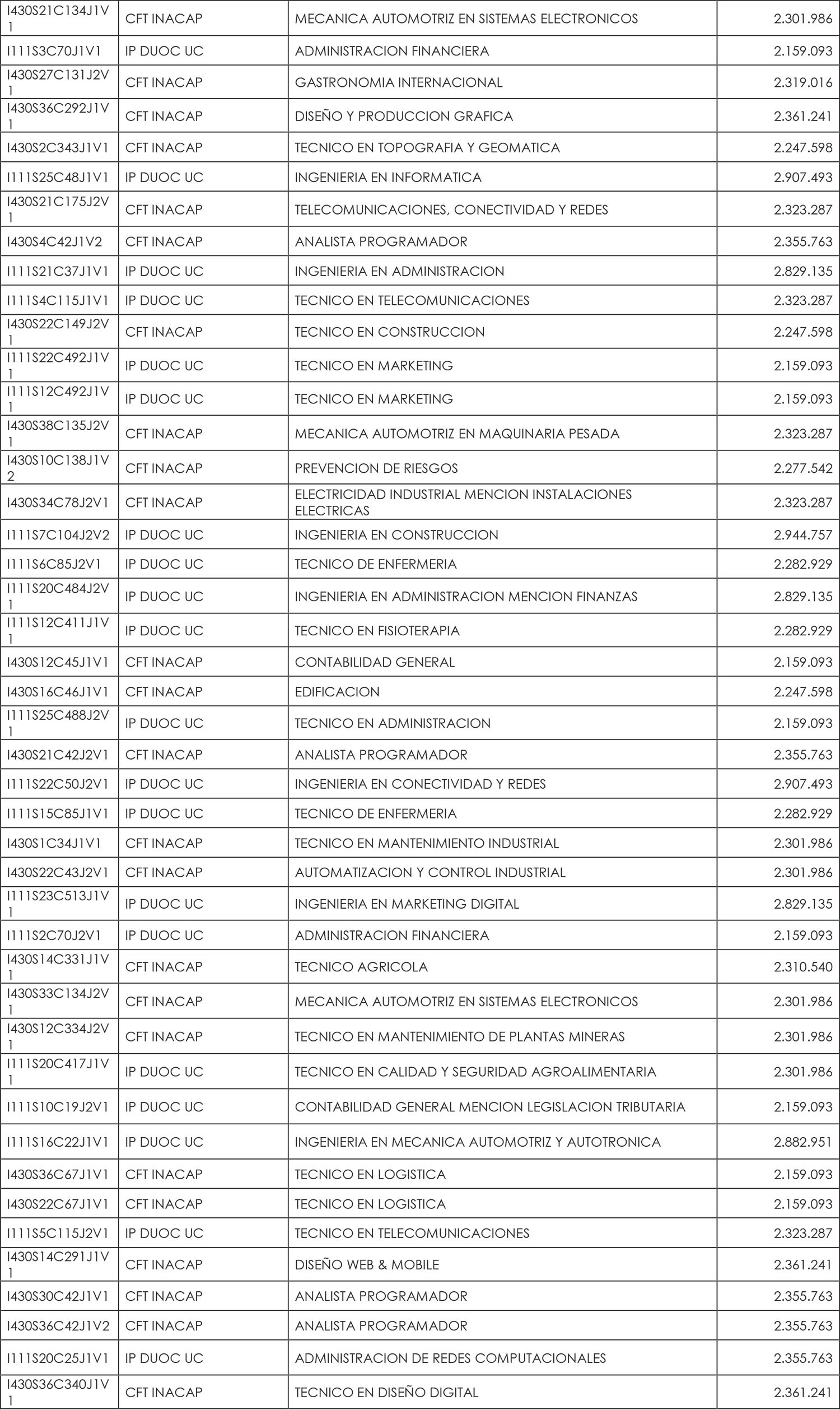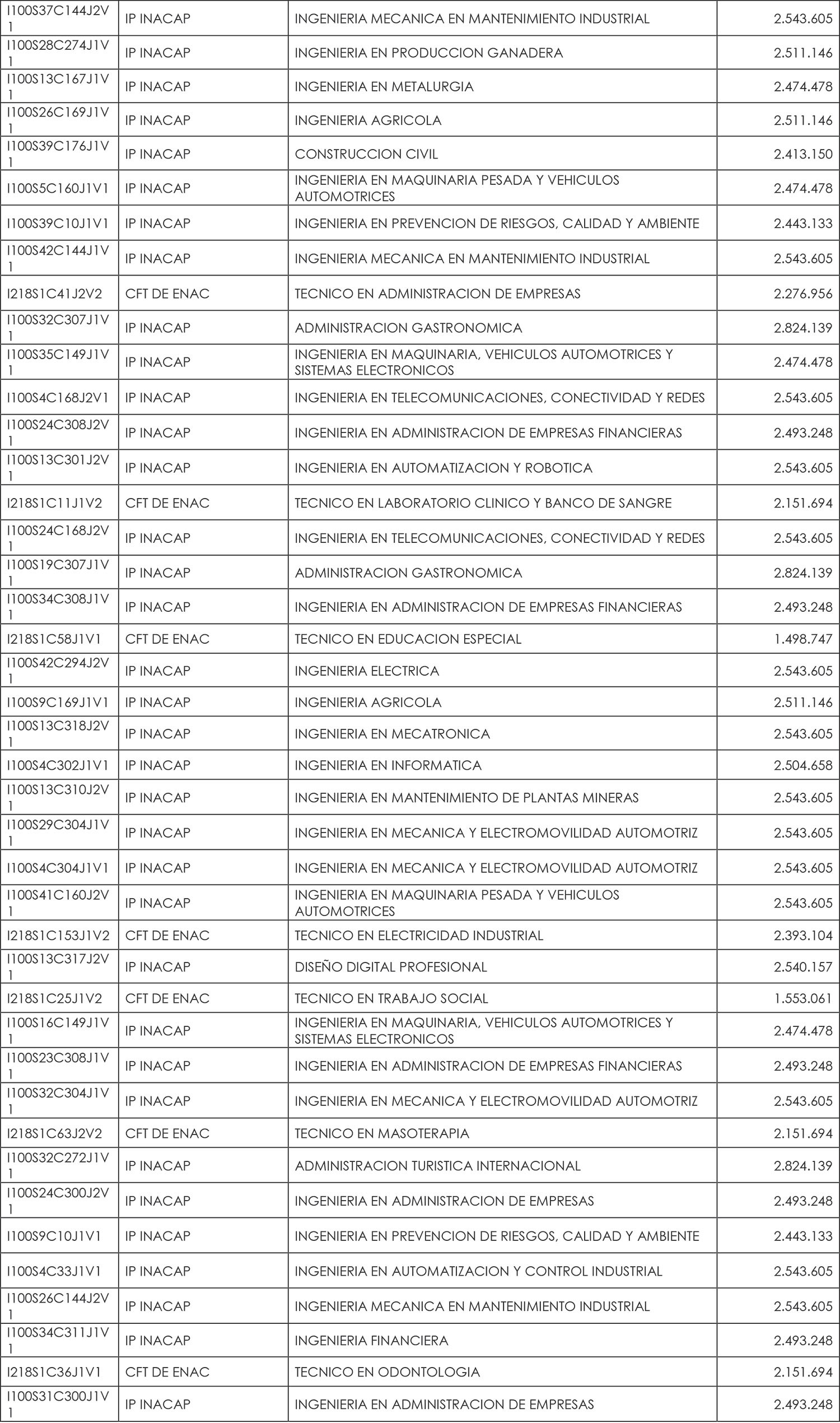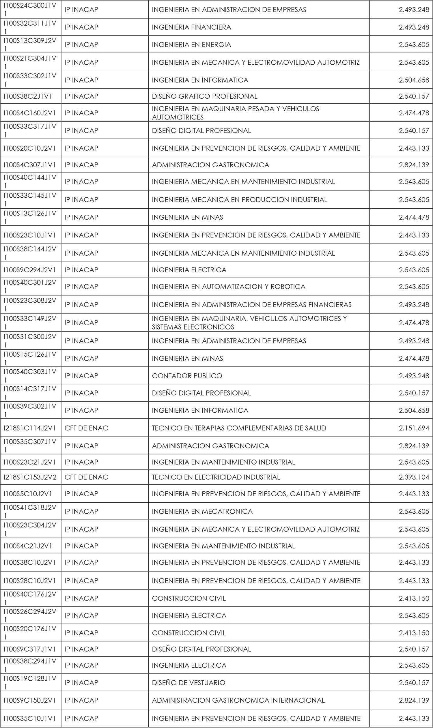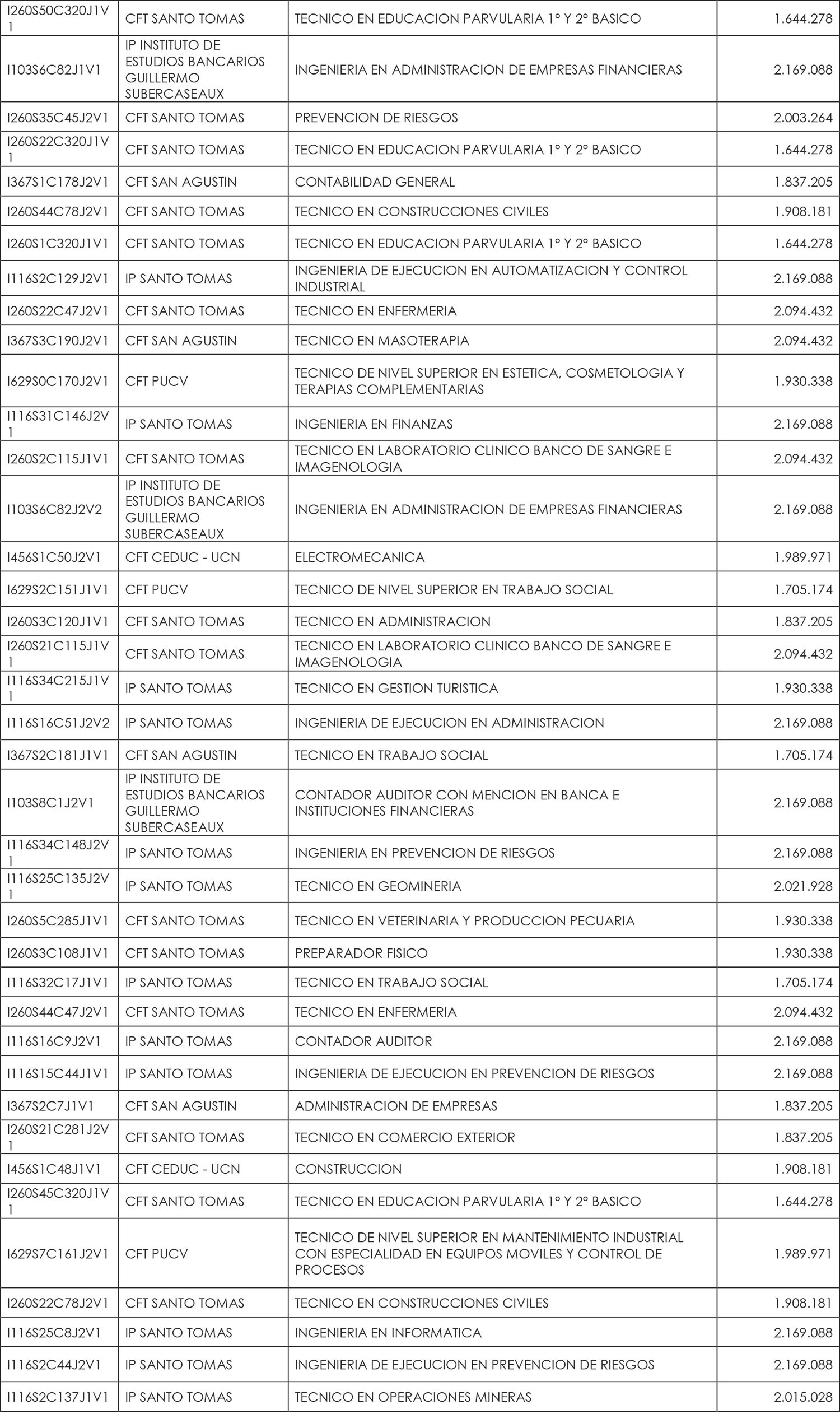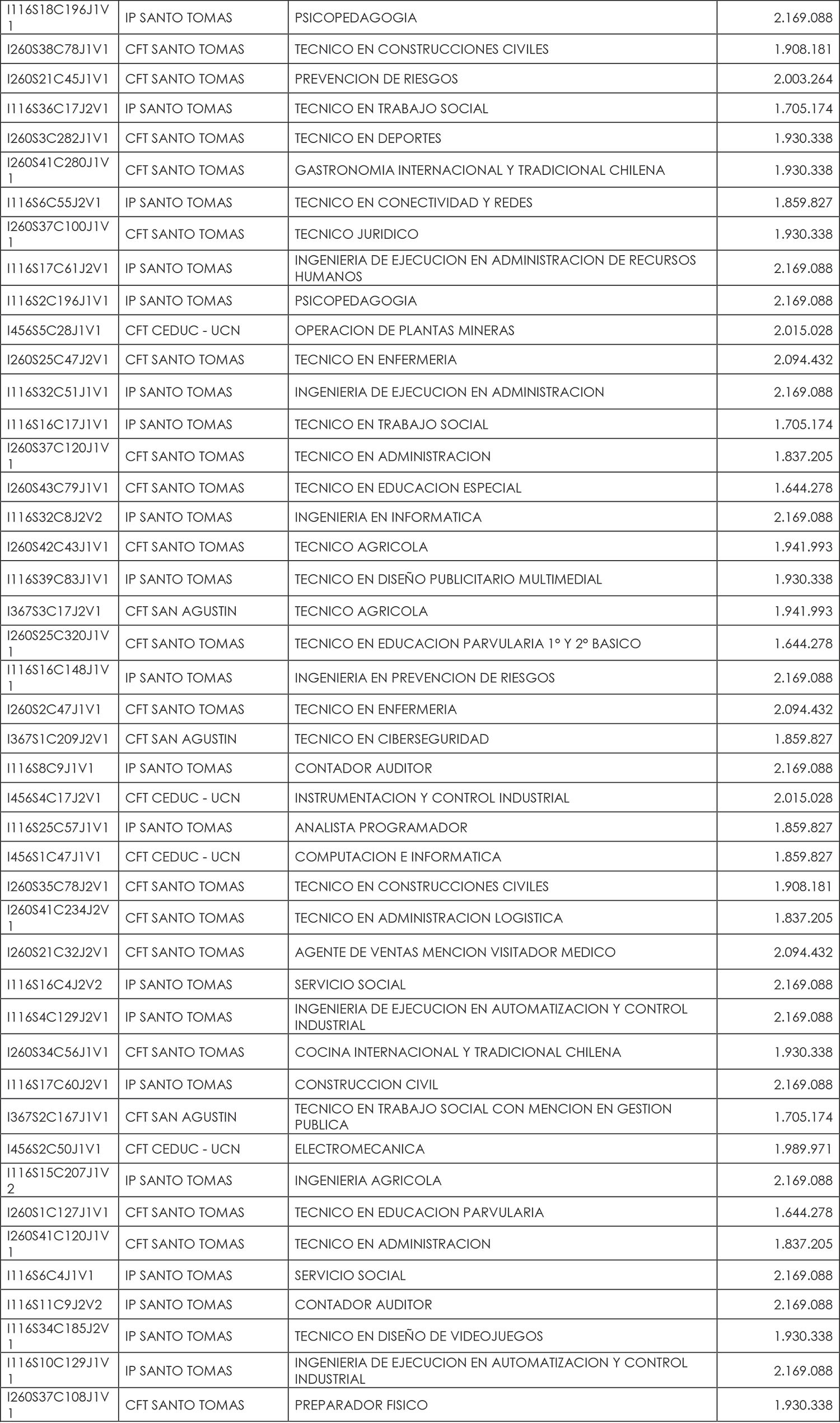 "Fíjase el arancel regulado para los programas impartidos por las Instituciones de Educación Superior adscritas a gratuidad, de conformidad al contenido de la siguiente tabla: