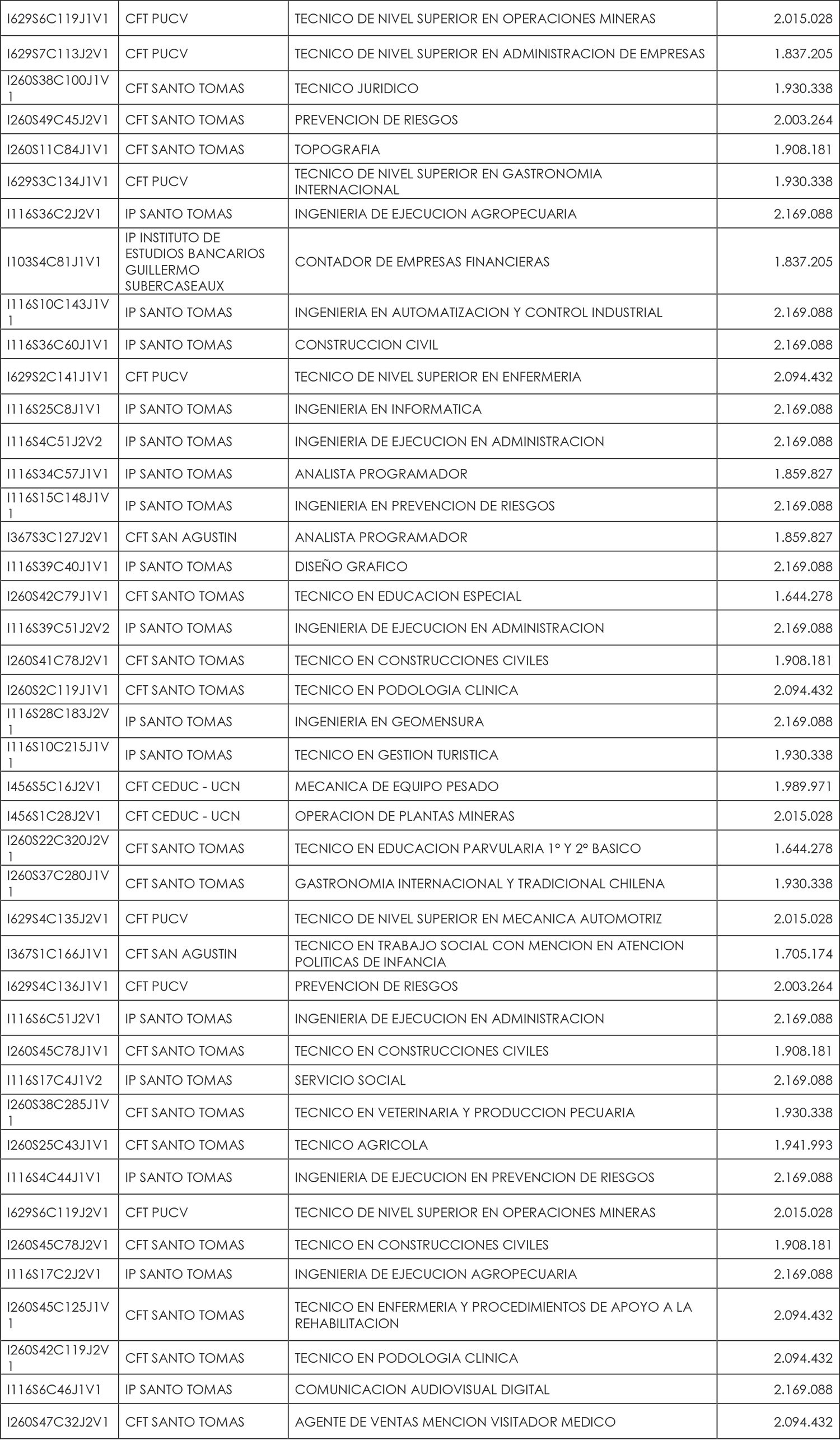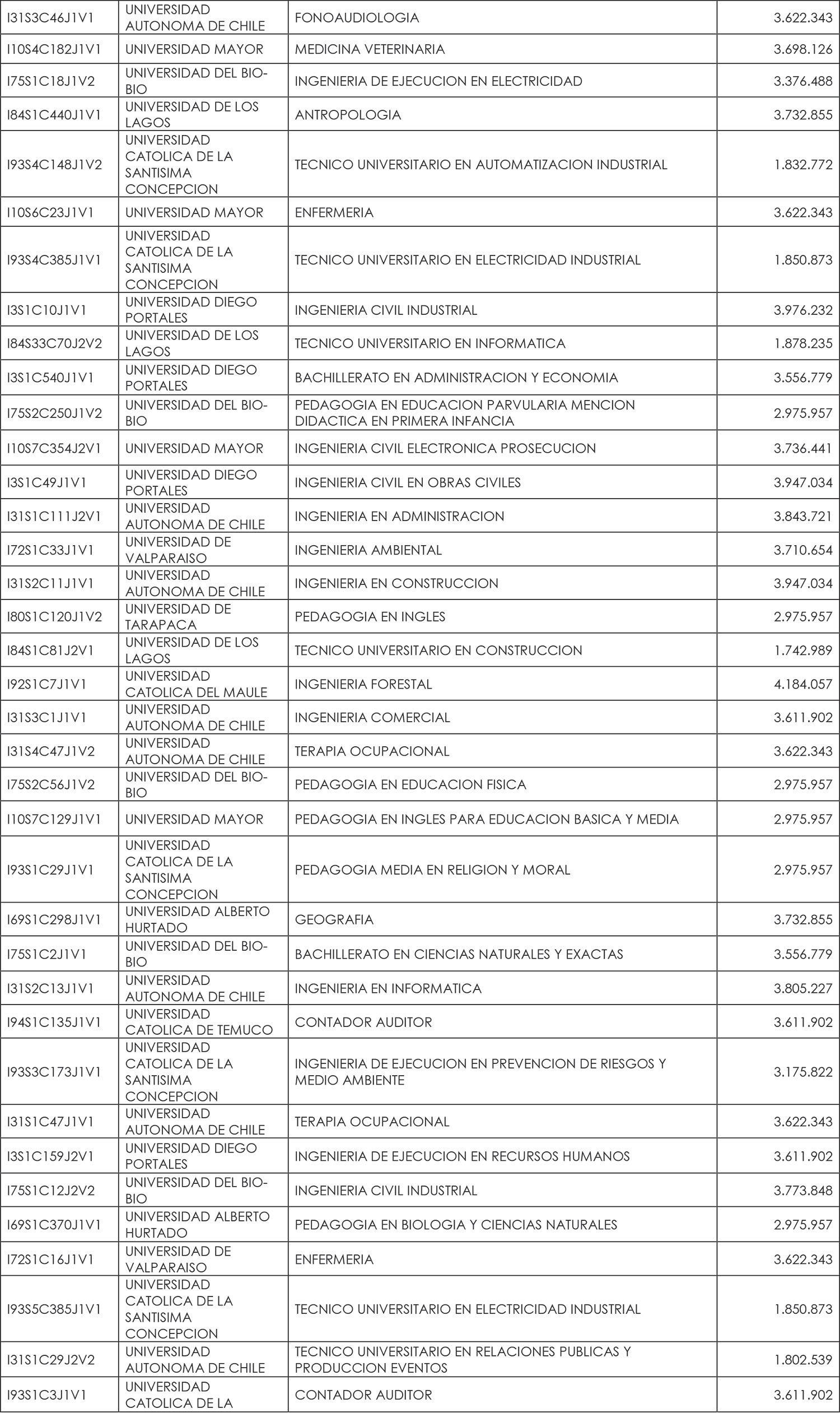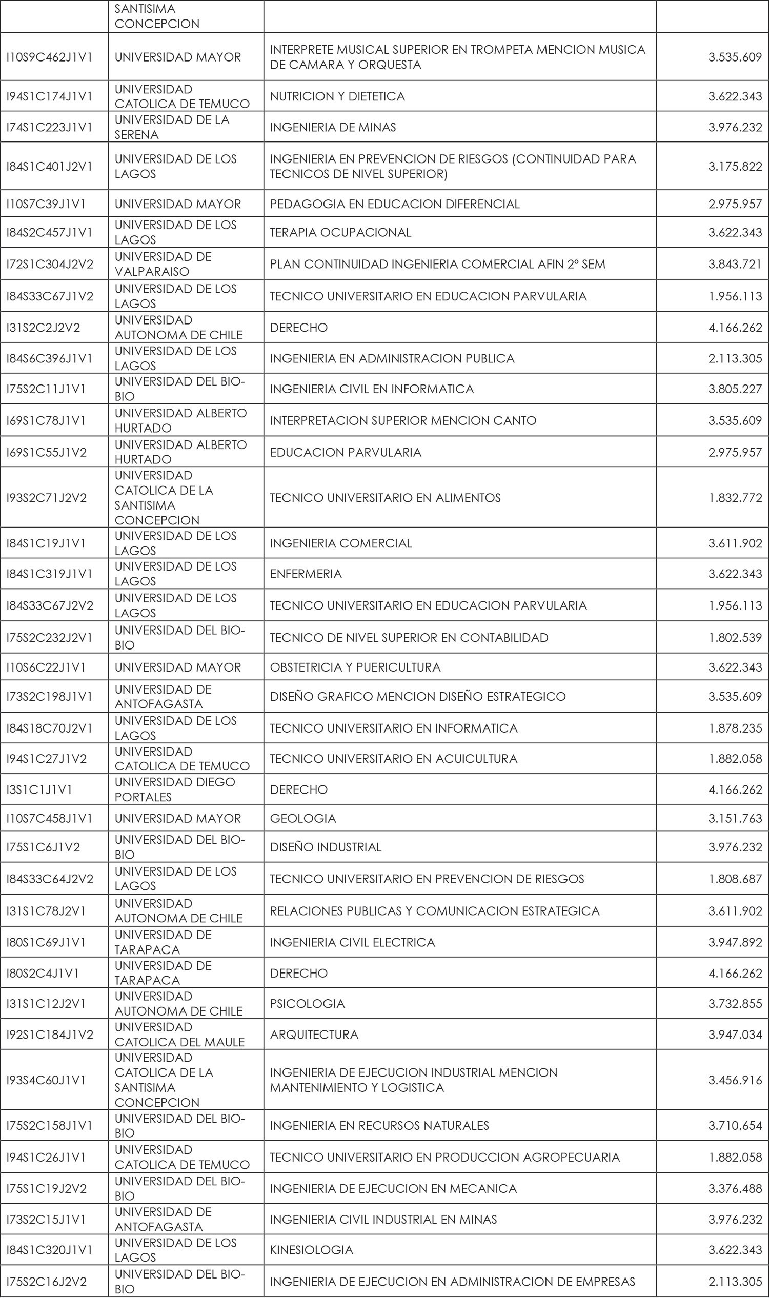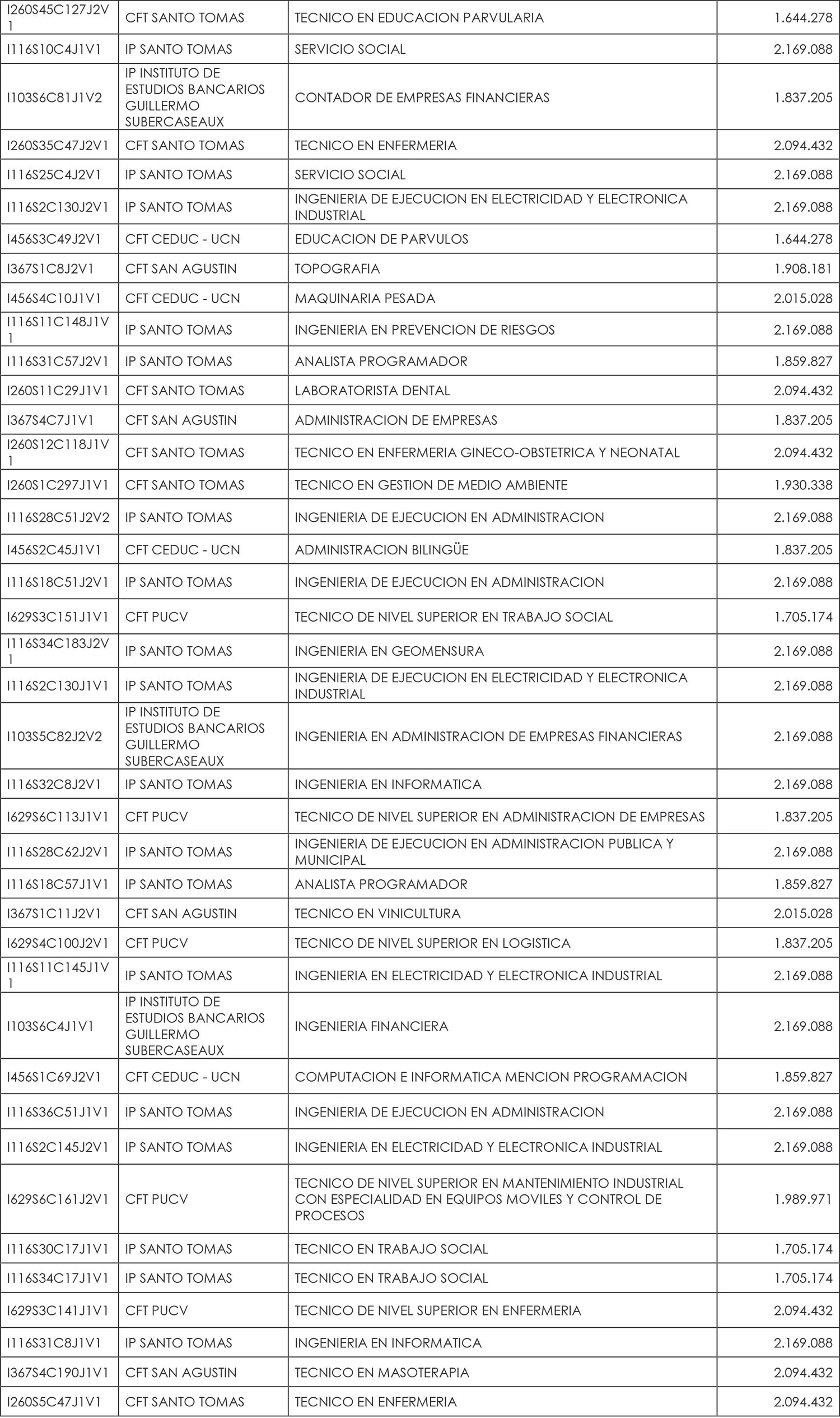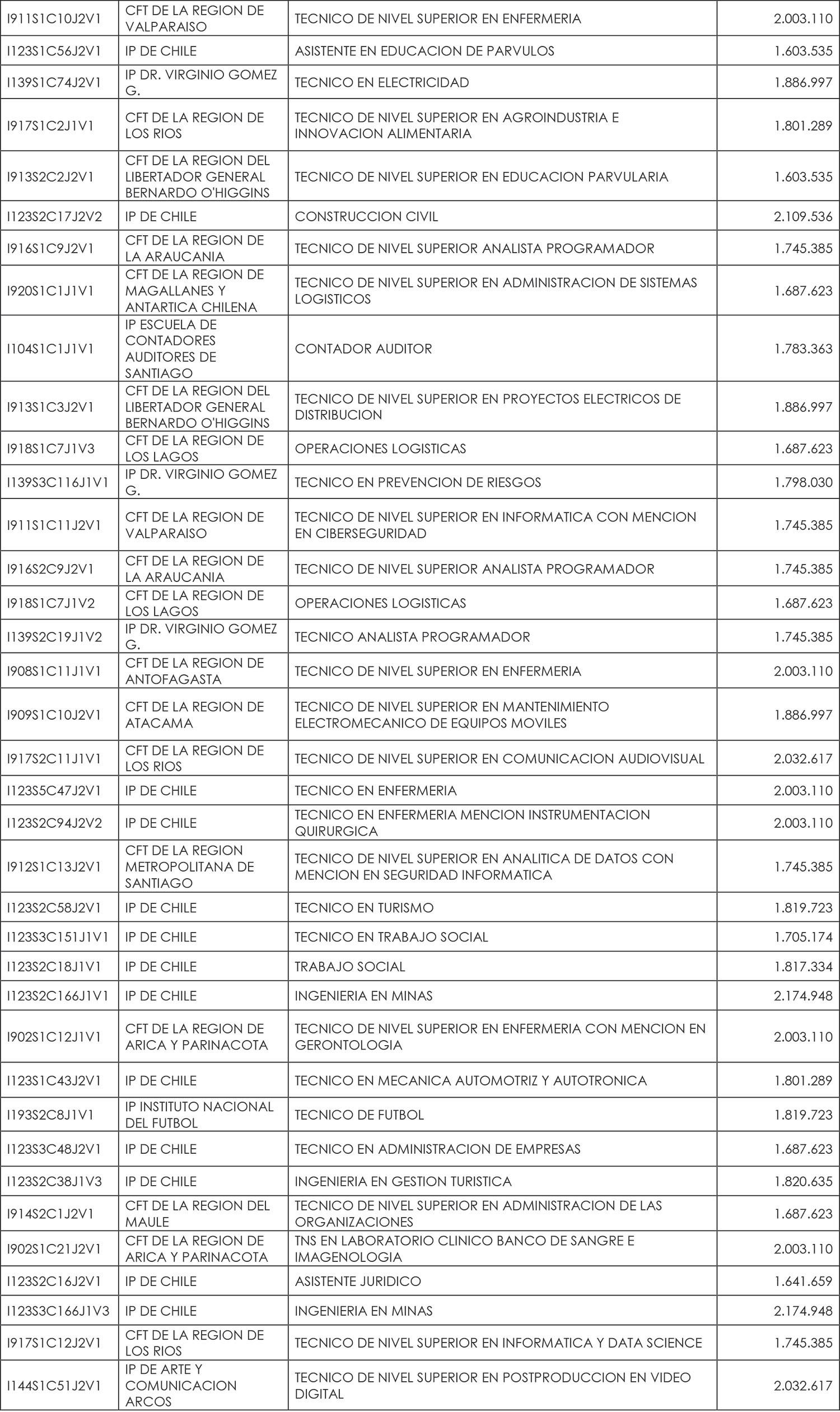 "Fíjase el arancel regulado para los programas impartidos por las Instituciones de Educación Superior adscritas a gratuidad, de conformidad al contenido de la siguiente tabla: