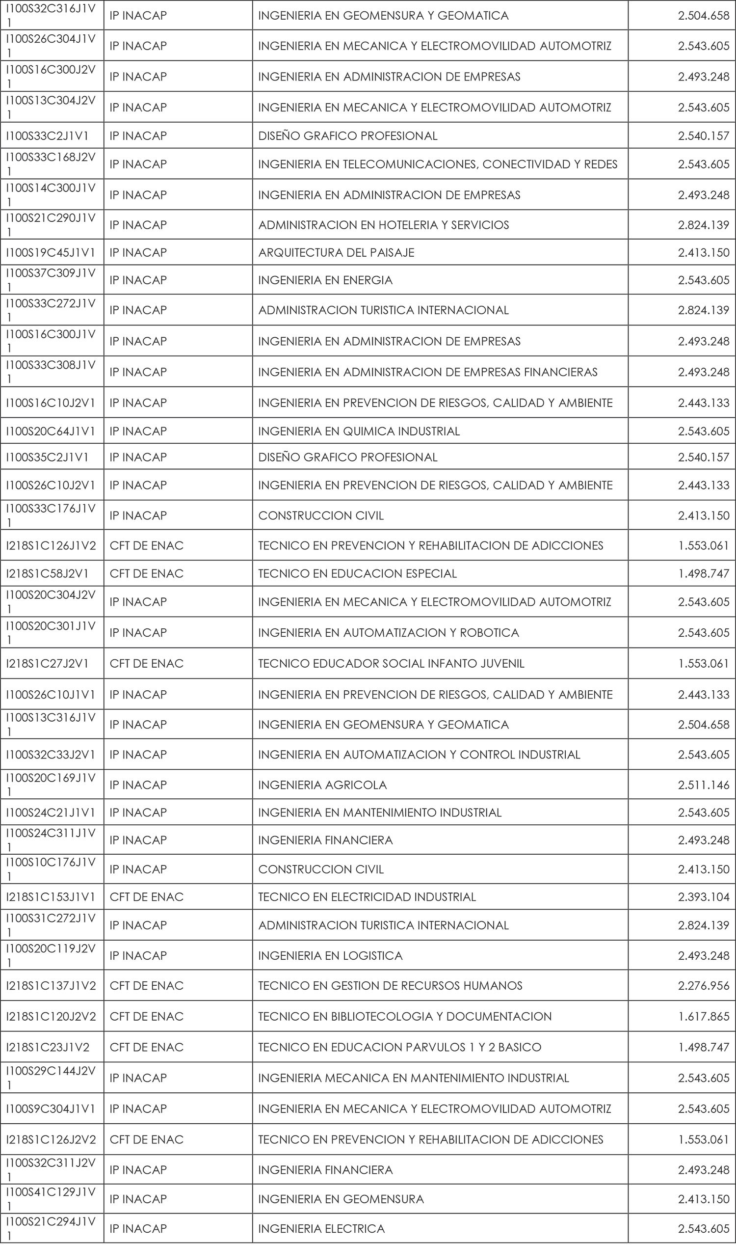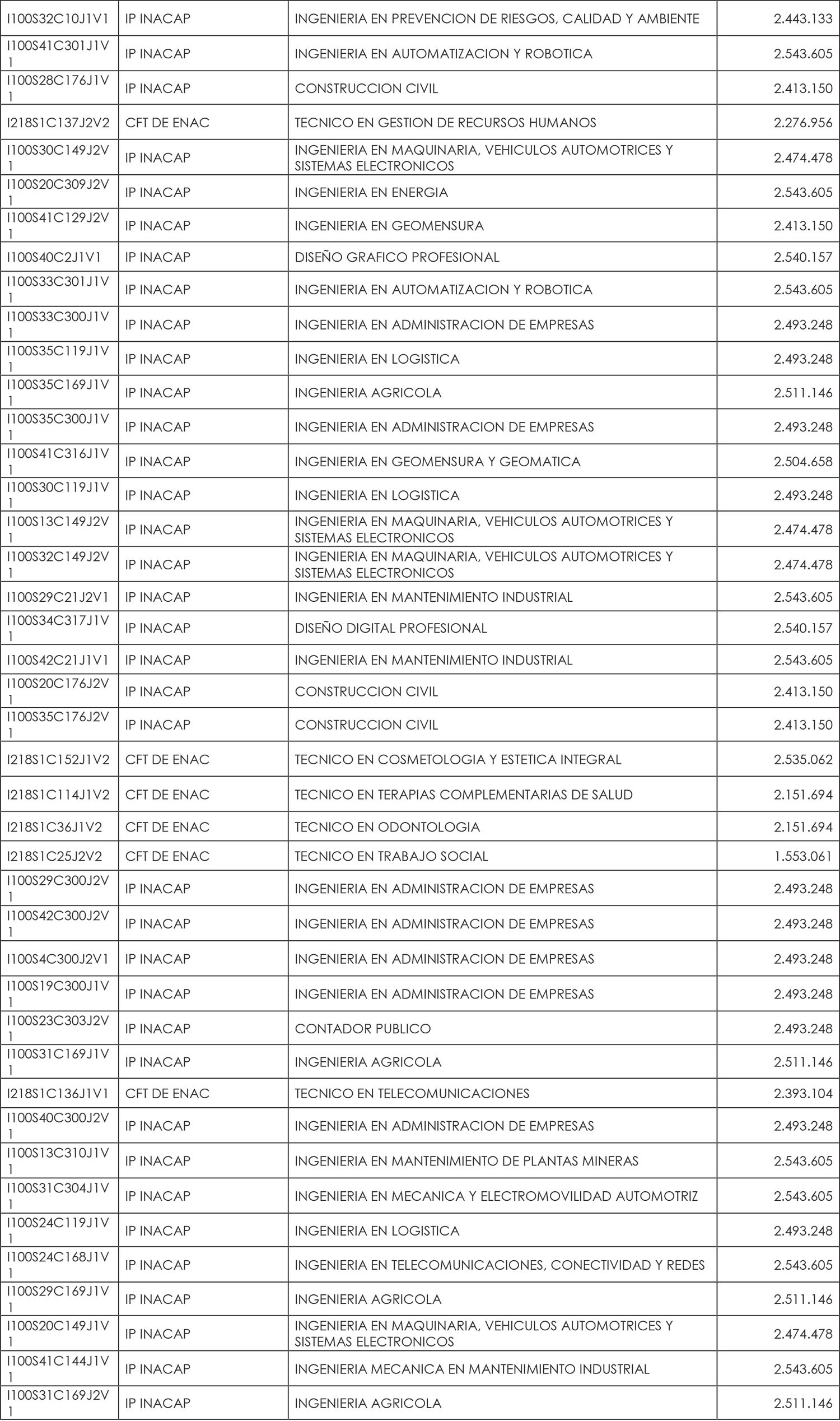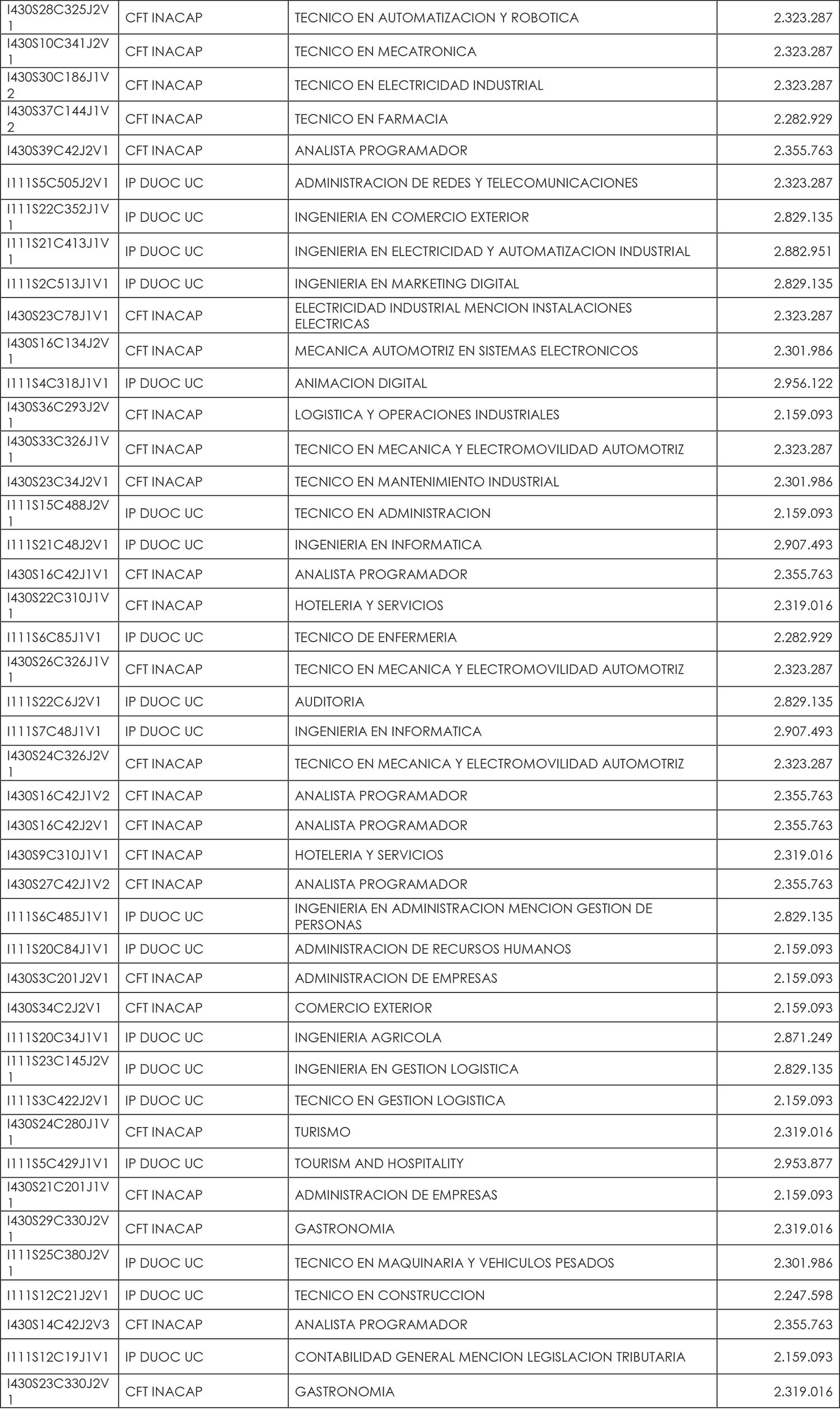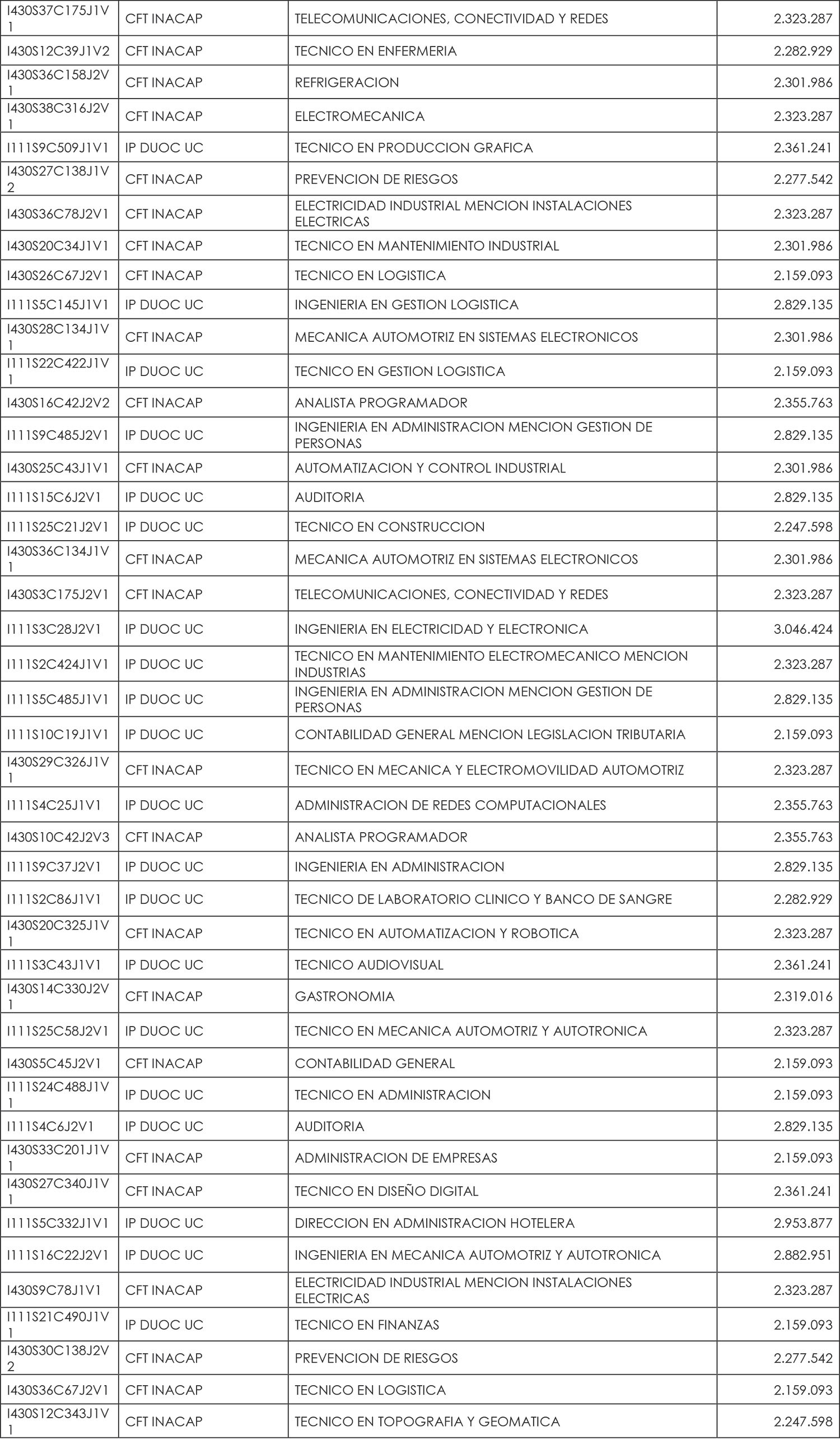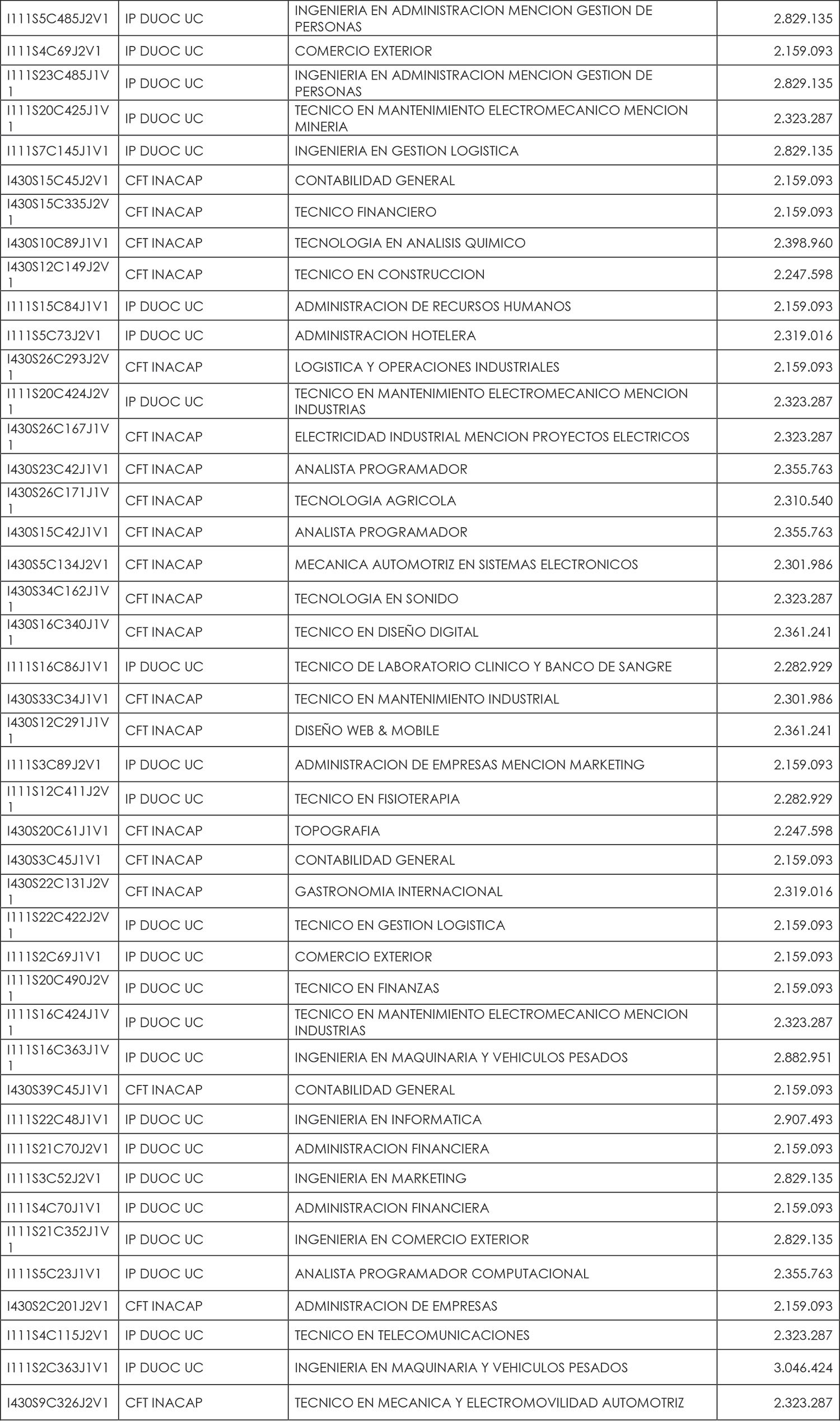 "Fíjase el arancel regulado para los programas impartidos por las Instituciones de Educación Superior adscritas a gratuidad, de conformidad al contenido de la siguiente tabla:
