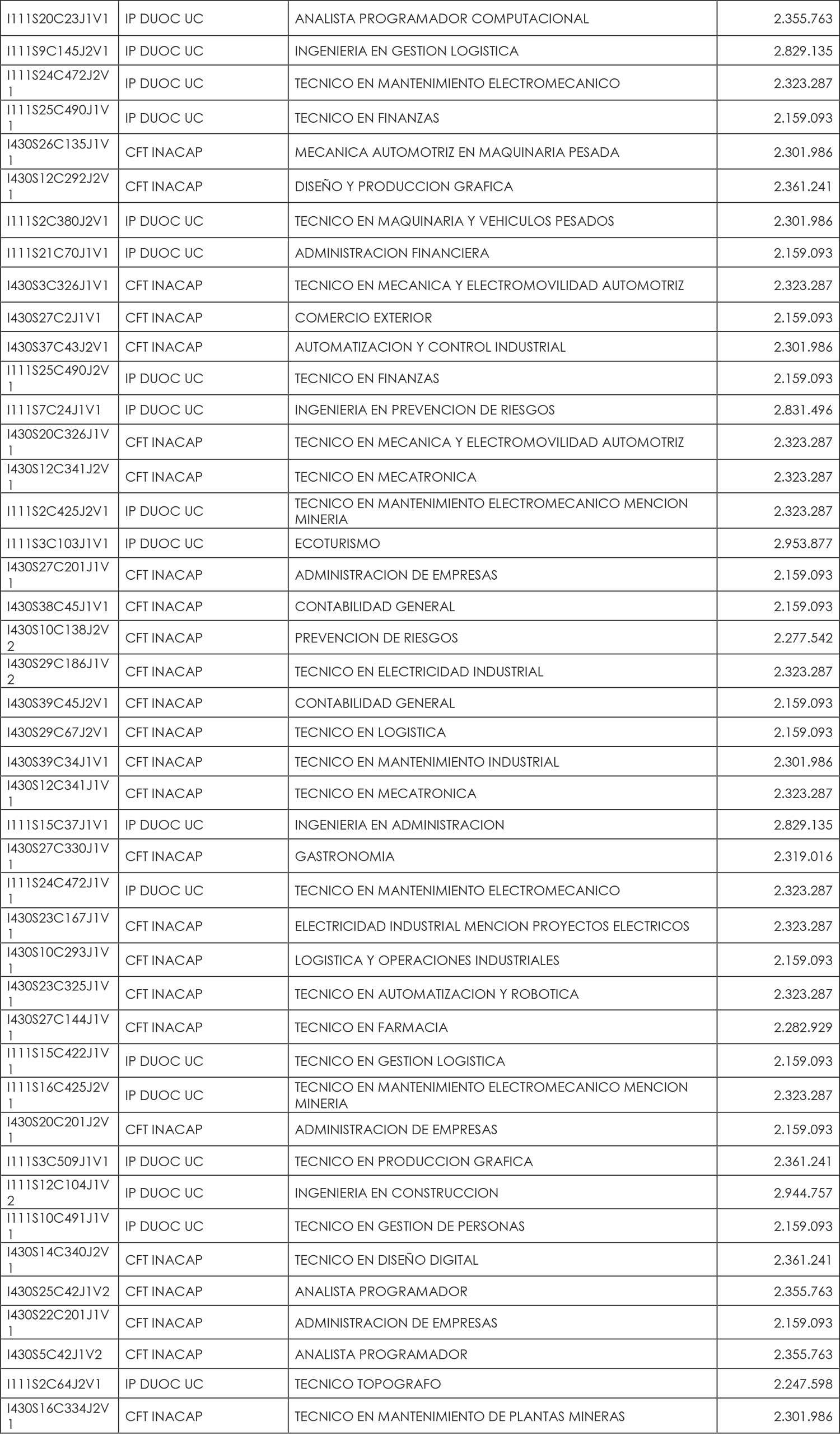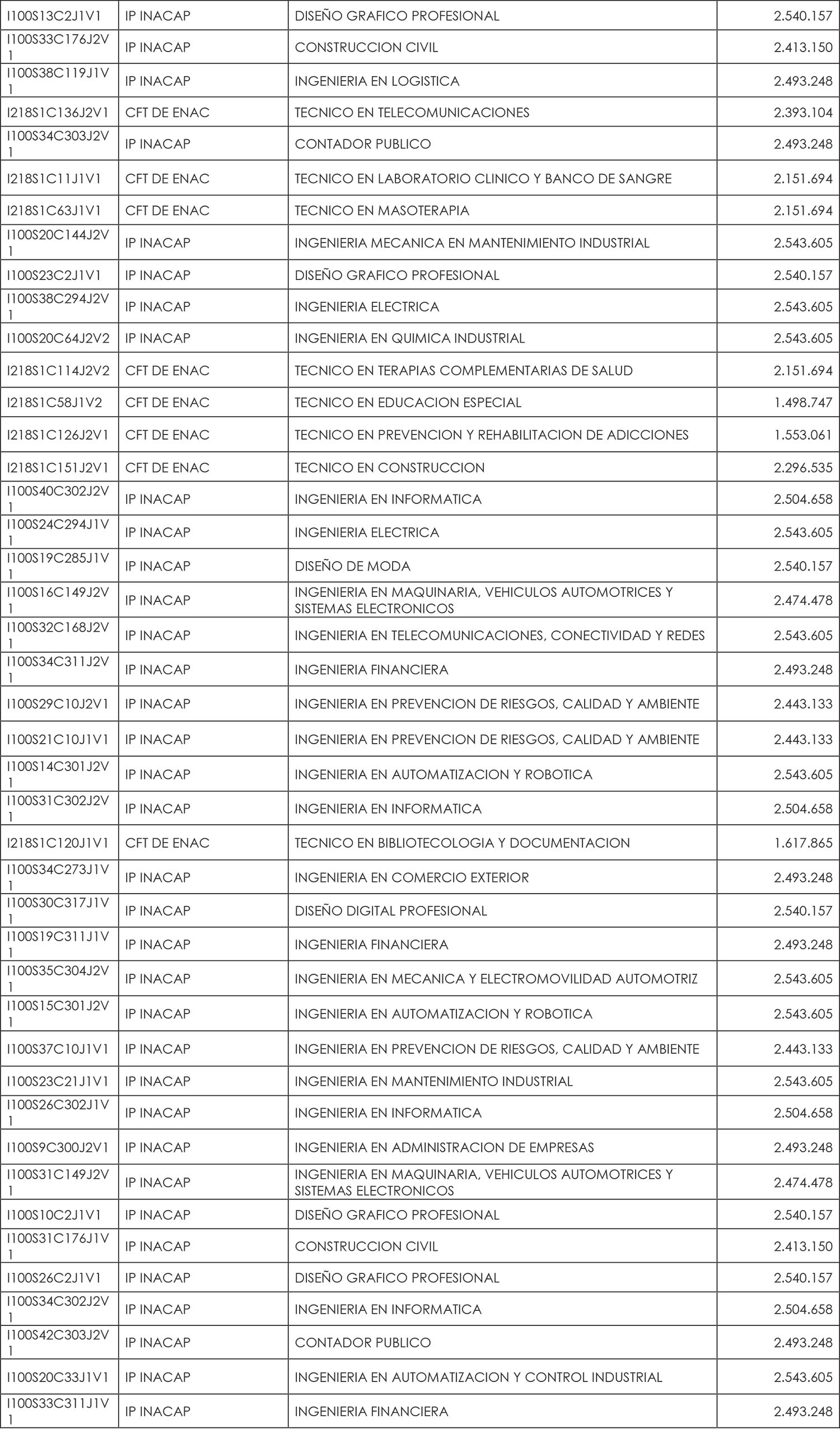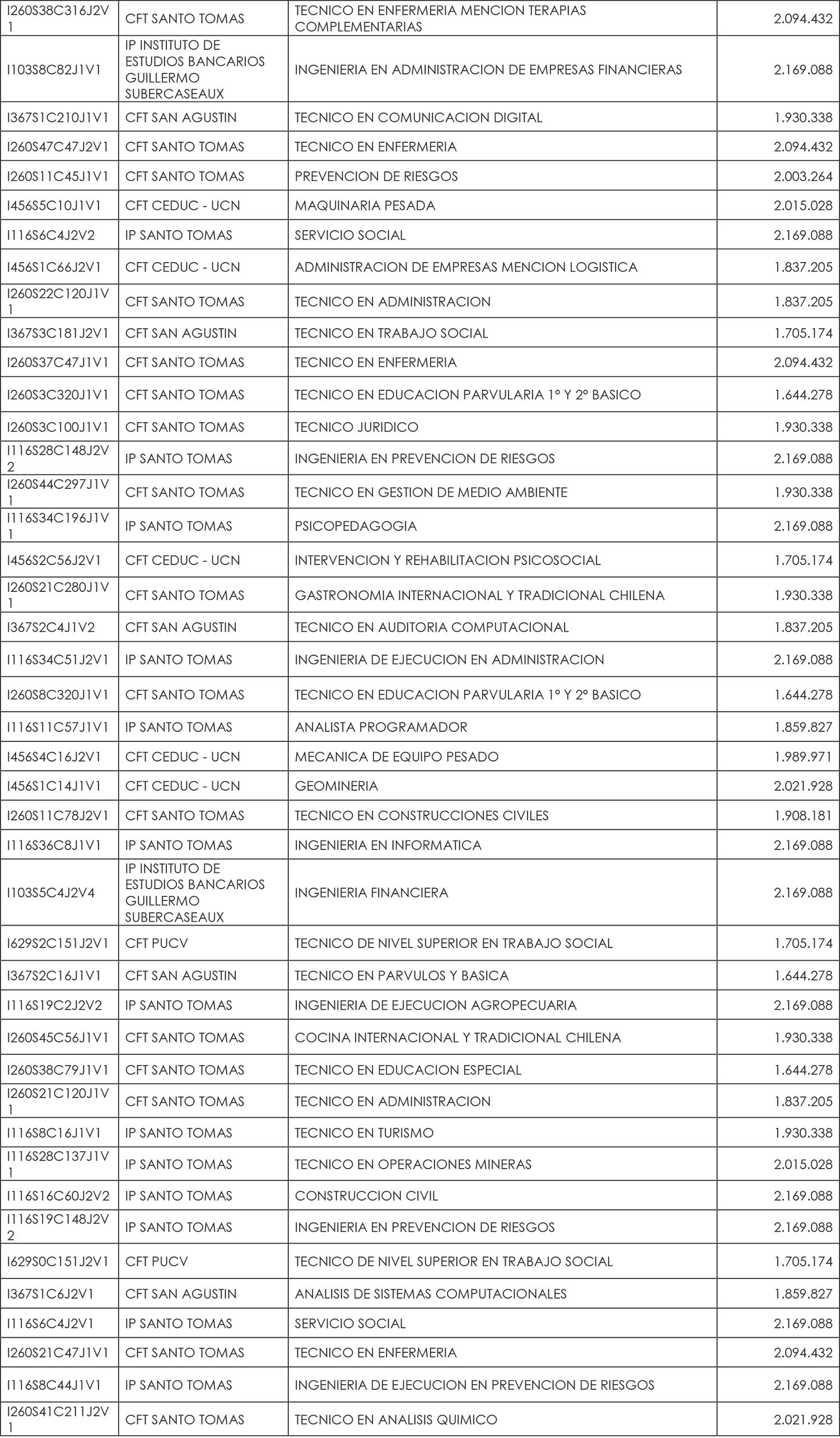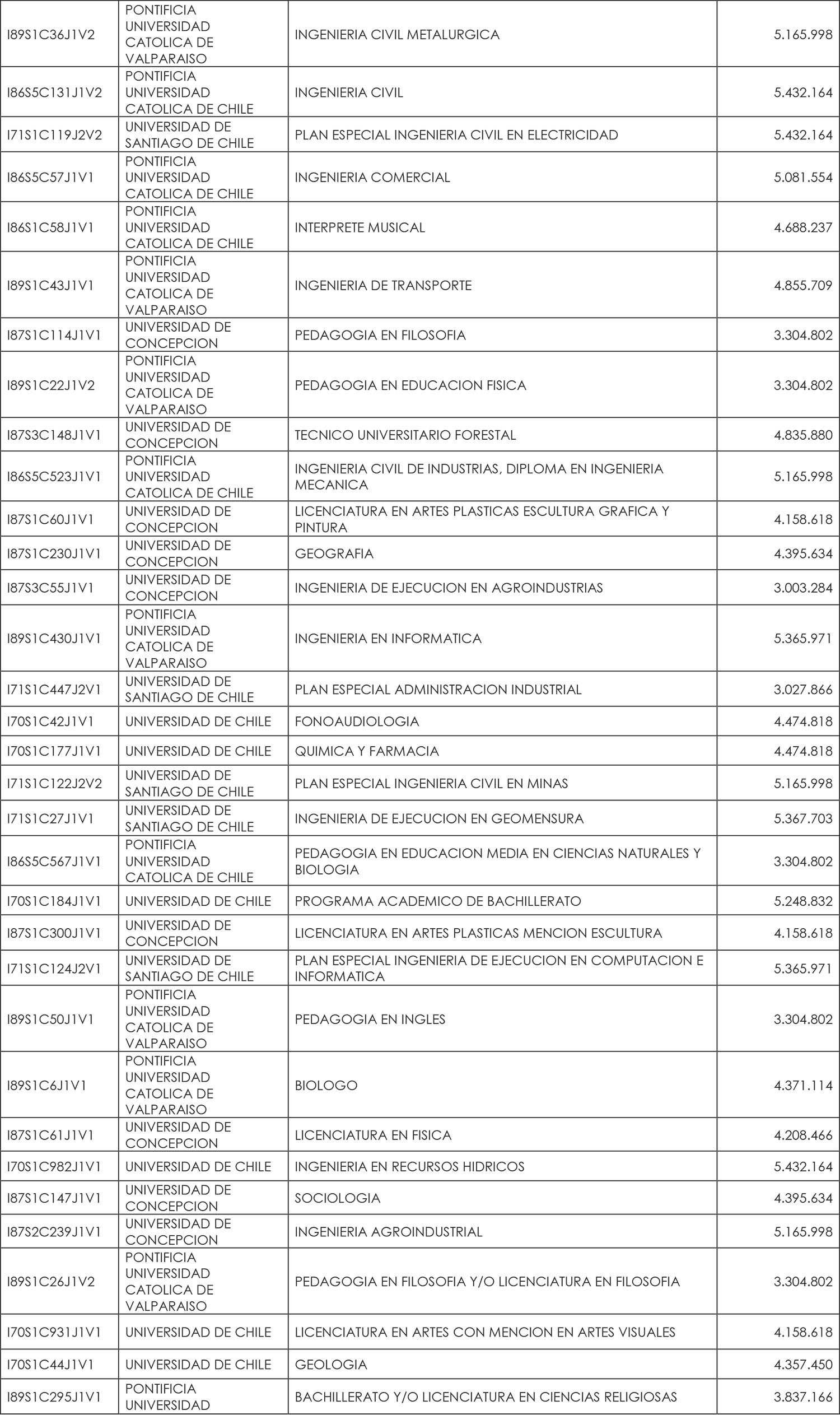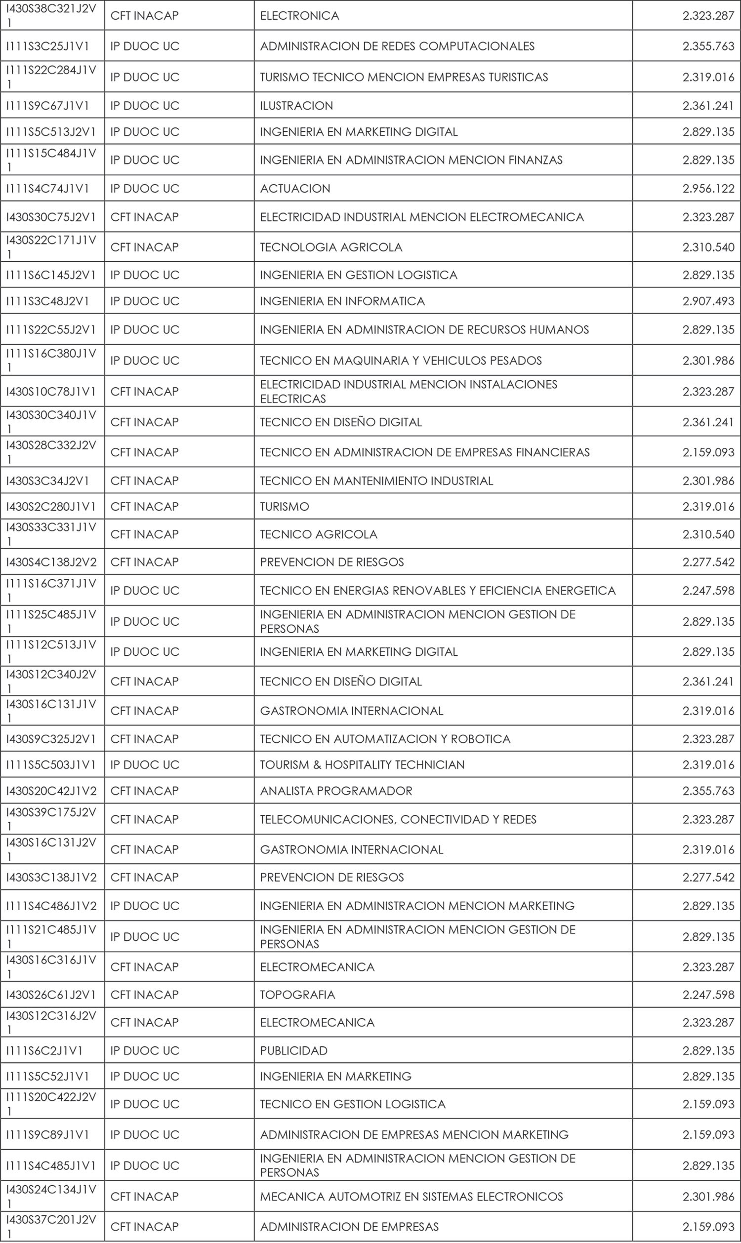 "Fíjase el arancel regulado para los programas impartidos por las Instituciones de Educación Superior adscritas a gratuidad, de conformidad al contenido de la siguiente tabla: