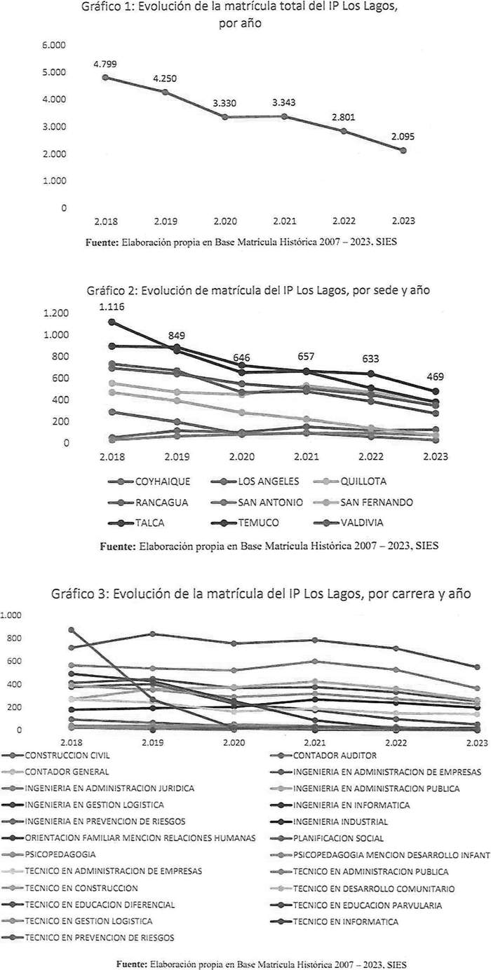 15º Que, por su parte, la División de Educación Técnico Profesional de nivel superior de la Subsecretaría, mediante memorándum Nº 06/1165, de fecha 18 de octubre de 2023, remitió un informe en el que, entre otras consideraciones y sobre la base de los datos reportados al Servicio de Información de la Educación Superior (SIES), concluye que la matrícula a nivel total del instituto profesional, como asimismo por sedes y carreras, ha sido decreciente en los últimos cinco años, proporcionando la siguiente información gráfica: