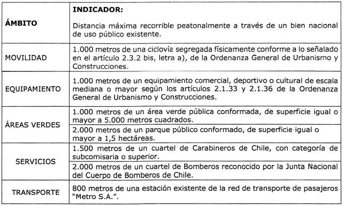 "Excepcionalmente en las comunas de Santiago, Independencia, Recoleta, Providencia, Ñuñoa, San Joaquín, San Miguel, Pedro Aguirre Cerda, Estación Central y Quinta Normal, el subsidio diferenciado de localización señalado podrá alcanzar un valor de 600 Unidades de Fomento, siempre que las viviendas construidas a adquirir cumplan con 4 de los indicadores que se señalan a continuación: