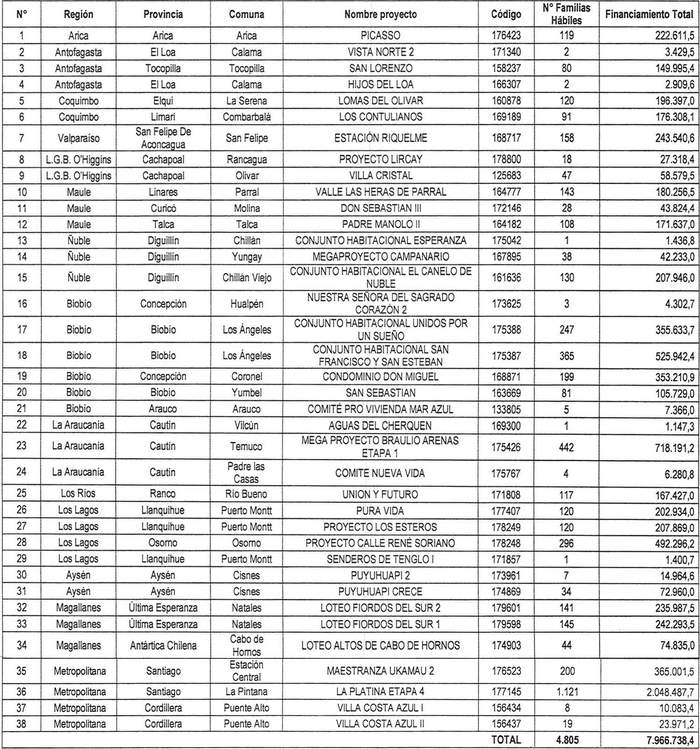 3. Apruébase la siguiente nómina de proyectos seleccionados, con su respectivo financiamiento total, para el otorgamiento de subsidios del Programa Habitacional Fondo Solidario de Elección de Vivienda en la alternativa de postulación colectiva, para los proyectos de Construcción en Nuevos Terrenos en las Regiones de Arica y Parinacota, de Antofagasta, de Coquimbo, de Valparaíso, de O'Higgins, de Maule, de Ñuble, del Biobío, de La Araucanía, Los Ríos, de Los Lagos, de Aysén del General Carlos Ibáñez del Campo, Magallanes y Metropolitana, correspondiente al proceso de selección cuyo cierre de postulación se verificó el día 28 de septiembre de 2023, del llamado efectuado por resolución exenta N° 663 (V. y U.), de 2023: