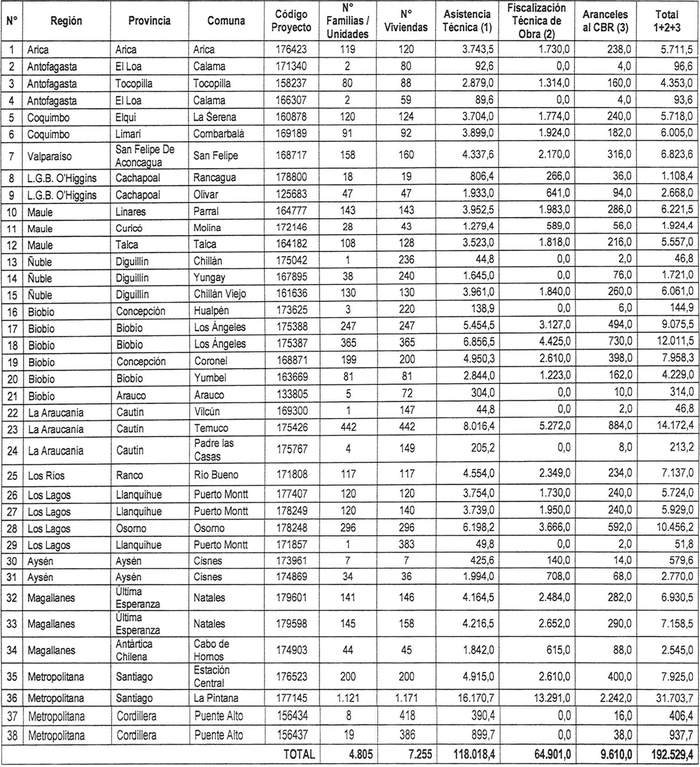 4. El monto del subsidio asignado de conformidad con el cuadro del resuelvo 3. de esta resolución comprende los siguientes valores por concepto de Servicios de Asistencia Técnica, de Labores de Fiscalización Técnica de Obras y pago de Aranceles al Conservador de Bienes Raíces: