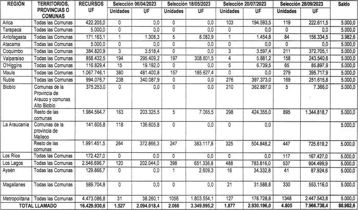 5. Los recursos comprometidos en el Resuelvo 3. de la presente resolución, para los proyectos seleccionados en el cierre de postulación efectuado el día 28 de septiembre de 2023, del concurso a que se llamó mediante la resolución exenta N° 663 (V. y U.), de 2023, se resumen en el siguiente cuadro para cada región del país, incluyendo la suma total de familias beneficiadas y las Unidades de Fomento comprometidas, considerando los montos de subsidio de los proyectos, incluidos sus respectivos servicios de asistencia técnica y fiscalización técnica de obras: