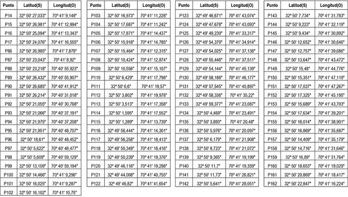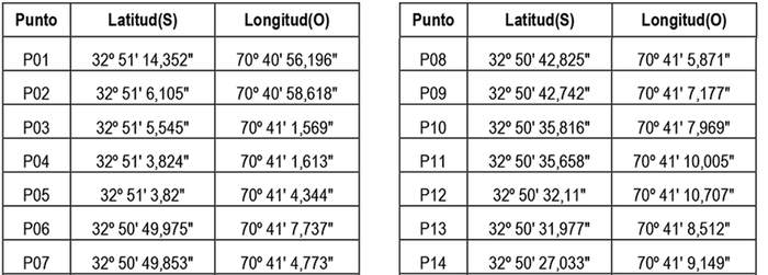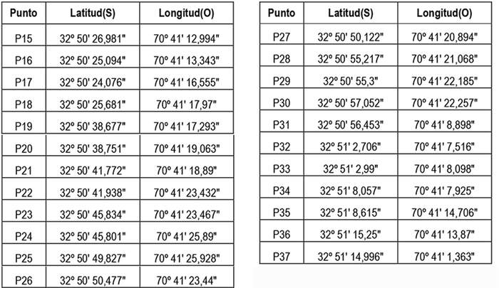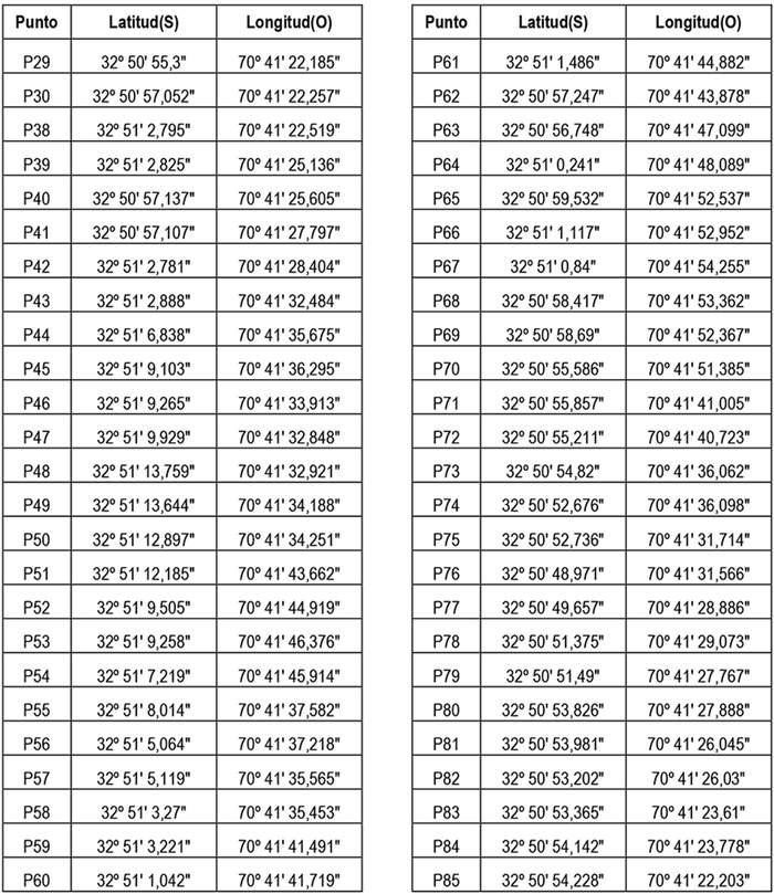 1. Autorízase a la concesionaria a modificar su concesión en el sentido de ampliar su zona de servicio a la comuna de Rinconada, Región de Valparaíso, con el objeto de incorporar los siguientes puntos geográficos (Datum WGS84), conformado por la unión circundada de ellos, incluyendo las edificaciones de sus respectivos costados exteriores: