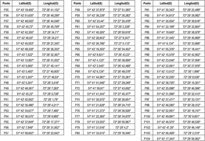 1. Autorízase a la concesionaria a modificar su concesión en el sentido de ampliar su zona de servicio a la comuna de Natales, Región de Magallanes y de la Antártica Chilena, con el objeto de incorporar, los siguientes puntos geográficos (Datum WGS84), conformado por la unión circundada de ellos, incluyendo las edificaciones de sus respectivos costados exteriores: