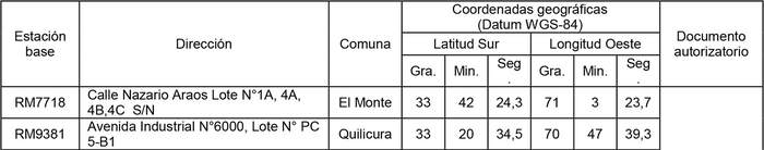 1. Autorízase a la concesionaria para modificar nombre, dirección y coordenadas geográficas de cinco (5) Estaciones Base, autorizadas por decreto supremo Nº 32, de 2021, según se indica a continuación: