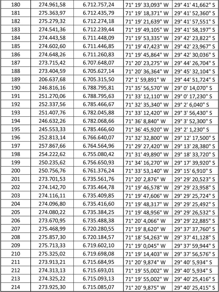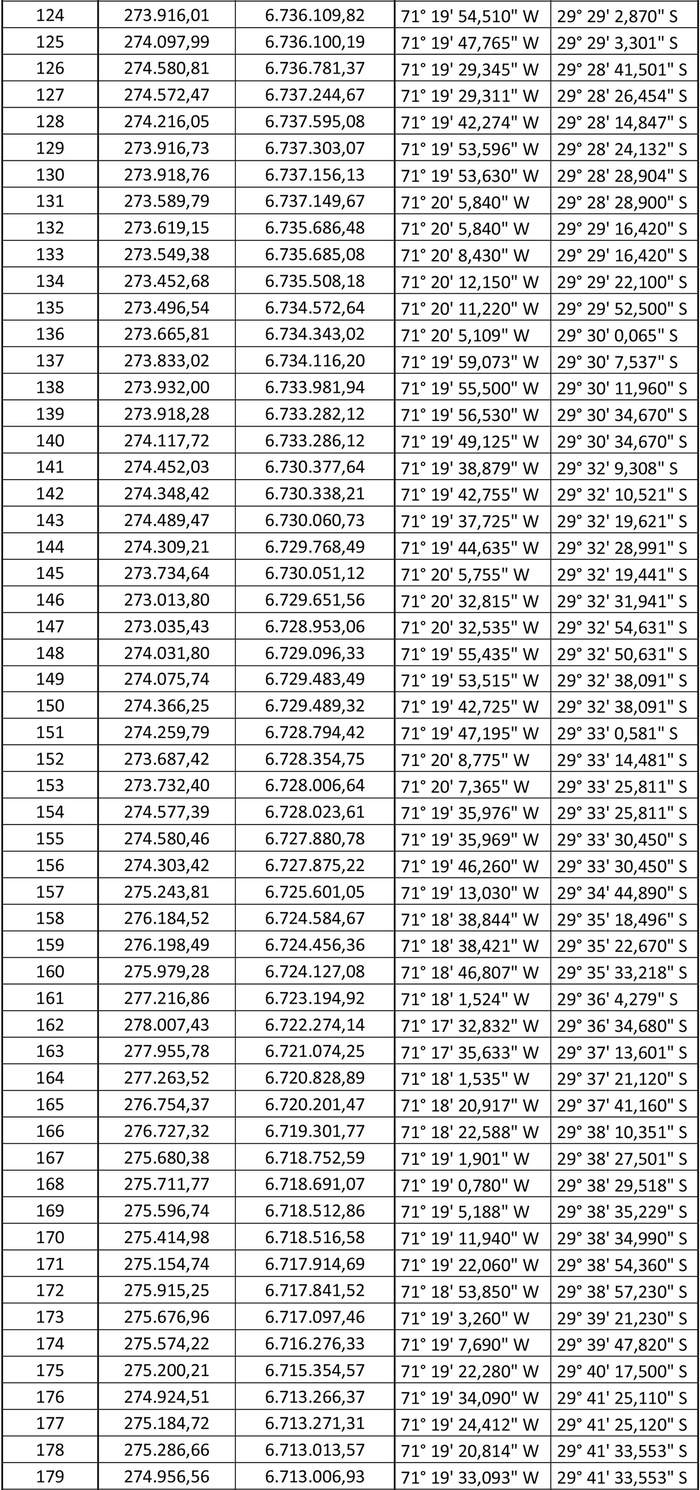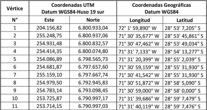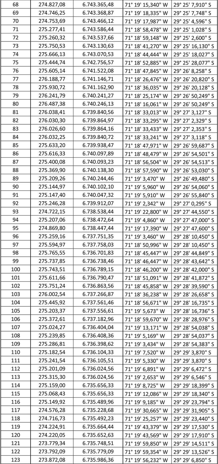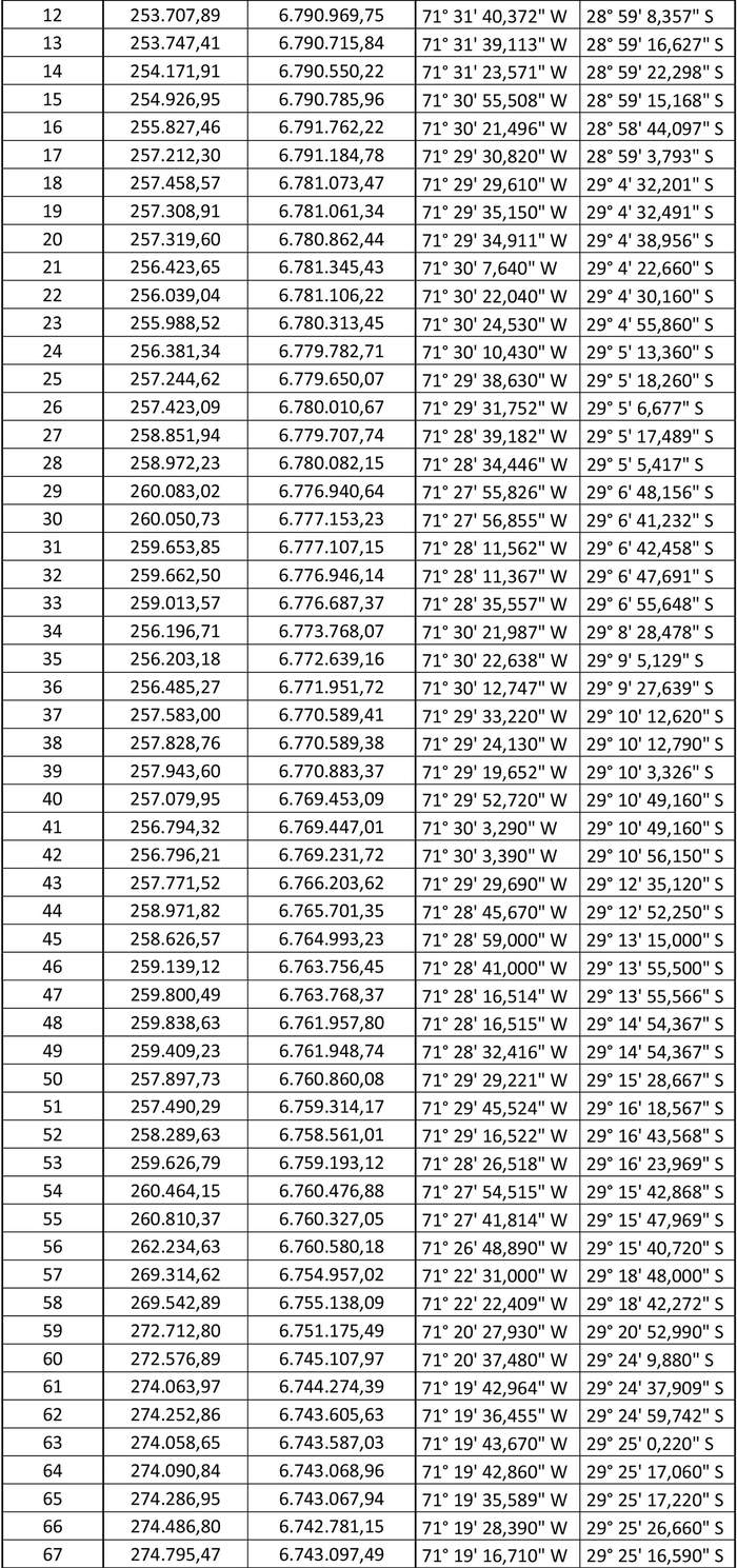 Artículo 2°. Límites y coordenadas. El área propuesta se extiende desde su límite norte por el sector de Punta Pájaros, comuna de Freirina (Región de Atacama), hasta Punta Poroto en su límite sur, comuna de La Serena (Región de Coquimbo). Los límites del área marina costera protegida de múltiples usos –incluyendo las porciones que no forman parte del polígono-, se encuentran representados en el mapa adjunto, se detallan en coordenadas geográficas, Datum WGS84 y coordenadas proyectadas UTM Datum WGS84 Huso 19 sur, y son las siguientes: