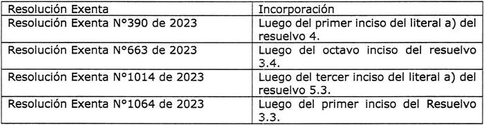 1. Incorpórase, según se indica en la siguiente tabla, el siguiente inciso en las resoluciones exentas citadas en los vistos c), d), f) y g):