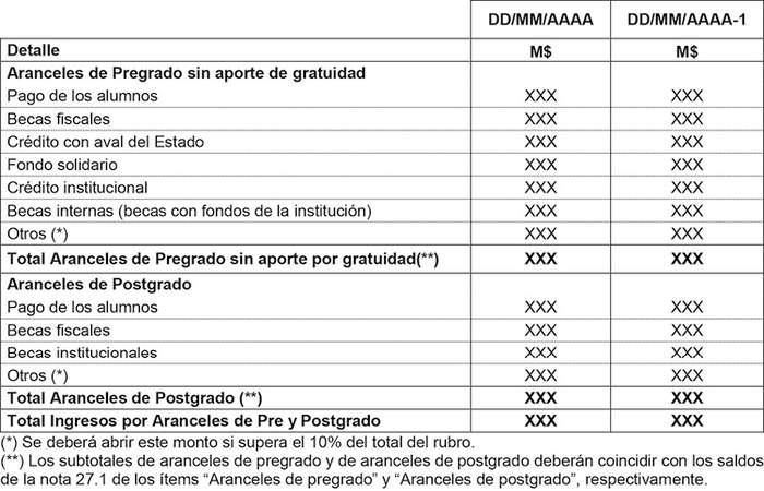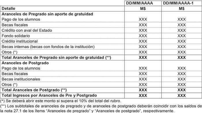 27.2. Detalle de los ingresos (devengados) por aranceles de Pre y Postgrado según tipo de financiamiento: