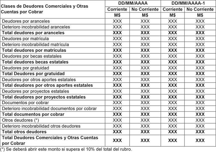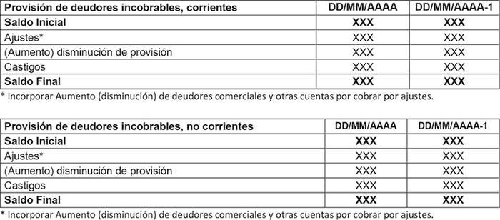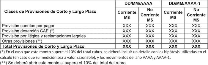 La institución deberá detallar las clases de provisiones en el siguiente cuadro: