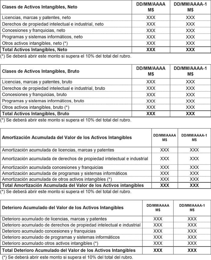 Incluir el detalle de la información por clases para activos intangibles, desglosados entre valores neto, bruto, amortización y deterioro, en los siguientes cuadros: