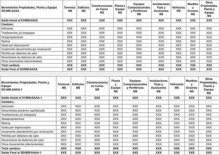 19.2. En el cuadro siguiente se deberán revelar los movimientos de las distintas categorías de propiedades, planta y equipo: