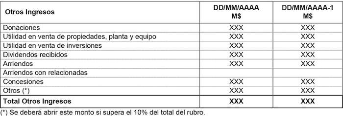 La entidad deberá incluir un detalle y descripción de los otros ingresos en el siguiente cuadro: