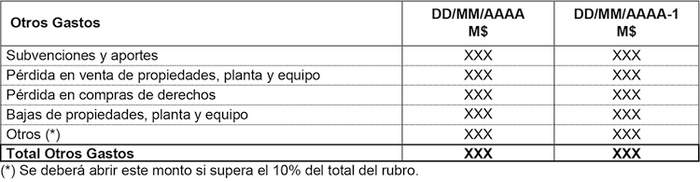 La entidad deberá incluir un detalle y descripción de los otros gastos, por función del periodo, en el siguiente cuadro: