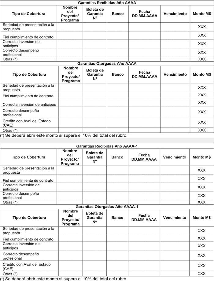 En esta nota, la entidad deberá indicar en cuadros separados las garantías recibidas u otorgadas de acuerdo con los siguientes cuadros: