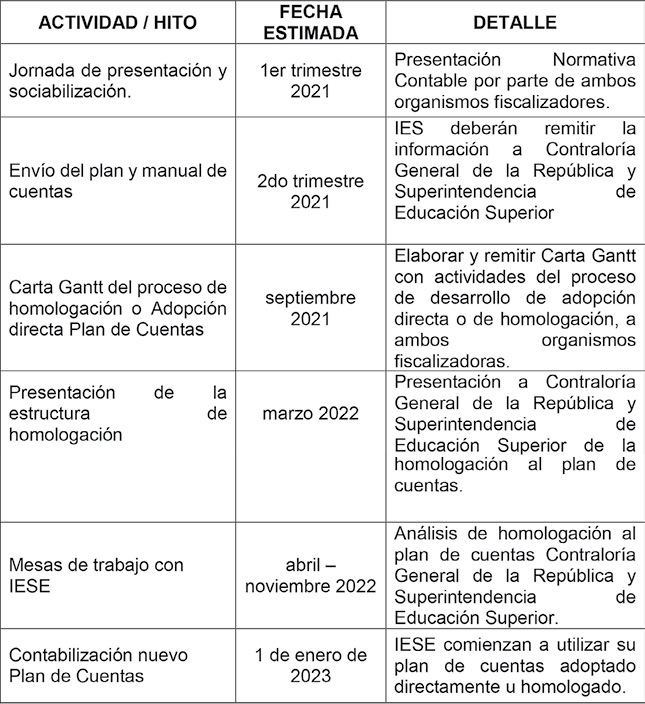 Las IESE deberán desarrollar un plan de trabajo para la homologación del plan de cuentas CGR SES, entre los meses de septiembre y diciembre 2021, para lo cual deberán elaborar y presentar a la Contraloría General de la República y a la Superintendencia de Educación Superior una Carta Gantt de este proceso. De igual forma, deberá proceder en caso de una adopción directa del plan de cuentas.