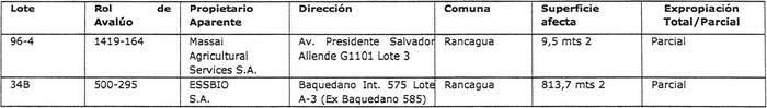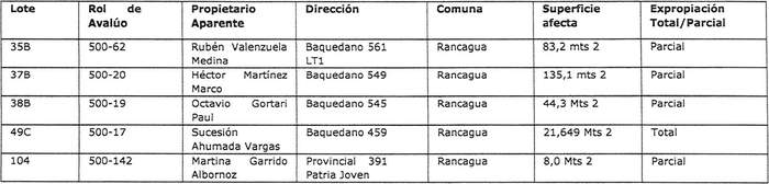 b) Elimínanse, del Programa de Expropiación denominado "Ampliación Avenida Baquedano", de la comuna de Rancagua, Región de O'Higgins, los siguientes lotes:
