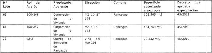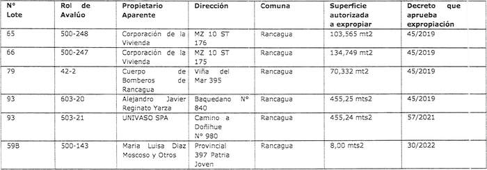a) Que por medio del ordinario Nº 585, de fecha 14 de febrero de 2023, del Serviu de la Región de O'Higgins y sus anexos, solicita a esta Secretaria de Estado, dictar decreto de expropiación para el desarrollo del Proyecto Ampliación de la Avenida Baquedano en la comuna de Rancagua, aumentando su superficie en los lotes que se identifican a continuación: