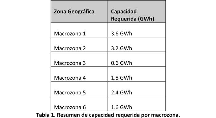 Conforme se indicará en los numerales siguientes, por parte del Ministerio de Energía, se realizará un análisis técnico, a partir del cual se seleccionarán los proyectos que contemplen una mayor capacidad de almacenamiento (MWh) en aquella subestación eléctrica a la que se postule, teniendo en consideración en todo momento que la sumatoria de los proyectos comprometidos en las subestaciones específicas, no sea superior a la capacidad de almacenamiento identificada por el Coordinador Eléctrico Nacional en la siguiente tabla, por cada una de las macrozonas geográficas: