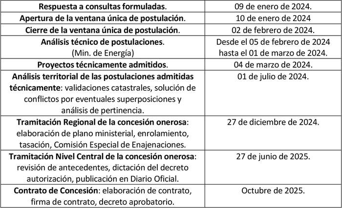Para ello, se establecerá una ventana única de tiempo para que los particulares interesados en el desarrollo de este tipo de tecnología puedan ingresar una o más postulaciones a terrenos fiscales, debiendo presentar un proyecto que cumpla las condiciones que se indicarán a continuación, para adjudicarse la concesión onerosa por vía directa del inmueble respectivo.
