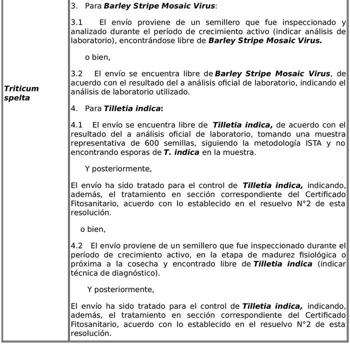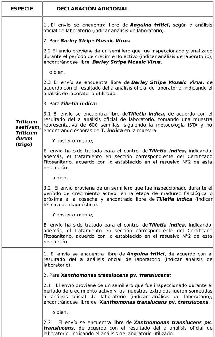 1. Se modifica la resolución Nº 1.187 de 2022, que aprueba texto coordinado y sistematizado de la resolución que establece requisitos fitosanitarios de ingreso para semillas de cereales, para lo cual, se reemplaza en el resuelvo número 1.1, la declaración adicional para las especies Triticum aestivum, Triticum durum (trigo) y Triticum spelta, quedando de la siguiente manera: