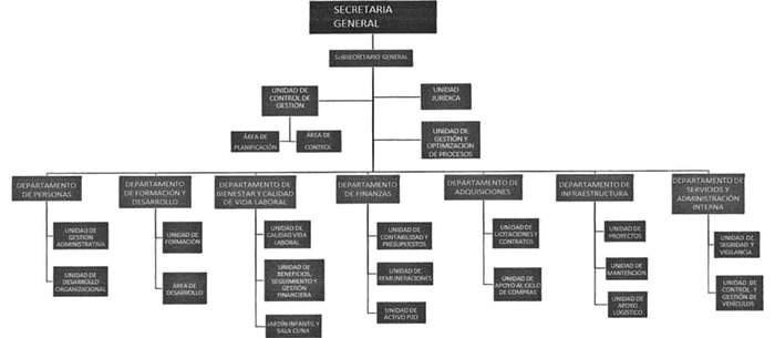 7. Que, sin embargo, al analizar su estructura, se advierte que con las diversas modificaciones que se le efectuaron en el presente año, la Secretaría General aumentó sus jefaturas, pasando a contar con 31, para una dotación funcionarial de 231 personas, lo que representa un 10,58% de la dotación total de la institución. A su vez, posee 7 Departamentos y 22 unidades o áreas, como se aprecia en el organigrama vigente: