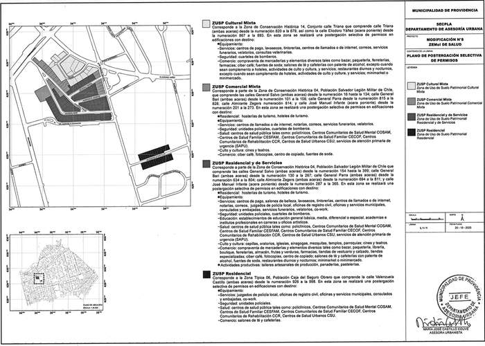 ZUSP Residencial y de Servicios: Corresponde a parte de la Zona de Conservación Histórica 04, Población Salvador Legión Militar de Chile que comprende las calles General Salvo (ambas aceras) desde la numeración 154 hasta la 399; calle General Barí (ambas aceras) desde la numeración 130 a la 267; calle General Parra (ambas aceras) desde la numeración 634 a la 828; calle Almirante Zegers (ambas aceras) desde la numeración 694 a la 811; y calle José Manuel Infante (acera poniente) desde la numeración 287 a la 365. En esta zona se realizará una postergación selectiva de permisos en edificaciones con destino: