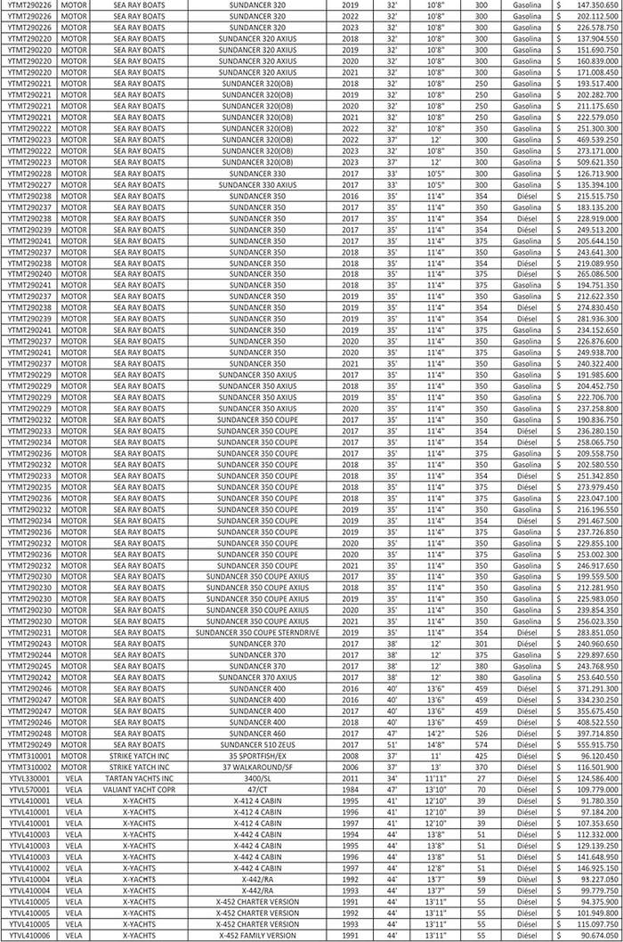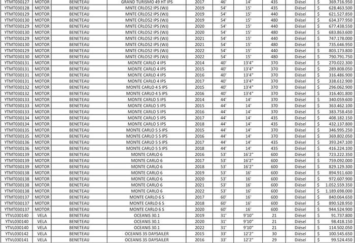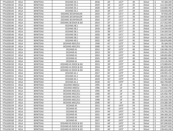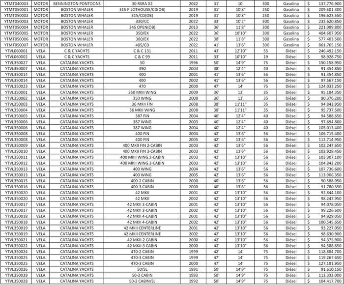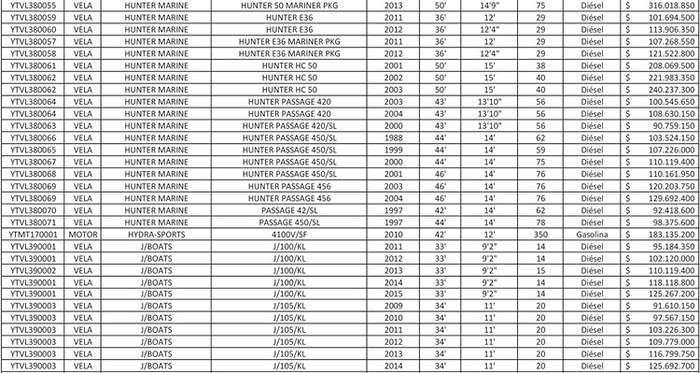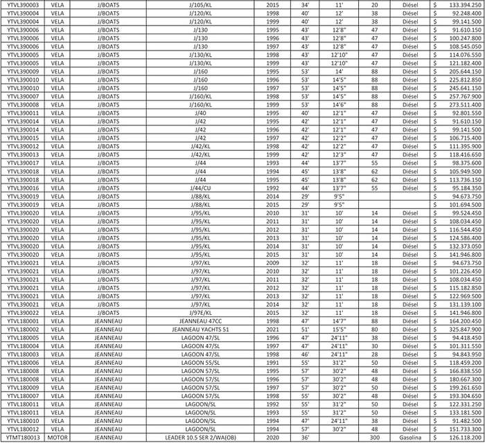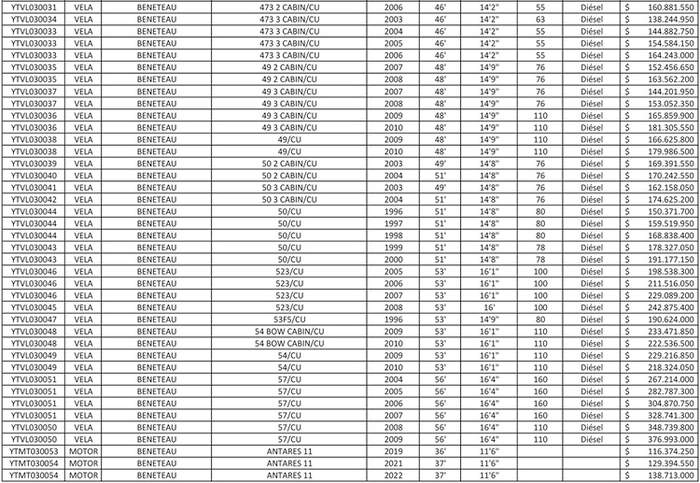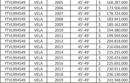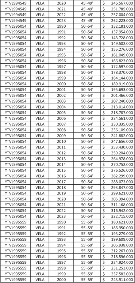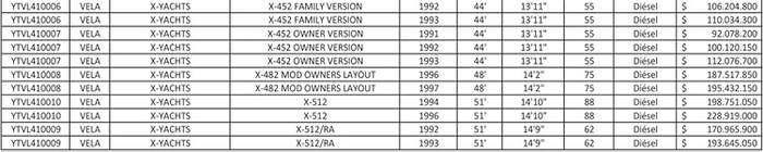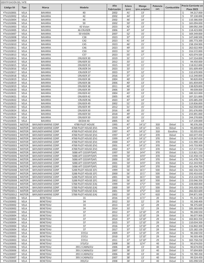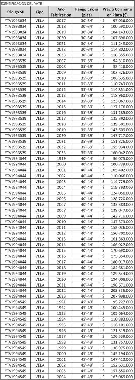 Los siguientes códigos corresponden a precios definidos para valorar los yates según su rango de eslora y año de fabricación.