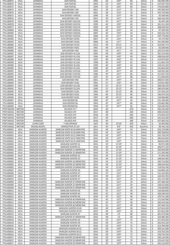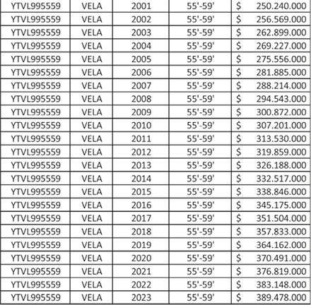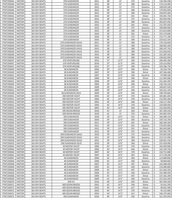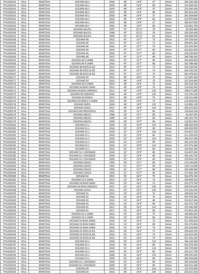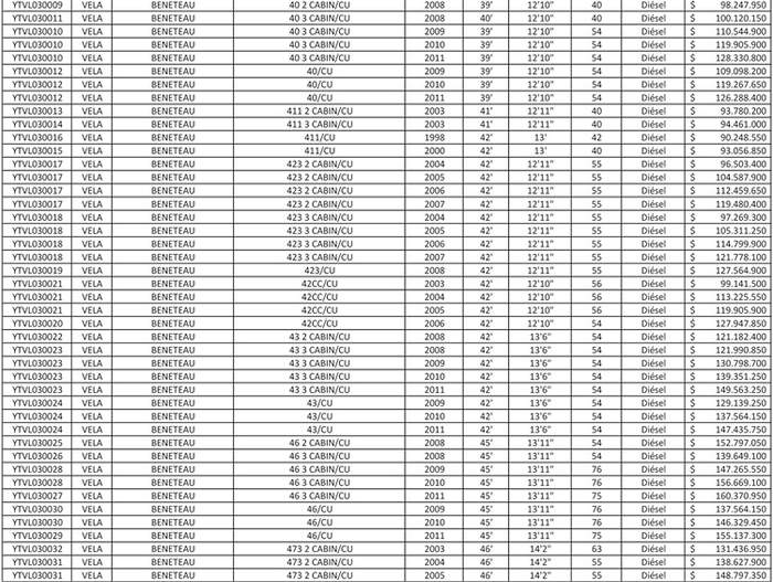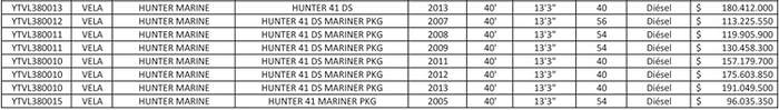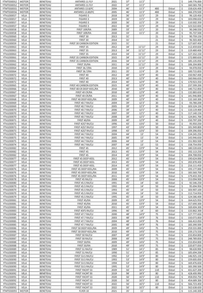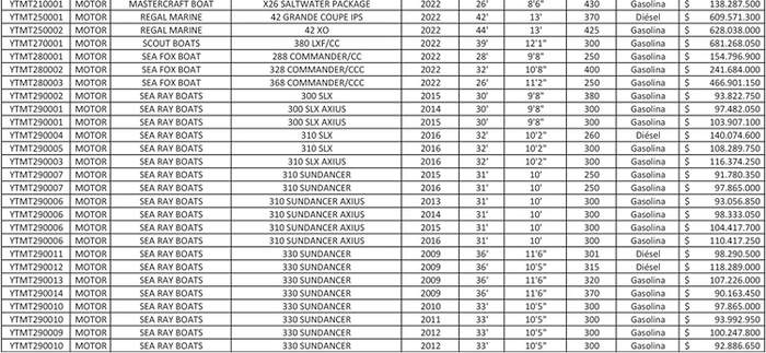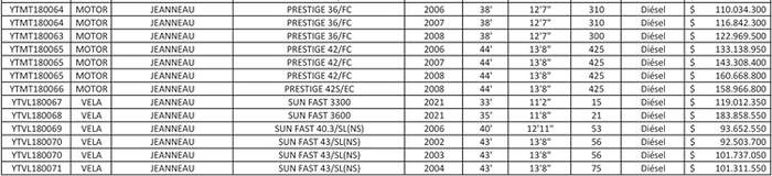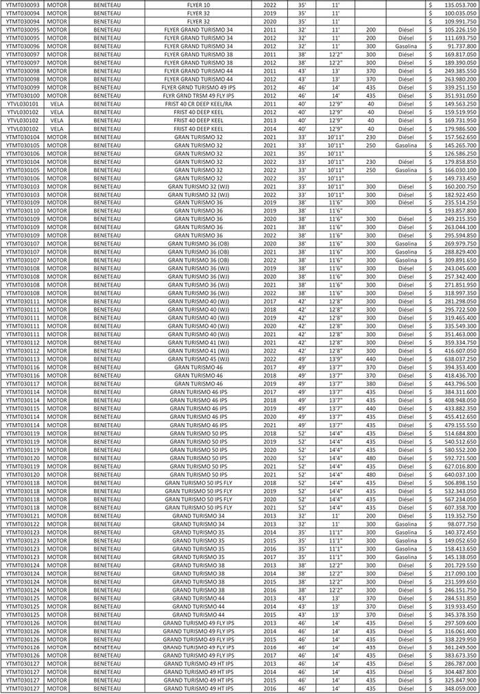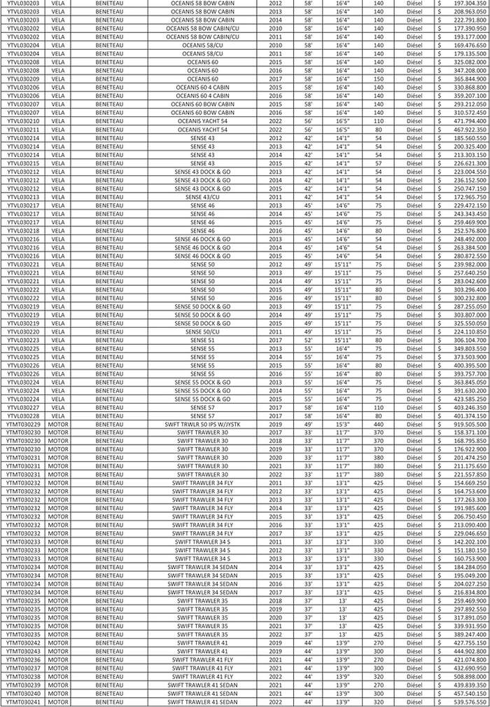 Los siguientes códigos corresponden a precios definidos para valorar los yates según su rango de eslora y año de fabricación.